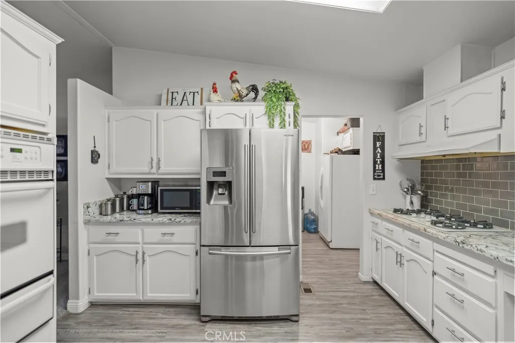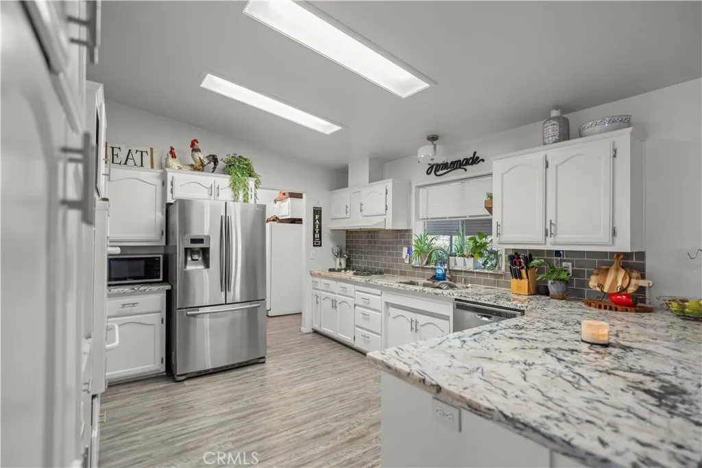 Spacious and beautifully maintained 3-bedroom, 2-bath manufactured home in the desirable 55+ West Hills Mobile Home Park, conveniently located near Highway 99. This home features an open-concept floor plan with a large living area, modern kitchen with granite countertops, white cabinets, and stainless steel appliances. The primary suite offers a soaking tub, walk-in shower, and dual sinks. Enjoy relaxing on the covered patio surrounded by lush greenery or the cozy front porch. Updated flooring, bright natural light, and thoughtful details throughout make this home move-in ready. Community offers a peaceful setting close to shopping, dining, and schools.