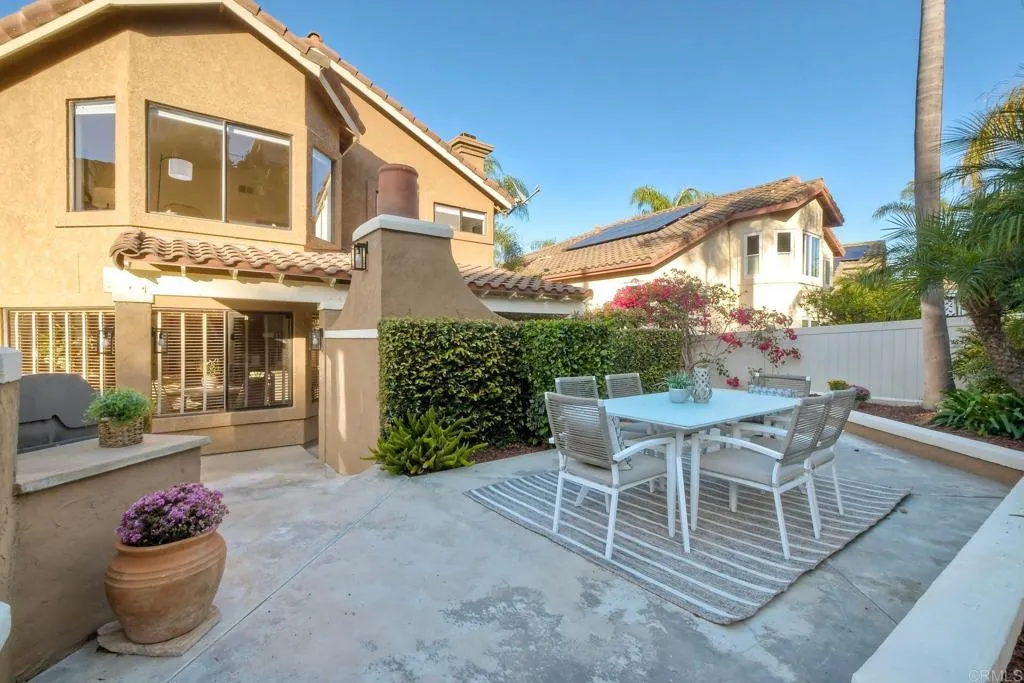 Welcome to this beautifully upgraded home in the desirable Bel Canto community of Rancho Del Oro, where pride of ownership truly shines. This light and bright open floorplan features vaulted ceilings, plantation shutters, newer windows, OWNED solar and an abundance of natural light throughout. The spacious kitchen with gorgeous quartz countertops, premium stainless-steel appliances and an abundance of storage seamlessly flow into the family room, creating an ideal space for entertaining or relaxing at home. The oversized primary suite offers an extended area for peaceful retreats with high ceilings and a spa-inspired ensuite bath with walk-in closet. Step outside to your private resort-style backyard, designed for year-round enjoyment. The custom hardscape with multiple areas for entertaining, built-in BBQ, and tranquil waterfall feature set the perfect stage for outdoor gatherings and quiet moments alike. Enjoy cozy evenings by your outdoor fireplace and feel the extension of the outdoor living. Additional highlights include owned solar and central AC ensuring energy efficiency and savings, as well as an attached 2-car garage and low HOA dues. Situated in a quiet, well-maintained neighborhood close to top-rated schools, parks, and shopping, this home offers both comfort and convenience with timeless appeal. Experience the best of coastal North County livingschedule your showing today!