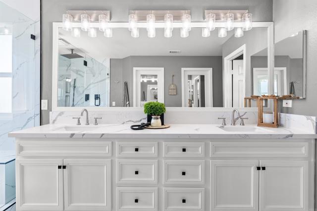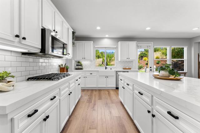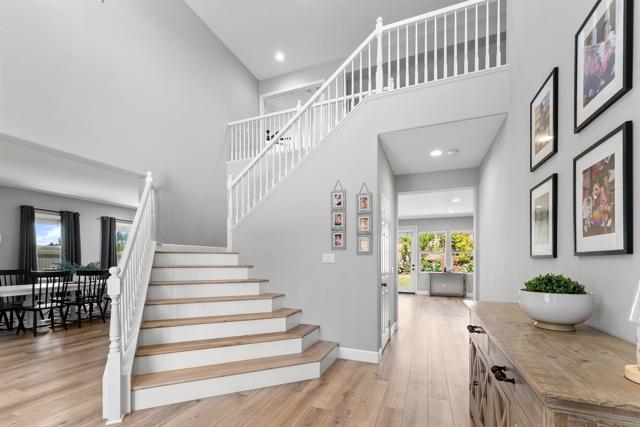 Tucked away in the coveted Olive Hills Estates, this stylishly upgraded home offers modern luxury on an expansive 1/3 acre lot that invites endless creativity. Equipped with solar panels and boasting stunning upgrades that include new flooring, a remodeled kitchen, and a luxurious primary bathroom, this residence seamlessly combines elegance with functionality. High ceilings and abundant natural light create a bright and airy atmosphere throughout a grand flowing open floor plan. The first floor includes an optional office space with French doors to outside, a formal dining room, the chef's dream kitchen that flows into the living room, and an entry level bedroom suite that offers flexibility for diverse lifestyles. Head upstairs and discover the tranquil primary suite with a spa-like bathroom, 2 spacious secondary bedrooms that each have walk-in closets, a study nook, and a versatile bonus loft with a walk-in closet offering the option to convert to a 5th bedroom if desired. The over-sized backyard provides all the extra room to build your dream pool, the privacy of no rear neighbors, and surrounding mountain views. Ample parking and storage are available with a 3 car garage and a long driveway. Conveniently located near Mulberry Park, local schools, scenic trails, and the great features of living in the thriving San Marcos community. If you're looking for space, style, and upgrades, this home checks all the boxes!