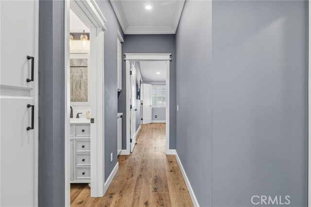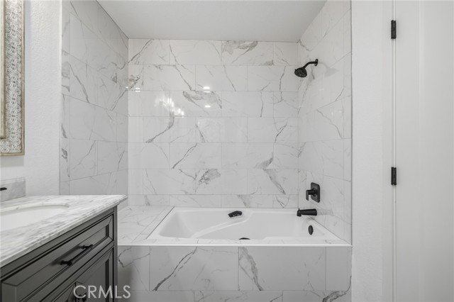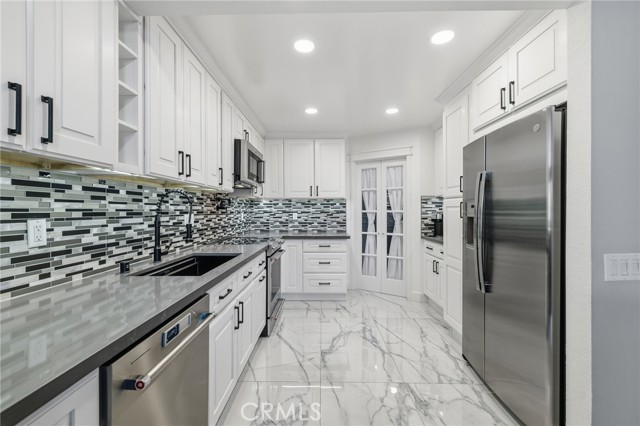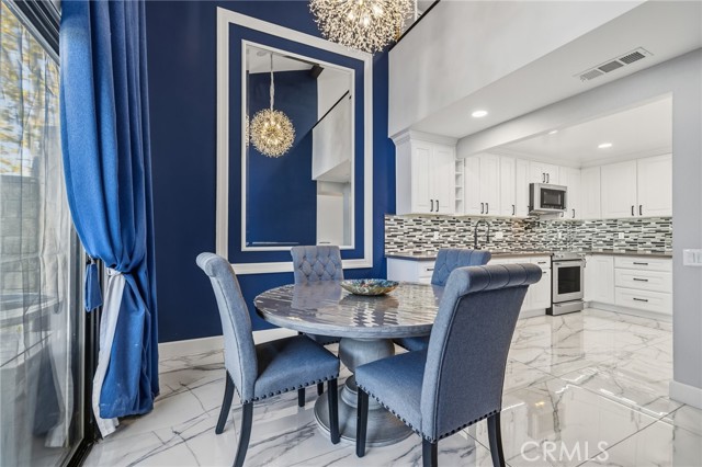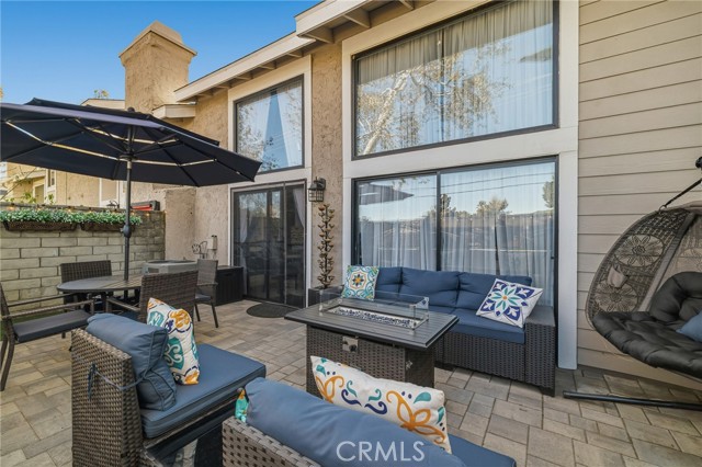 Valencia location in a private gated community, with over 1921 square feet 3 bedrooms and 2.5 baths, where every corner of this home was lovingly reimagined—renovated not just for beauty, but for comfort, intention, and a sense of peaceful luxury. From the moment you step inside, the transformation is evident: a fully renovated, ceiling-to-floor redesign that brought this space to life. The first floor rises with 18-foot vaulted ceilings illuminated by recessed lighting throughout the living areas, creating openness, warmth, and inviting energy. Large-format porcelain tile floors flow across the level, grounding the home with quiet elegance. The newly tiled fireplace adds a calm focal point, while an 8-foot custom dining room mirror enhances light and spaciousness. The kitchen reflects the heart of this renovation. The owners raised the ceiling, added crown molding, and extended shaker cabinets to the ceiling for clean, modern vertical lines. A deep farmhouse sink, Symphony Night quartz countertops, a dedicated coffee bar, all-new appliances, and a meticulously tiled backsplash come together to support cooking, hosting, and everyday comfort. A first-floor bonus bedroom and its accompanying bath also received full renovation, each with porcelain tile flooring and fresh, elevated finishes. The staircase, rebuilt with luxury vinyl, leads to a thoughtfully redesigned second level. The full-sized loft/study features 12-foot ceilings and a skylight that fills the space with natural light. In the hallway, a 9-foot raised coffered ceiling with crown molding demonstrates how intentional design elevates even simple passageways. The second bedroom includes luxury vinyl flooring and sliding-door closets. The second bath features luxury vinyl flooring, a quartz vanity, a cast-iron tub, and 14-foot ceilings with a skylight that softens the room with natural daylight. The primary bedroom continues the elevated feel with luxury vinyl flooring, 12-foot ceilings, and a walk-in closet. The primary bath includes luxury vinyl flooring, porcelain tile, a cast-iron tub, and a marble double vanity, blending durability with timeless beauty. Outside, the owners extended their design vision into a fully renovated patio, creating an outdoor sanctuary ideal for dining, lounging, or unwinding. A brand-new roof, two-car garage, and the serenity of a gated community complete the home’s transformation into a space rebuilt with care, craftsmanship, and heart.