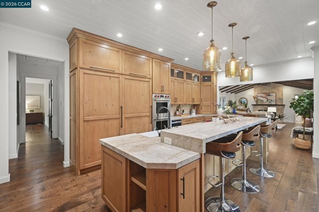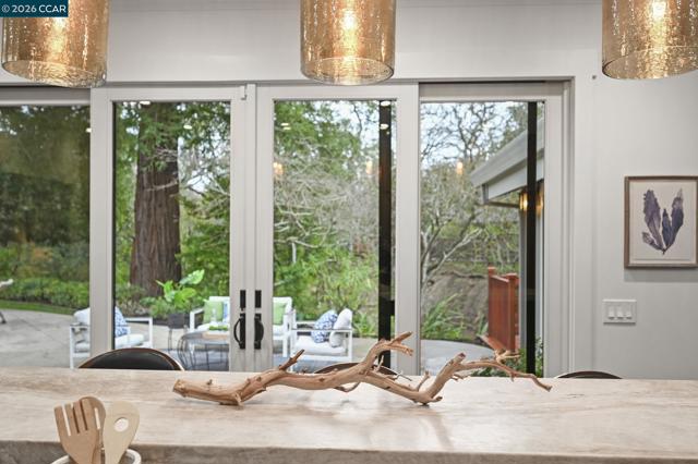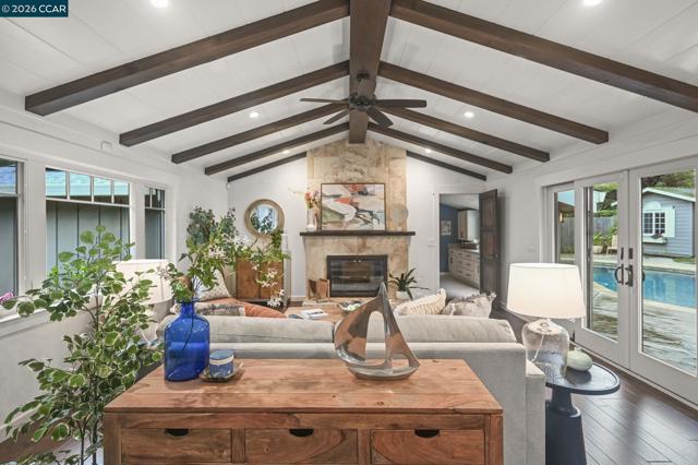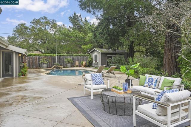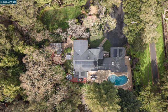 Set in the beloved Burton Valley–Trails neighborhood, this rare gem .86-acre retreat offers a peaceful escape just steps from the Lafayette-Moraga Trail and a stroll or bike ride to Lafayette’s highly acclaimed elementary, middle, and high schools. Fully remodeled in 2017, this turnkey, custom-built home blends comfort, function, and refined design. The heart of the home is a chef’s kitchen with Wolf appliances, quartzite counters, and generous workspace, opening seamlessly to the main living areas. A spacious formal dining room with fireplace and bar is ideal for entertaining, while high ceilings, custom built-ins, designer-chosen paint colors, and engineered wood and tile floors throughout create a timeless, elevated feel. The primary suite features a walk-in closet, custom cabinetry, spacious shower, & direct access to a private sparkling hot tub. 3rd bedroom currently serves as an executive office with Murphy bed, built-in desk, and extensive cabinetry. Outdoors, enjoy a private sanctuary with views of mature oak trees and soaring redwoods, pebble-bottom pool. Add'l amenities: owned solar, whole-home generator, Enjoy detached gym with mirrored wall and separate HVAC. Guests in charming cottage drift off to the soothing sound of the creek—all at the end of private court.