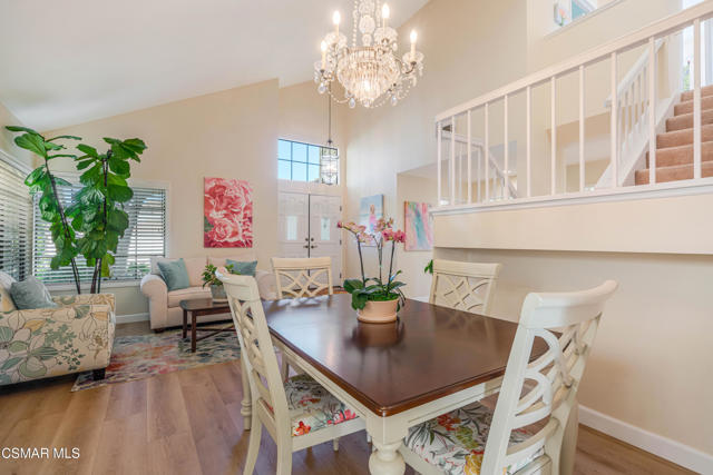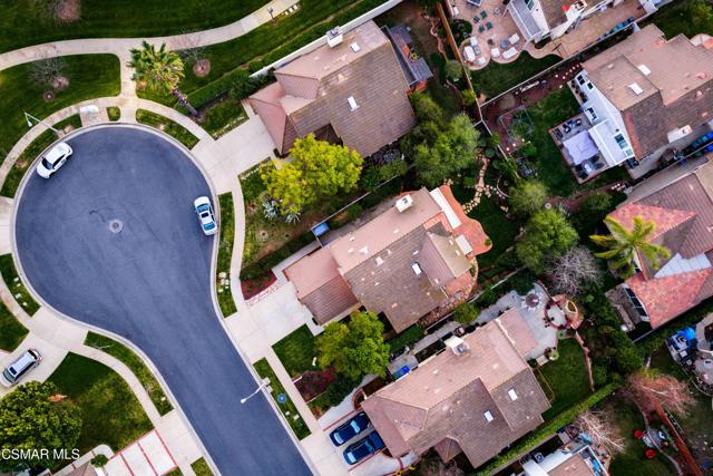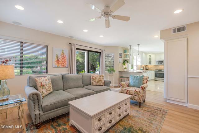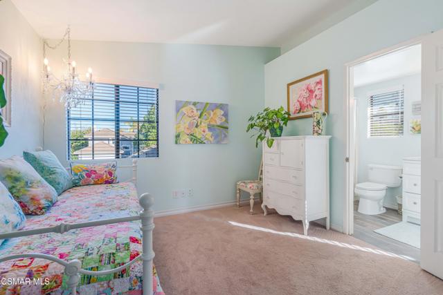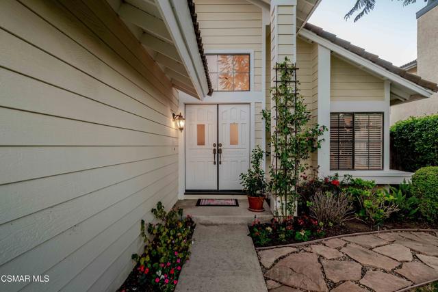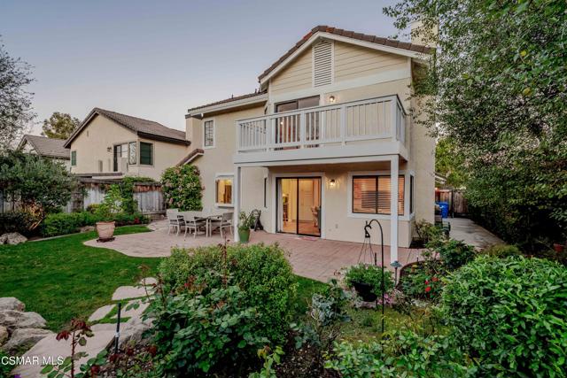 Tucked away on a wonderful cul-de-sac located in the tranquil ''Parkside'' neighborhood of Wood Ranch in West Simi Valley. Light and bright fresh interior paint, abundant windows, skylight, and fresh soft-yellow exterior paint create a warm, cheerful first impression. The downstairs features newer luxury vinyl light wide-plank flooring, a convenient DOWNSTAIRS BED & REMODELED FULL BATH with custom vanity with quartz counter and updated fixtures. The cozy family room with fireplace offers peaceful views of the gorgeous rear garden, while the spacious family style kitchen offers glass-front, neutral-toned cabinetry, granite countertops, and a custom sleek valance over the sink window. Separate living room with vaulted ceilings flows into the adjoining dining area. Upstairs are three bedrooms, including a relaxing primary retreat with vaulted, open-beam ceilings, fresh paint, 2 separate closets (one is a walk-in), and a private balcony ideal for enjoying sunset views. The primary bath includes dual vanities, shower/tub combo, updated fixtures, and a separate toilet room. The outdoor spaces are truly special, with a serene backyard featuring grass areas, stone walkways, stamped concrete patio, and a stunning variety of flowering plants, complemented by equally lush front-yard landscaping. Notable blooms include a large jacaranda tree, camellias, hydrangeas, azaleas, climbing roses, bougainvillea, a flowering cherry tree, and colorful geraniums. Additional highlights include a two-car garage, indoor laundry room, ample storage, roof tune-up with partial underlayment replacement, newer furnace, and low HOA. Ideally located close to Wood Ranch Country Club, parks, the Ronald Reagan Library, shopping, dining, hiking, biking, and more! This lovely home offers a wonderful lifestyle in a highly desirable community.