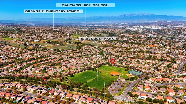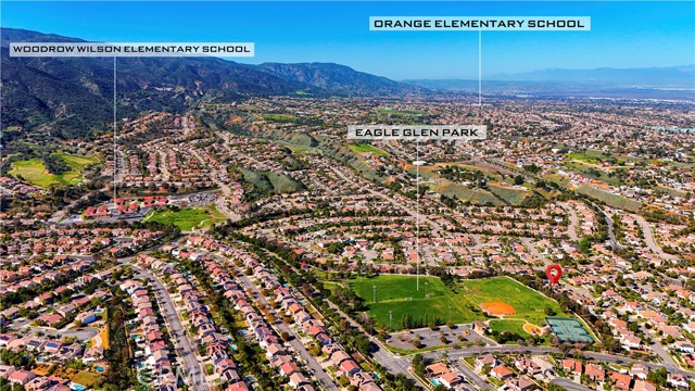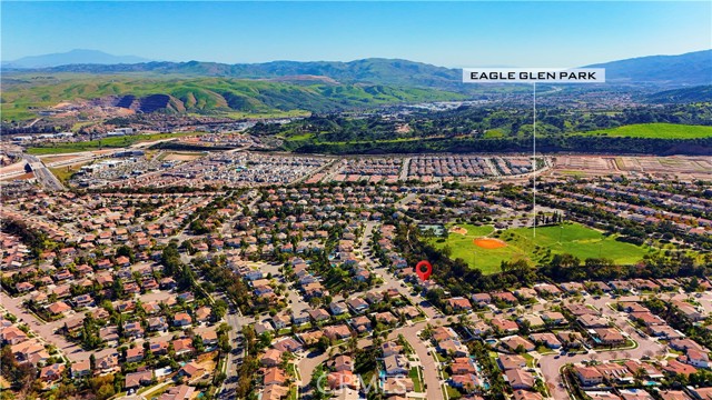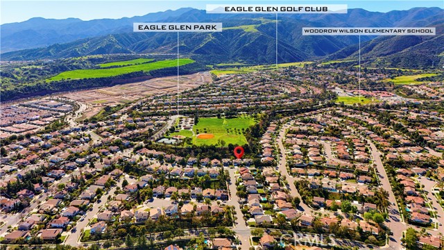 Welcome to this spacious 4-bedroom+One huge office on the first floor, which can be converted into the 5th bedroom, 3-bathroom mountain-view home located in a highly desirable Eagle Glen Corona community. Built in 2000 and offering approximately 2,950 sq ft of living space, this well-maintained owner-occupied residence features soaring high ceilings, a bright open layout, and new flooring throughout the entire home. The modern kitchen is equipped with brand-new appliances and flows seamlessly into the family room, ideal for everyday living and entertaining. A main-level bedroom with full bath adds flexibility, while the private big backyard backs directly to the mountain, no neighbor behind, offering peaceful panoramic views and excellent feng shui. Additional highlights include a newly installed 22-panel solar system (fully paid off), low property tax at approx. 1.2%, and low HOA of only $115/month. The home is within a 7-minute walk to elementary school and zoned for the Top rate school regarded Santiago High School. Community amenities include parks, tennis courts, and a golf course. Conveniently located just minutes from freeways, shopping, dining, Costco, 99 Ranch Market, and an upcoming Whole Foods—this home is an exceptional opportunity for both primary residence and long-term investment.
