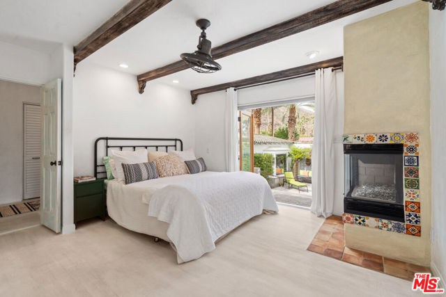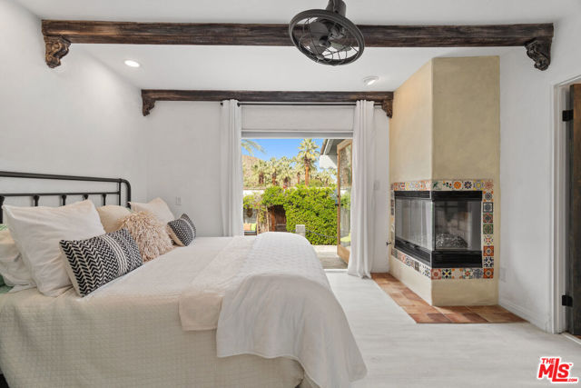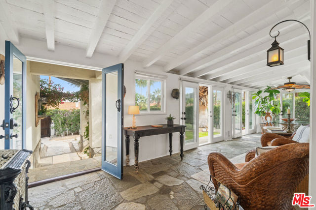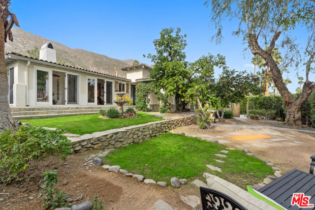 This enchanting circa 1940 Spanish Revival hedged and gated home is sited on a prime 10,000+sf corner lot in the historic Mesa neighborhood of Palm Springs. Surrounded by hillsides of the San Jacinto Mountains, mature landscaping and towering trees, this private architectural retreat features thoughtful hardscaping, beautiful fountains and lush plantings that create multiple inviting outdoor entertaining areas - ideal for al fresco dining, quiet relaxation, or lively gatherings. Spanning over 2,300 square feet, this 3 bedroom & 4 bathroom residence offers an exceptional blend of sophisticated outdoor design and tasteful modern updates. This unique property was used in the filming of the movie, After Dark My Sweet, adding a layer of cinematic history to its timeless character. The expansive eat-in kitchen features a large cooking island, bar seating, concrete countertops, and Spanish backsplash tile; off the kitchen is a cozy lounge with custom tile bar and built-in wine rack. The grand living room is framed by walls of glass and showcases a standout wrap-around enclosed Quartzite stone patio with beamed ceilings, classic fireplace and multiple sitting areas. Graceful arches and abundant natural light enhance the seamless indoor-outdoor transitions. The serene primary bedroom includes beamed ceilings, a tiled fireplace, and French doors that open to the pool area. A spacious bathroom with step-down shower, jetted tub, dual sink vanity and walk-in closet complete the primary suite. The West wing of the house includes two on-suite guest bedrooms that conveniently lead to the private spa and pool area. An impressive Buddha head overlooks the pristine saltwater pool that is complemented by stunning Quartzite stone pool decking, a wet bar with refrigerator, a separate sitting area and elegant dining area. Gated parking for up to 5 vehicles, new 200-amp main electrical panel and other numerous upgrades complete this meticulously maintained property in one of Palm Springs' most coveted foothill enclaves. Property qualifies for short term vacation rentals with city permit. Buyer to verify short term rental status with city guidelines.