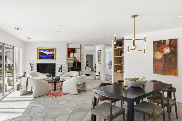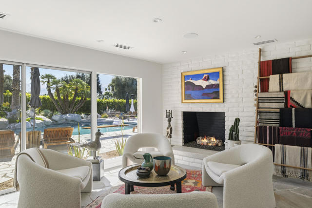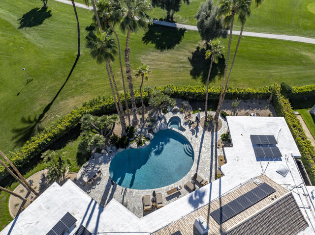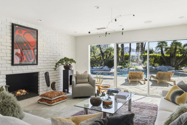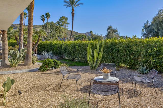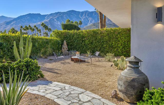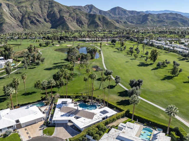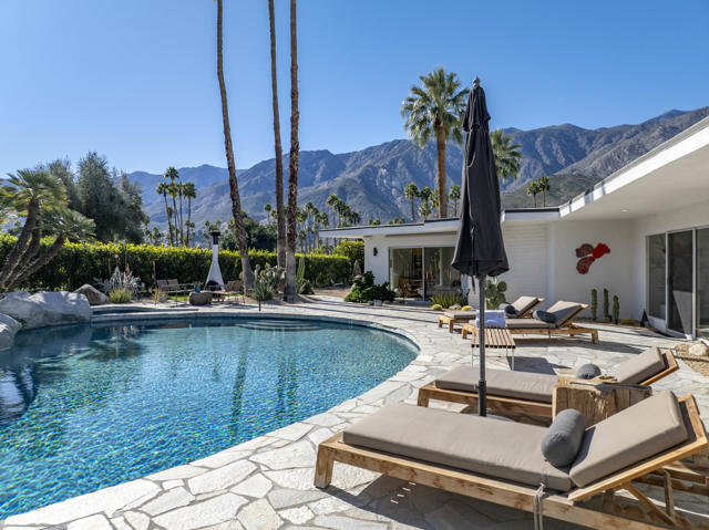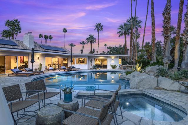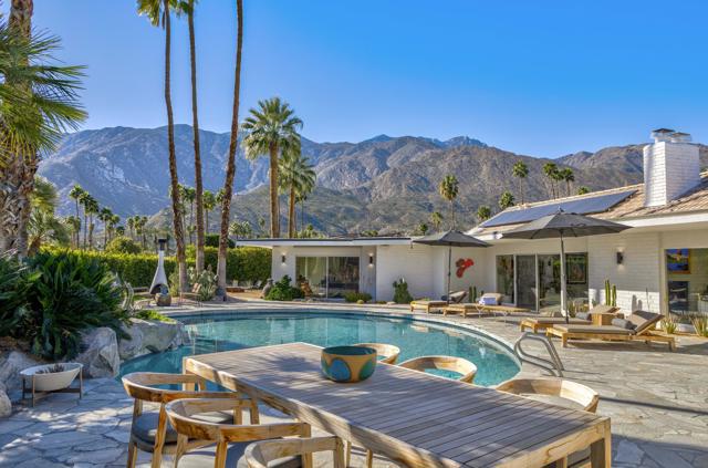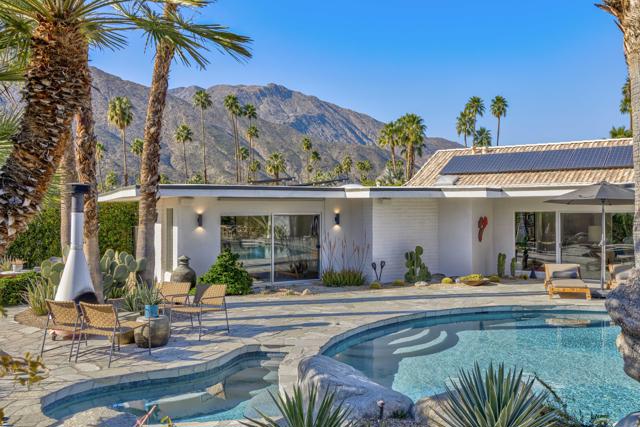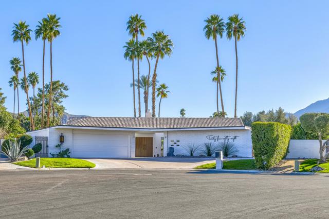 Located on one of only six premium golf course lots in the prestigious Indian Canyons neighborhood of Palm Springs, this stunning mid-century gem -- designed by renowned architect Hal Lacy -- commands sweeping views in a private, resort-like setting. A stone pathway through the front courtyard leads to elegant oak entrance doors, evoking the gracious warmth of this unique home. The low-slung structure comprises two opposing bedroom wings that veer off at 45-degree angles from a central living area, providing excellent separation for the guest and primary suites. It has undergone an extensive and thoughtful renovation, paying homage to the original design while incorporating modern luxuries. Custom white-oak cabinetry, natural stone countertops and slumpstone walls create a consistent design thread throughout the kitchen and bathrooms, and gorgeous natural quartz flooring flows from the interior out to the dramatic pool with unobstructed mountain views from east to west. The gourmet kitchen with a large central island is perfect for entertaining guests while still offering separation from the main living areas. A dining/lounge area and a large formal living room are separated by back-to-back slumpstone fireplaces, adding a dramatic architectural focus to the central entertaining areas. The four bedrooms include an expansive primary suite with a spa- like bathroom, outdoor shower and ample closets, as well as a luxurious guest suite on the opposite end of the home -- both with dramatic views and direct access to the pool area. Updates also include high-end programmable LED lighting, central sound system, a comprehensive pool renovation, dramatic landscaping, an OWNED SOLAR system, EV charger, newer roof, newer HVAC and water heaters, updated electric panel and newer gas lines. This is a truly unique home that helped set the tone for Palm Springs' most famous country club neighborhood.