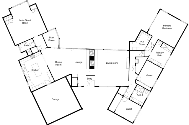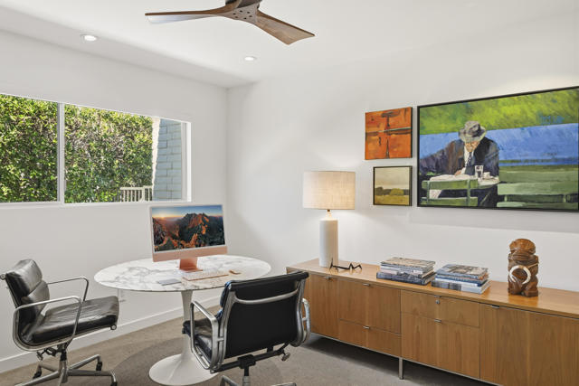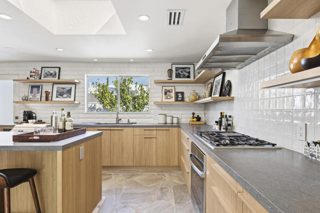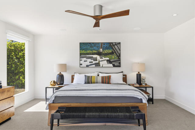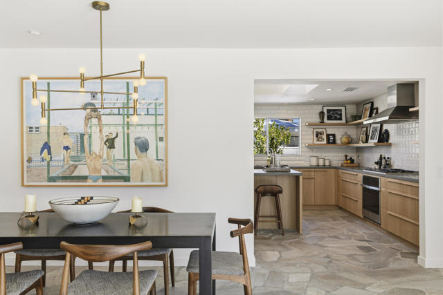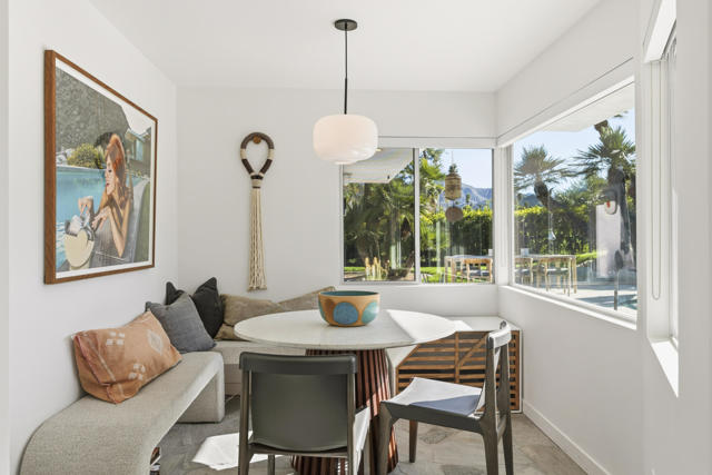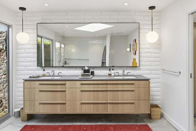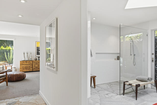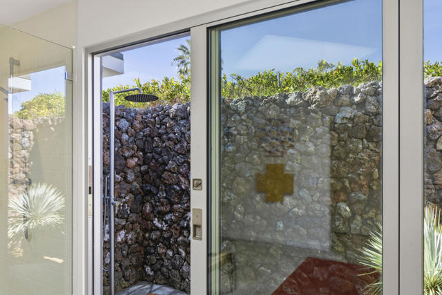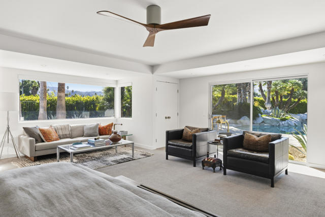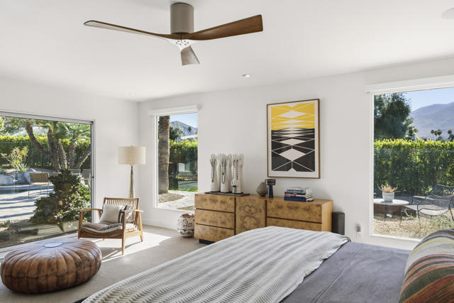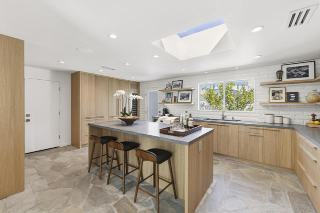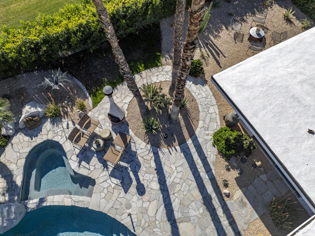 Located on one of only six premium golf course lots in the prestigious Indian Canyons neighborhood of Palm Springs, this stunning mid-century gem -- designed by renowned architect Hal Lacy -- commands sweeping views in a private, resort-like setting. A stone pathway through the front courtyard leads to elegant oak entrance doors, evoking the gracious warmth of this unique home. The low-slung structure comprises two opposing bedroom wings that veer off at 45-degree angles from a central living area, providing excellent separation for the guest and primary suites. It has undergone an extensive and thoughtful renovation, paying homage to the original design while incorporating modern luxuries. Custom white-oak cabinetry, natural stone countertops and slumpstone walls create a consistent design thread throughout the kitchen and bathrooms, and gorgeous natural quartz flooring flows from the interior out to the dramatic pool with unobstructed mountain views from east to west. The gourmet kitchen with a large central island is perfect for entertaining guests while still offering separation from the main living areas. A dining/lounge area and a large formal living room are separated by back-to-back slumpstone fireplaces, adding a dramatic architectural focus to the central entertaining areas. The four bedrooms include an expansive primary suite with a spa- like bathroom, outdoor shower and ample closets, as well as a luxurious guest suite on the opposite end of the home -- both with dramatic views and direct access to the pool area. Updates also include high-end programmable LED lighting, central sound system, a comprehensive pool renovation, dramatic landscaping, an OWNED SOLAR system, EV charger, newer roof, newer HVAC and water heaters, updated electric panel and newer gas lines. This is a truly unique home that helped set the tone for Palm Springs' most famous country club neighborhood.