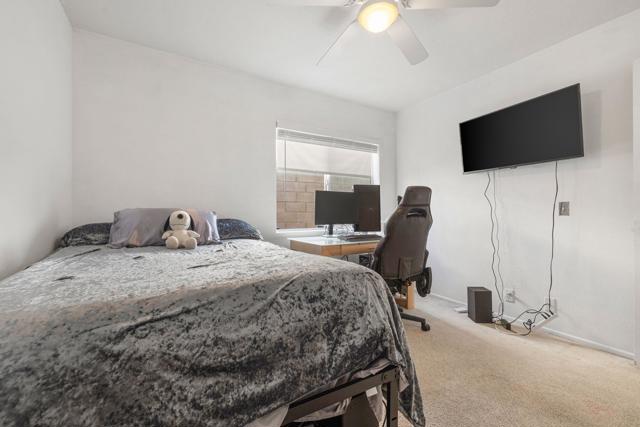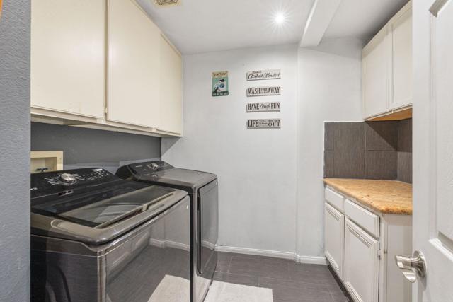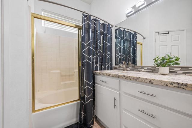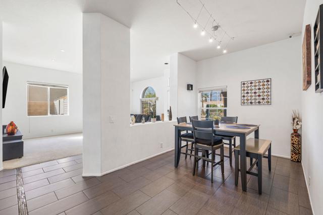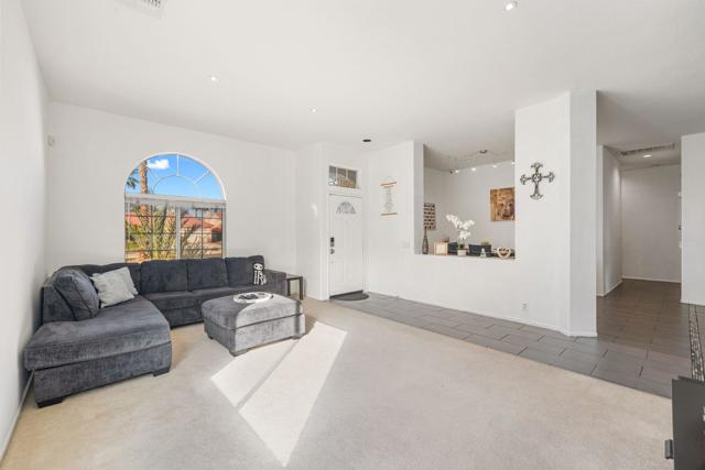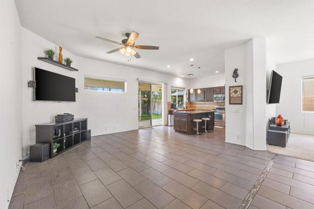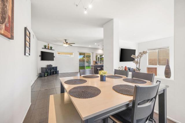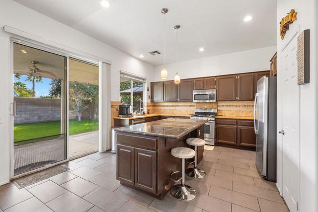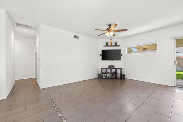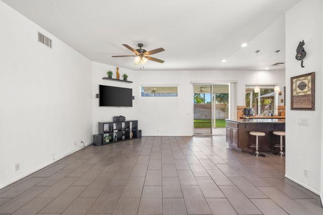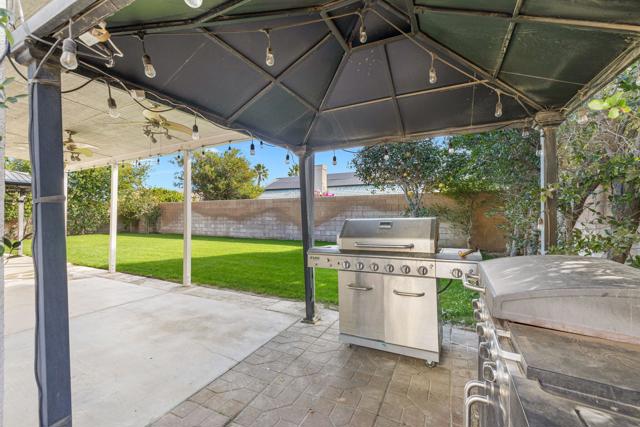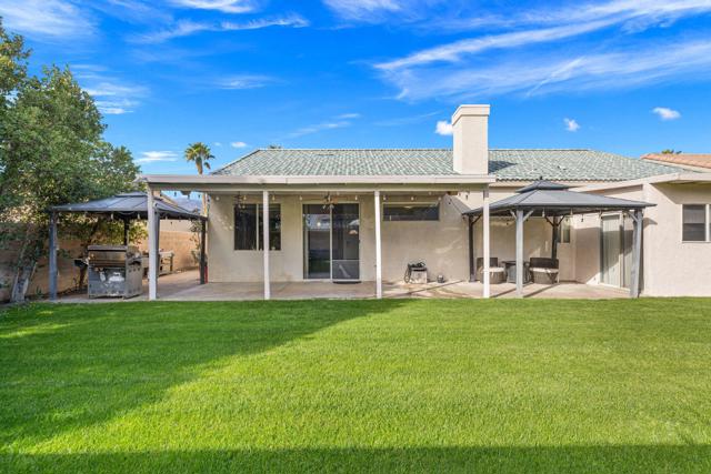 Former La Pasada model home in Cathedral City, set on a quiet, well-kept street with a mountain backdrop and convenient access to Vista Chino, Palm Springs dining and shopping, golf, and the I-10. Strong curb appeal with desert landscaping, a wide driveway, and a covered entry introduces a newer-build feel in an established neighborhood. Rare 3 bedroom, 3 bathroom floor plan plus a true 3 car garage. Inside, the open great room offers vaulted ceilings, recessed lighting, and tile in the main living areas with inviting bedroom carpet, creating an easy flow from living to dining to the kitchen. The kitchen features granite counters, dark cabinetry, stainless appliances, and a center island with seating, plus a sink window overlooking the yard. Sliding doors open to an oversized, private backyard framed by block walls, lush lawn, shade trees, and multiple entertaining zones, including a covered patio with ceiling fan and string lights, a gazebo BBQ area, and a side patio with an outdoor prep sink. The spacious primary suite includes dual sinks, and indoor laundry adds day-to-day ease. A standout opportunity for space, flexibility, and outdoor living in a strong Cathedral City pocket. Great yard for play, pets, and gatherings, with room to personalize your outdoor vision year-round.