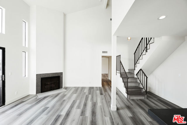 TOP FLOOR 2-story remodeled end unit loft apartment with only one common wall and an abundance of light. 30 feet high ceilings with lots of windows greet you as you enter. New kitchen with stainless steel appliances, quartz countertops and all new cabinetry. The living room has a fireplace and balcony with views of the mountains and tree tops. Huge primary bedroom on the main floor with an extra large walk-in closet and private balcony. Wood laminate floor throughout. 2nd floor has another bedroom and bathroom. Central-AC and lots of extra closet space in the unit. Two side by side parking spots in a gated garage. This is a small 10 unit building in the heart of Valley Glen in Van Nuys. PET FRIENDLY