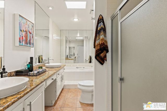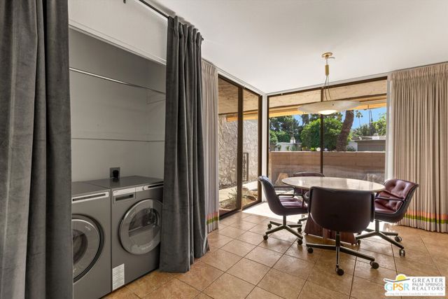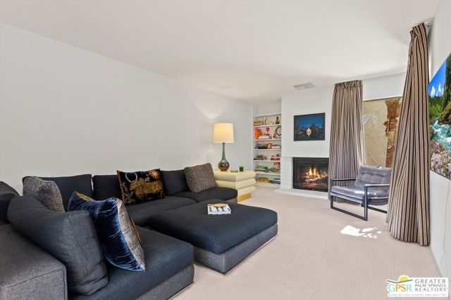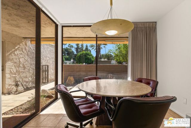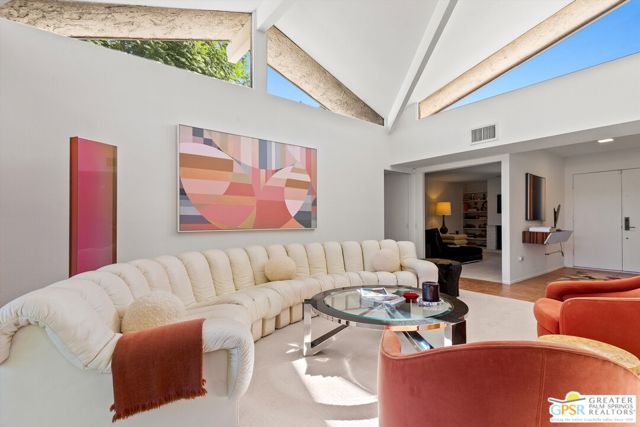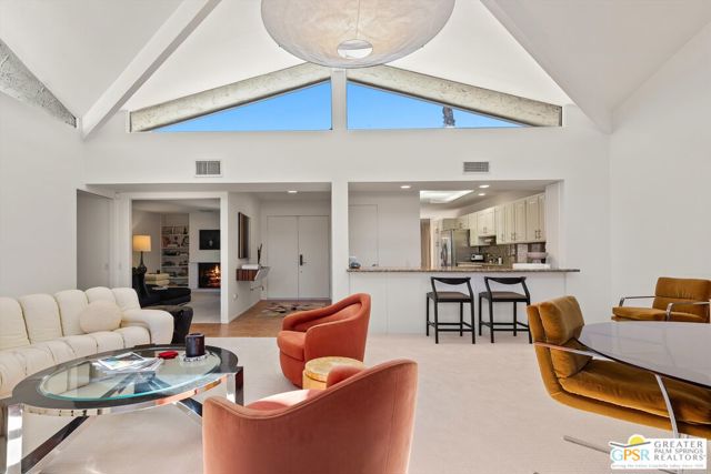 Here's your opportunity to own a piece of pedigreed mid-century history. Noted Palm Springs builder Roy Fey's last project, Mesquite Canyon Estates, offers an iconic William Krisel design reimagined and expanded by architect David Christian. The private enclave includes only 40 homes spaciously sited over 17 acres bordered by the 120-acre Prescott Preserve to the north. A luxurious yet relaxed lifestyle is enjoyed by the homeowners with three sparkling pools and spas to choose from, two tennis/pickleball courts, the new CV Link at the entrance to the community and endless recreational opportunities in the preserve. Homesites are designed to provide maximum privacy paired with bucolic and serene desert and mountain views from front and rear covered patios. Inside, this residence is one of only 14 in the community offering the famous open gable roof design which brings light streaming into the main living/dining area. Indoors and outdoors merge seamlessly with the wall of glass opening to the main patio, offering protected views across the community green belt and into the preserve beyond. The kitchen is open to the great room and includes a laundry center and a spacious south-facing breakfast area with sliders opening to a morning patio. An intimate den with fireplace provides more opportunity for conversation, contemplation and relaxation. The oversized primary suite is at the rear of the home, offering abundant sanctuary with access to the main patio, a walk-in closet, separate cedar closet, and ensuite with soaking tub and separate shower. The guest bedroom has eastern views to the tennis courts and also boasts a spacious walk-in closet. The second bath features a floor to ceiling privacy window which brings light streaming into the home. The garage may be one of the best bonuses - with more than enough room for two cars, a gym, abundant storage space, and an EV charger. Enviable location with easy access to everything one would want for a Palm Springs getaway. This one is a gem.