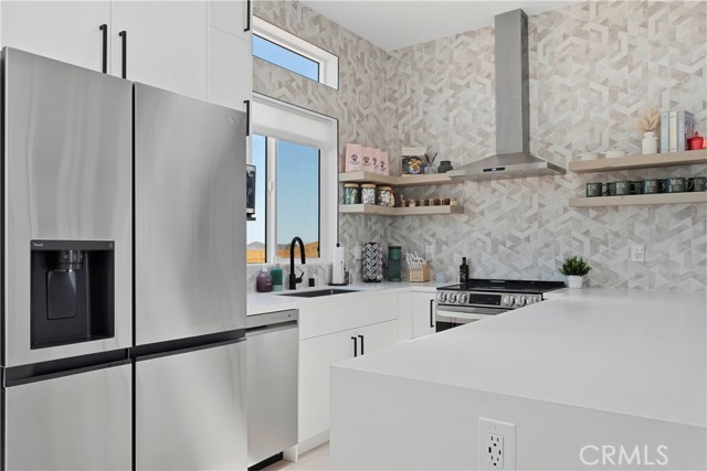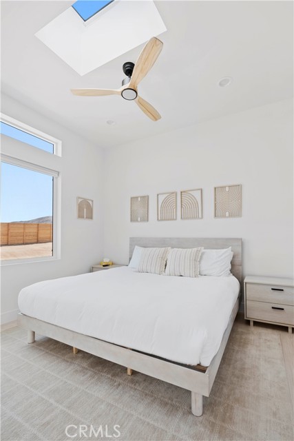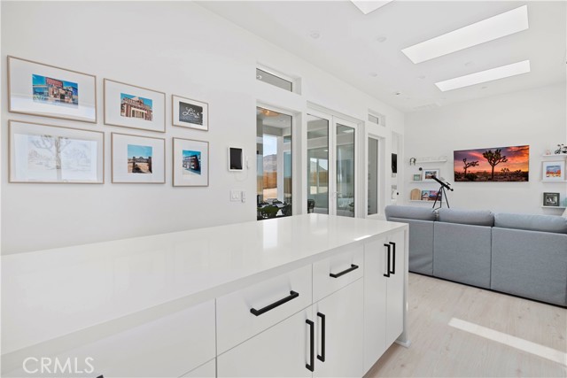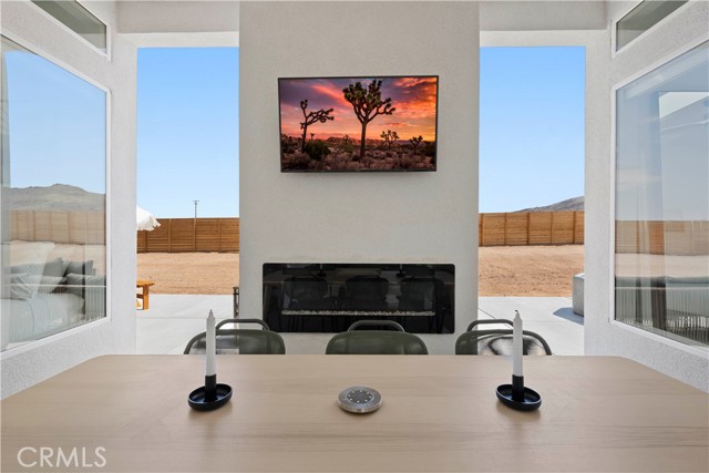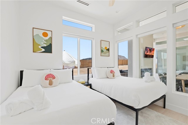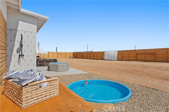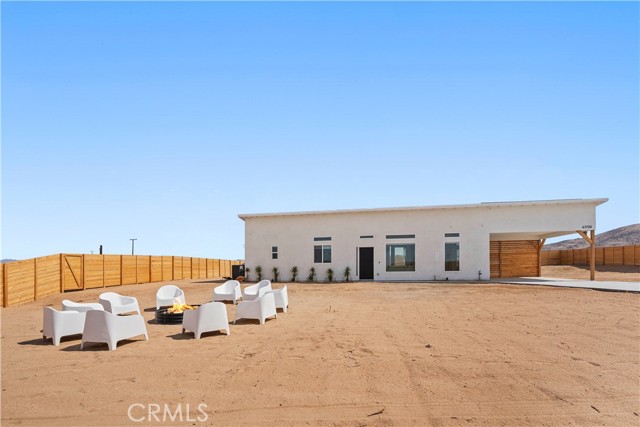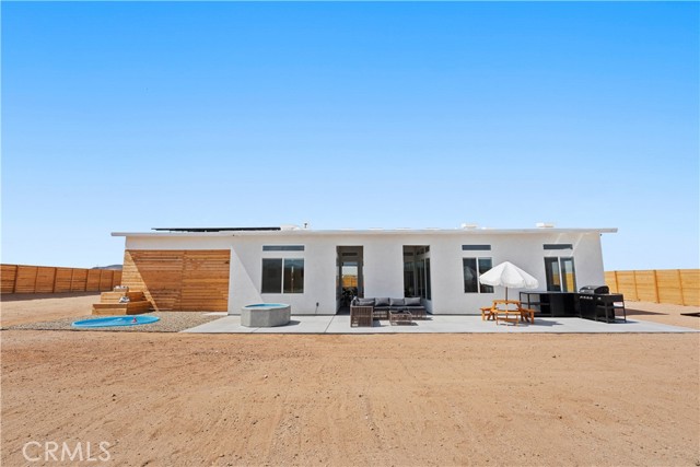 Architect-designed contemporary residence built in 2024, with custom detail throughout. The home features 10-foot ceilings, expansive windows, skylights, and an open floor plan. Interior living space totals 1,043 sq ft, complemented by a California room offering over 110 sq ft of indoor/outdoor dining and living space with an electric fireplace. Set on 2.5 acres, the property provides a rare sense of openness, with approximately one-third enclosed by 6-foot-high fencing for privacy. An automatic gate opens to a concrete driveway leading to an attached carport. Interior finishes include recessed lighting, linear air distribution, and a custom entertainment wall with floating shelving. The kitchen is designed for both function and aesthetics, featuring new stainless steel appliances, a 12-foot peninsula with breakfast bar seating, custom cabinetry extending to the ceiling, open shelving, a vent hood, and tiled accent walls. The home offers generously sized bathrooms with a modern aesthetic, including tile extending to the ceiling and 8-foot glass shower enclosures. The primary suite includes a large private bath with a round soaking tub, glass-enclosed shower with black wall-mounted shower fixtures, ceiling-height tile, and a dual-basin vanity. Bedrooms feature large windows with privacy shades. Additional amenities include a photovoltaic solar system with 15 panels and a Tesla battery capable of powering the home during electrical outages. Exterior features include a concrete patio, an in-ground stock tank pool with a full filtration system discreetly housed beneath a custom wooden bench, and an outdoor rain-style shower. Located in the Hidden River neighborhood, known for architecturally distinctive homes, with convenient access to restaurants, cafés, the farmers market, and Joshua Tree National Park. Property is partially occupied. Please do not disturb occupants.