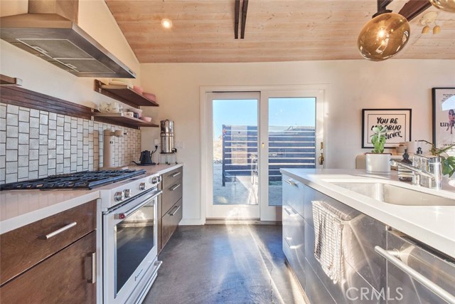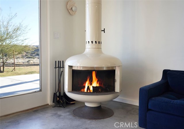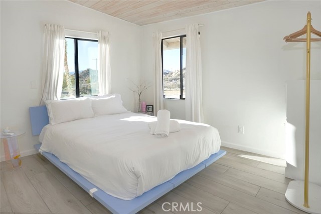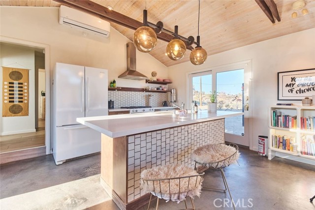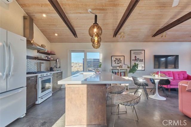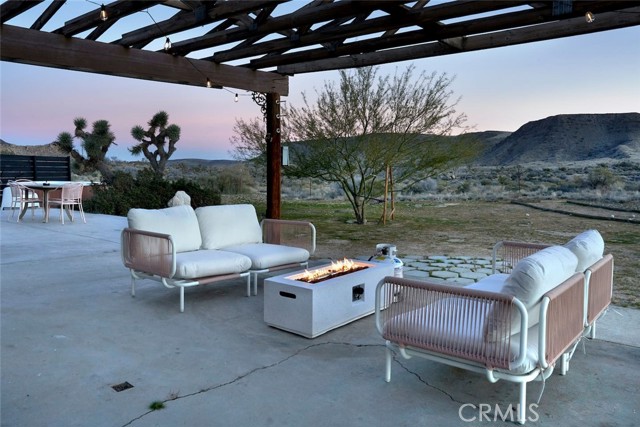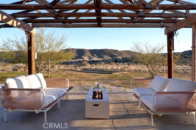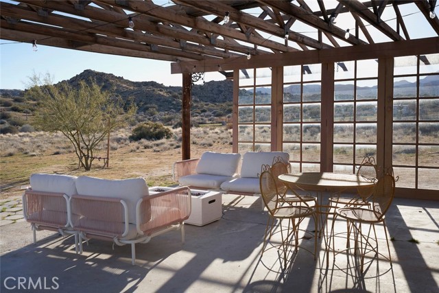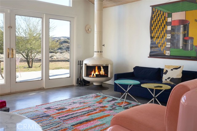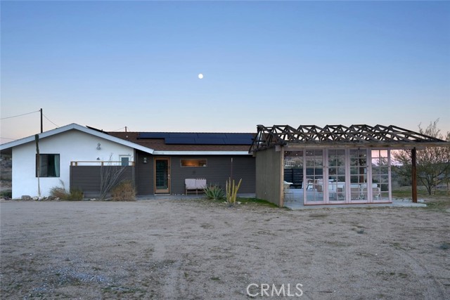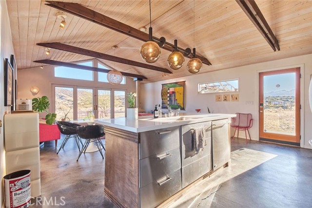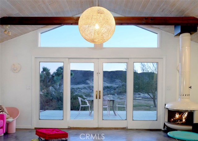 Tucked away in the iconic Pipes Canyon area of Pioneertown, this beautifully remodeled home sits on 1.24 acres and is surrounded by natural beauty, in the distance you see 168 acres of Wildlands Conservancy land to the south—offering endless views and easy access to hiking. Thoughtfully updated, the home features vaulted tongue-and-groove ceilings and a striking mix of custom industrial and designer finishes throughout. The living area is anchored by the French doors and large windows with unspoiled south-facing views of surrounding mesas and a vintage Malm wood-stove, while the kitchen boasts a custom lighting installation over the island, high end appliances and stylish tile backsplash. New mini-splits provide efficient climate control, and dimmers on all lights let you set the perfect mood. The primary bedroom fits a king bed with room to spare and includes a large walk-in closet, while the second bedroom comfortably fits a queen. The clawfoot soaking tub, outdoor shower, cowboy tub, and hot tub invite you to slow down and embrace desert living at its finest. The exterior of the home is clad in smooth stucco and corrugated metal siding, combining durability with a sleek aesthetic. A new solar system (installed just one year ago) provides a surplus of energy and will be paid off at closing, while a private well supplies the water. Think of the landscaping possibilities with no water bill! A detached wood exterior structure with power and water creates filtered light and privacy around the cowboy tub and outdoor dining area. Located on a county-maintained road, just minutes from the shops and restaurants of Pioneertown—including the legendary Pappy & Harriet’s and Red Dog Saloon—and only 20 minutes to downtown Joshua Tree, this stylish desert home is the perfect blend of design, privacy, and prime location. Welcome to your high desert hideaway.