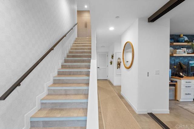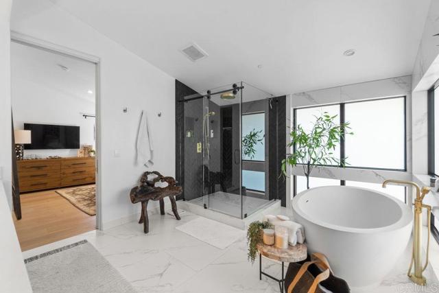 Experience elevated coastal living in this designer-curated, fully furnished luxury townhome--located just one block from the pristine beaches of Carlsbad and offered fully furnished and fully equipped. Built in 2017 and extensively remodeled in 2021 with premium materials, custom upgrades, and meticulous attention to detail, this lightly lived-in residence delivers an effortless, move-in-ready lifestyle that appeals to the discerning buyer who values both style and convenience. Perfectly positioned to capture ocean breezes without the heat of direct afternoon sun, the home offers a rare combination of comfort, privacy, and modern sophistication in one of North County's most desirable coastal corridors. The entry level features direct access from the attached two-car garage, along with two spacious bedrooms and a full bath. On the main level, soaring ceilings and picture windows bathe the space in natural light. A sleek fireplace, Cantina doors for seamless indoor-outdoor flow, recessed lighting, and a glass-accented staircase add architectural drama to the main living space. The second floor has primary bedroom and guest bathroom. On the third floor you will find the second primary bedroom with ocean views This primary bathroom has a beautiful standalone tub and shower and a large built-in closet.