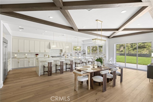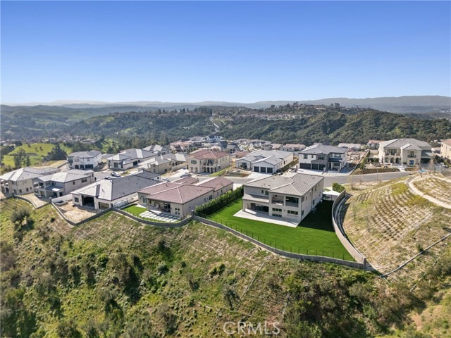 A masterfully crafted new-construction estate, perched canyon-side with commanding, unobstructed vistas that stretch across rolling hills and protected Cleveland National Forest land. Located within the exclusive, gated Saddle Crest enclave, this Willow Residence offers the rare combination of architectural sophistication, privacy, and breathtaking natural beauty. Spanning approximately 5,409 square feet, this stunning two-story home showcases five bedrooms plus a loft, five full bathrooms and two powder rooms, and a dedicated study, all finished with a curated selection of elevated materials and bespoke details. Wide-plank hardwood flooring flows throughout, beginning at a dramatic entry with herringbone wood floors and soaring two-story ceilings. The living room is anchored by a striking floor-to-ceiling stone fireplace with custom integrated built-ins, complemented by beamed ceilings and expansive walls of glass that frame the home’s extraordinary hillside and canyon views. The refined chef’s kitchen features an oversized waterfall marble island with breakfast bar, extensive custom cabinetry, a six-burner professional range with griddle, dual ovens, and sprawling marble countertops, perfectly positioned to serve the adjacent spacious dining room. Seamless indoor-outdoor living defines the home, with a covered loggia and California Room extending from the great room, ideal for entertaining or quiet evenings overlooking the landscape. The primary suite is a true retreat, offering a private viewing deck, tranquil seating area, and a spa-inspired bath with stone walk-in shower, a freestanding soaking tub, and a makeup vanity, set against serene canyon views. Outdoors, the lush, expansive backyard opens to endless canyon and hillside vistas, enhanced by the home’s end location with only one direct neighbor, delivering exceptional privacy. A four-car garage completes the residence. Ideally situated off Santiago Canyon Road, Saddle Crest offers a peaceful, resort-like setting that feels worlds away yet remains conveniently close to Orange County’s finest destinations. This is elevated new construction living where luxury, privacy, and panoramic views converge.