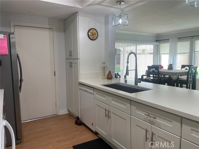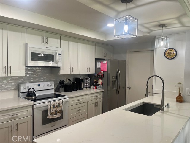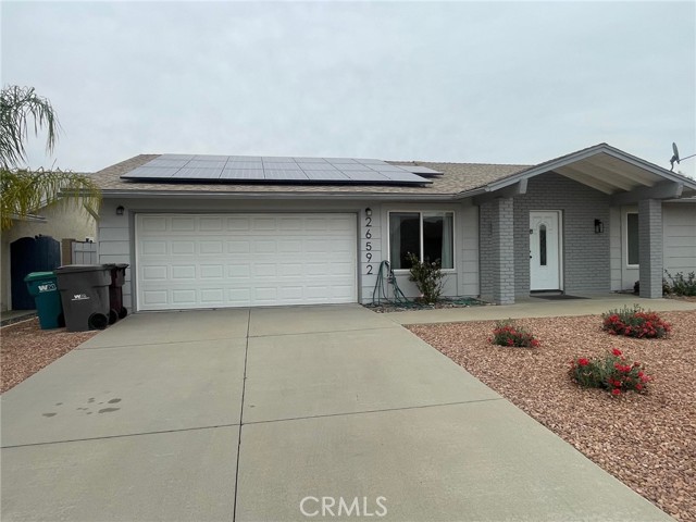 Welcome to easy, elegant living in this beautifully remodeled single-story home located in a desirable 55+ senior community. Designed for comfort, convenience, and efficiency, this move-in ready residence offers modern upgrades and spacious living areas perfect for relaxing or entertaining. Step inside to find attractive laminate flooring and dual-paned windows throughout, creating a bright and energy-efficient environment. The thoughtfully updated kitchen features crisp white shaker cabinetry, sleek quartz countertops, a large stainless steel sink, and ample prep space—ideal for everyday cooking and hosting family and friends. The home offers both a formal living room and a separate family room, providing flexible space to suit your lifestyle. The generously sized primary bedroom includes two closets and electronic window shades for added comfort and privacy. The secondary bedroom features a walk-in closet, making it perfect for guests or a home office. Both bathrooms have been tastefully remodeled with white shaker-style vanities, white countertops, and tile flooring, delivering a clean, timeless finish. Additional highlights include a direct-access two-car garage for convenience and storage, as well as an expansive backyard designed for low-maintenance enjoyment. The backyard features a covered patio, artificial turf and beautiful palm trees, creating a private, resort-style setting ideal for outdoor relaxation or entertaining. This all-electric home is powered by 22 fully paid off solar panels, providing exceptional energy efficiency and long-term savings. Enjoy the best of active adult living in a welcoming 55+ community with a home that truly has it all—style, comfort, and sustainability. Sun City Civic Association is truly resort style living with many amenities. Check out their website at www.suncitycivic.com for more information.