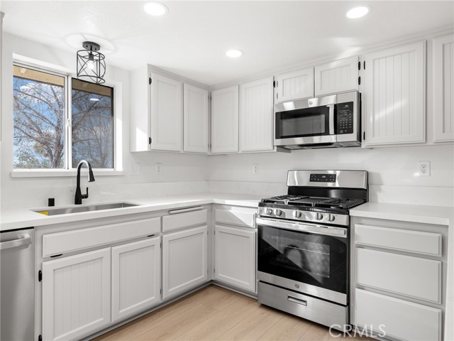 Freshly renovated 3 bedroom 2 bath frame home in Phelan offering 1,248 square feet of living space. On the outside the home has been updated with all new exterior siding, exterior paint and fixtures. The home has been completely refreshed inside with new laminate wood flooring throughout with carpet in the bedrooms, new interior paint and baseboards and new fixtures. The kitchen has newly painted cabinets with new quartz counters and new stainless steel appliances. The bathrooms both have new vanities, new fixtures and each of the tubs have been reglazed. There is paid off solar on the home to the benefit of the new owner. The land has mostly natural vegetation which makes for a park like setting and there is a storage shed in the front which was painted to match the house. The home sits on 2.3 acres of fenced property, zoned for horses, located close to pavement, and located within the Snow Line School District.