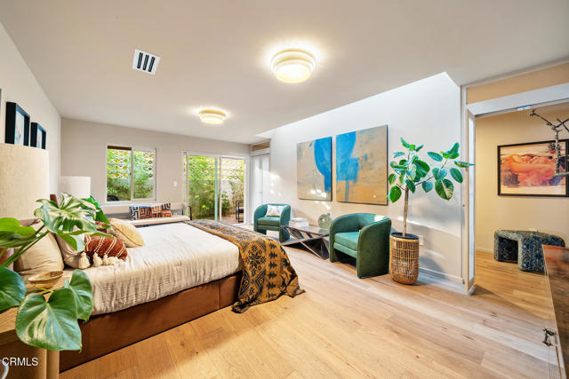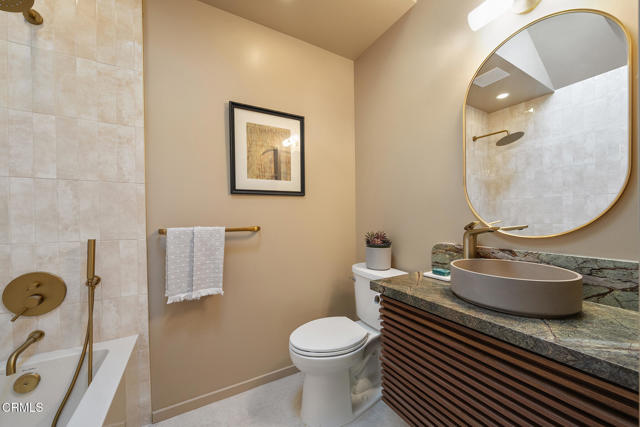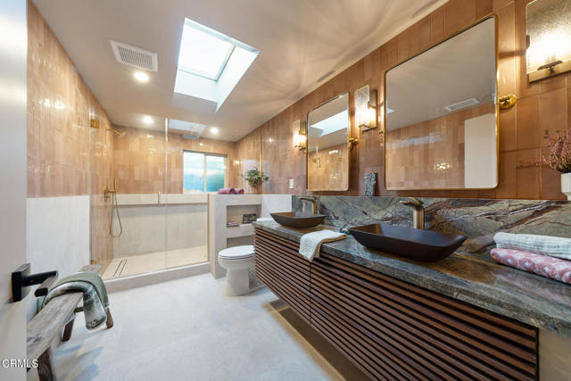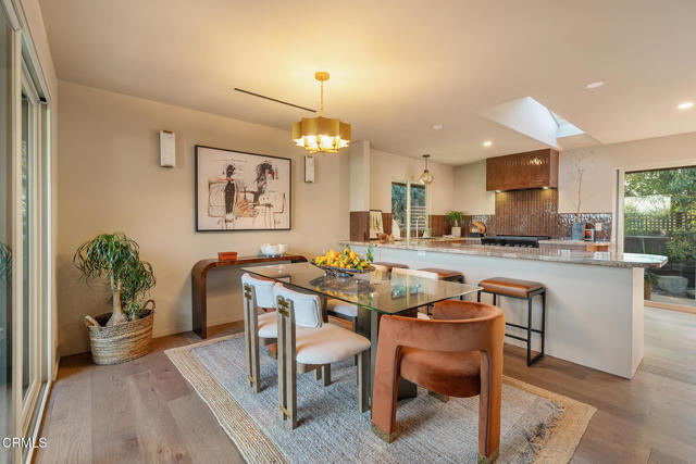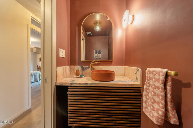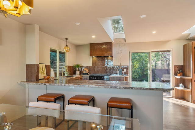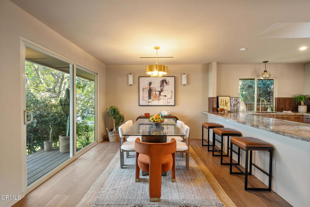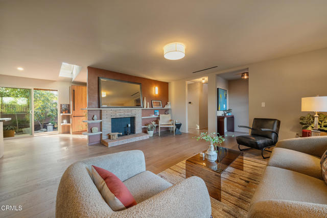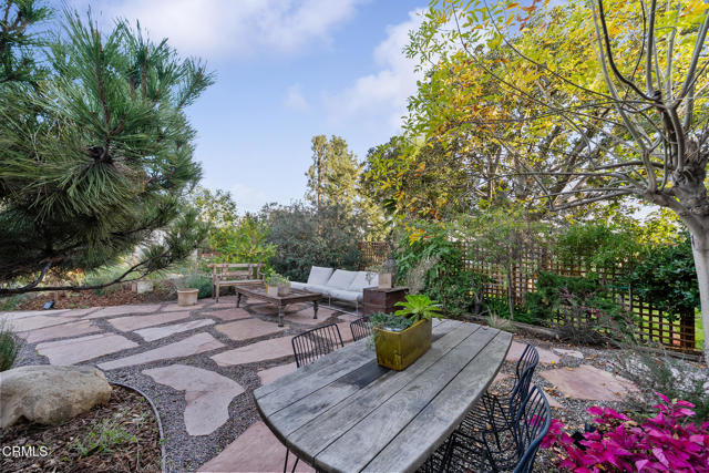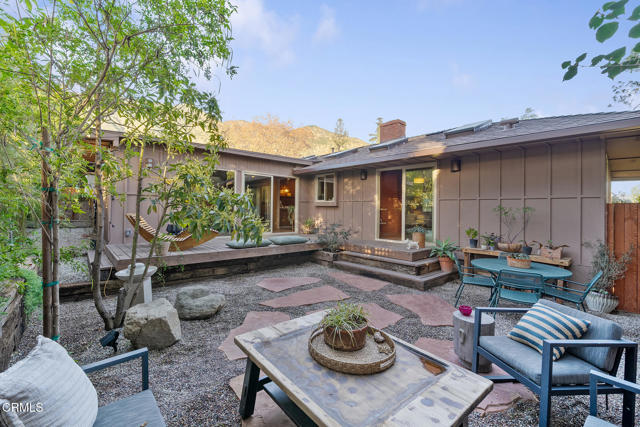 Nestled on a quiet cul-de-sac, this fully reimagined mid-century gem blends timeless character w/ modern comfort & effortless flow. The inviting walkway leads to the front door that opens to a welcoming foyer introducing a warm, contemporary layout accented by luxurious finishes. The living room is centered around a Roman clay fireplace wall, flows naturally into the adjacent dining area, w/ a large sliding glass door leading to the serene front garden & deck, creating a natural indoor-outdoor connection. The beautifully remodeled kitchen opens directly to the expansive rear deck & patio. Extra-long in layout, the kitchen is appointed w/ striking Brown Forest marble counters, intricate tile work, a cozy breakfast area & built-in coffee & beverage bar--perfect for casual dining & entertaining. A central hallway leads to the private sleeping quarters, where a designer powder room & a skylit laundry room w/ marble counters enhance everyday functionality. Two bedrooms w/ tranquil garden views share a remodeled hall bath, while a junior suite enjoys the privacy of its own en-suite bath, a sliding door opens to the serene rose garden, & a charming hidden bookcase door reveals a flexible space w/ a separate entry--offering exciting potential for conversion to a junior ADU, private office, or creative studio. The spacious family room showcases expansive windows & a sliding door that entice one to the enchanted rear deck & patio, creating a relaxed gathering space that serves as the true heart of the home. Beyond the family room, the tranquil primary suite is truly a personal sanctuary; featuring a generous dressing room w/ a custom closet system, & a private patio that provides an intimate outdoor haven--perfect for meditation or 'quiet me time.' The spa-inspired primary bath offers a soothing escape, appointed w/ Green Forest marble counters, frosted glass sinks, & a luxurious walk-in shower. The exterior grounds are designed as a series of outdoor zones, including a vegetable garden, a fire pit lounge, grassy play area, & an artfully designed California water-wise garden. Mountain views provide a picturesque backdrop, while the brand-new custom-designed driveway & two-car garage add everyday convenience. This exceptional property offers rare combination of space, privacy, and versatility, embodying the best of So-Cal living with Sierra Madre's small-town charm, where indoor comfort & outdoor beauty come together in perfect harmony.