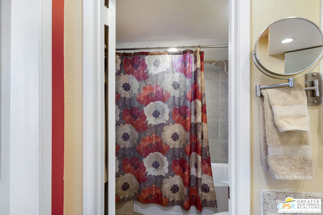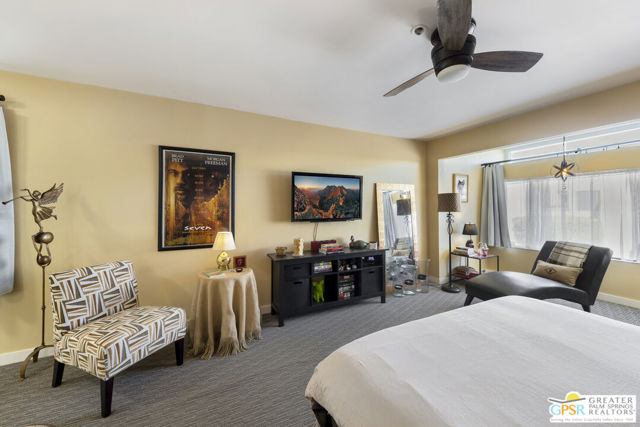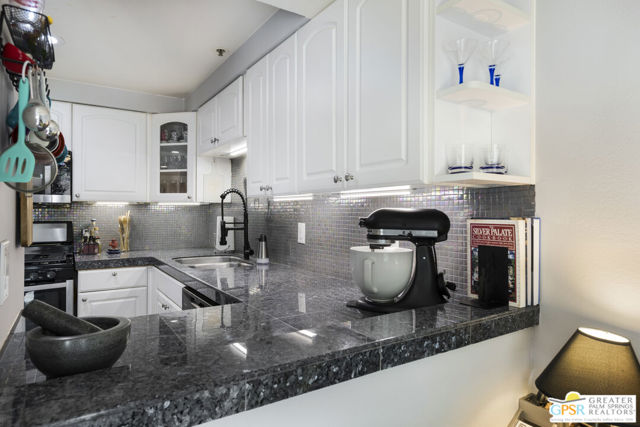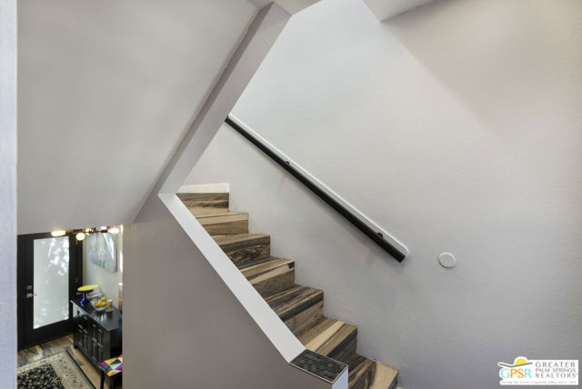 Wonderfully appointed 2 bedroom, 2 bath condo in the infamous Village Racquet Club in Central Palm Springs. 4 levels of space and privacy abound, starting with a gourmet kitchen on the ground floor, as well as a formal double door entry, spacious dining area and a breakfast nook/sitting area which opens to a walled patio. The next level has a guest bedroom and a 3/4 bathroom. At the top of the stairs to the next level is a bar area, which opens up into a large living room anchored by a fireplace. There is also an outdoor balcony on this level. The top level hosts a huge Primary bedroom and bathroom, and a roomy walk in closet, as well as a window alcove/retreat area. Great location, downtown Palm Springs is a stone's throw away! The complex features many amenities including racquet ball, tennis, a clubhouse, fitness center, and 8 pools and spas. Upgrades and replacements include: washer and dryer (2019), refrigerator (2025), stove (2019), microwave (2025), and garbage disposal (2024). Tile floor was installed in 2020, carpet in 2020, fireplace remodeled in 2023. HVAC replaced in 2023, ceiling fans installed in 2023. LED can lights in 2024. chandeliers in 2023, Primary bath fixtures/tib/sinks/vanity in 2023, double front doors at ground level in 2024, ground level patio slider doors/screens in 2024, Primary bedroom window in 2024, upper hallway window in 2022, new paint in 2022, all baseboards in 2022, all door knobs in 2022 and Guest bath fixtures/sink/toilet in 2022.