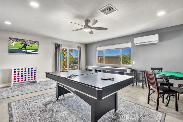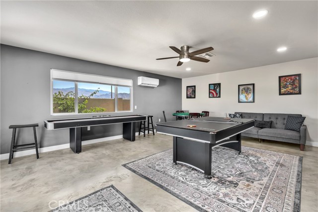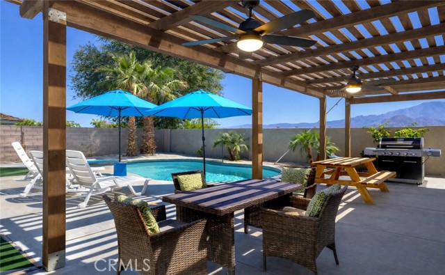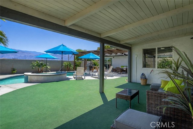 Remodeled single-story residence located in one of North La Quinta’s established pride-of-ownership neighborhoods. This 2,948 sq ft mid-century modern home offers a well-balanced combination of architectural character, modern updates, and mountain views. The interior features a bright, open layout with raised ceilings and a concrete overlay flooring system that provides a clean, modern aesthetic along with energy efficiency. The remodeled kitchen is designed for everyday living and entertaining, featuring quartz countertops, stainless steel appliances, a large center island, and updated cabinetry. Recent improvements include remodeled bathrooms, a newer roof, HVAC system, water heater, windows, doors, exterior stucco, and a circular concrete driveway. Renovations were completed with permits. Outdoor living is centered around a recently built saltwater pool and spa with mountain views, along with an outdoor shower, covered lounge area with ceiling fans, and a turf putting space. The backyard offers ample room for relaxing, dining, and entertaining. Conveniently located near parks, sports facilities, CV Links, golf, desirable schools, shopping, and dining, this property offers a rare combination of scale, modern updates, and outdoor living in an established neighborhood.