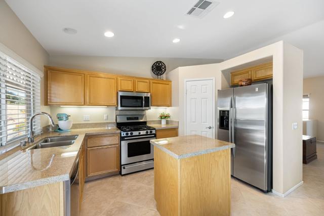 The ultimate in desert living begins here within the gates of Monticello ll in Indio. This beautifully maintained home features 3 bedrooms including primary suite, 2 baths, dining area, light and bright kitchen with Morning Room and South-facing entertainment patio. The large, custom-designedpool with spa and spillway is perfectly positioned to enjoy the view of the distant Mountains and palm trees that surround the area. Upgrades withinthe home include 18-inch diagonal ceramic floor tile, Plantation Shutter Doors in kitchen and primary, custom blinds, granite countertops andstainless appliances. A newer heat pump and AC system offers comfort and efficiency, plus an attic fan that activates during extreme heat to assistin whole-home cooling and lowering power usage. Pride of ownership is evident throughout this 1,500 sq. ft. home that boasts style, comfort, functionality and resort style living.