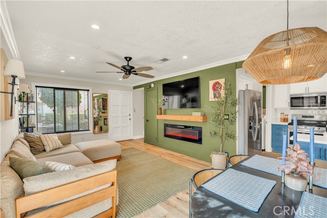 Experience the perfect fusion of style and comfort in this beautifully upgraded two-story home located in the highly sought-after Anaheim Hills community. With a modern aesthetic that feels like it’s straight from a magazine, this residence impresses from the moment you enter. Inside, the stylish design features a stunning wood wall that adds character to the living area, complemented by elegant wainscoting in the hallway for a touch of sophistication. The dining room is highlighted by a chic light fixture, making it ideal for intimate meals and lively gatherings. Enjoy the benefits of a brand new AC system and fresh flooring throughout, creating a clean and inviting atmosphere. The kitchen is a chef's dream, boasting luxurious quartz countertops and a new dishwasher that makes cooking a pleasure. A dedicated indoor laundry area adds to the home's convenience. The living room is enhanced with recessed lighting and a stylish electric fireplace, providing a warm and welcoming vibe. The primary suite features a recently installed custom closet that maximizes storage efficiency, ensuring every inch of space is utilized. Step outside to a genrerously-sized, low-maintenance backyard adorned with lush turf, perfect for entertaining or enjoying peaceful evenings under the stars. This home also includes a two-car garage that is attached through the backyard plus access to two community pools, perfect for relaxation and socializing. With its prime location near top-rated schools, scenic trails, and parks, this property is an ideal choice for families and outdoor enthusiasts alike. Seize the opportunity to claim this designer home as your own!