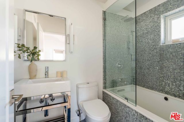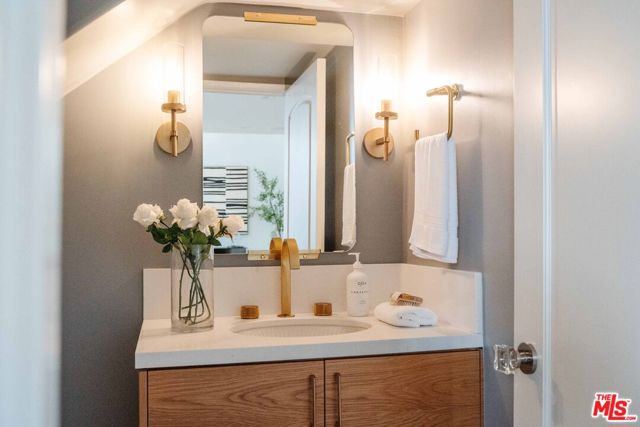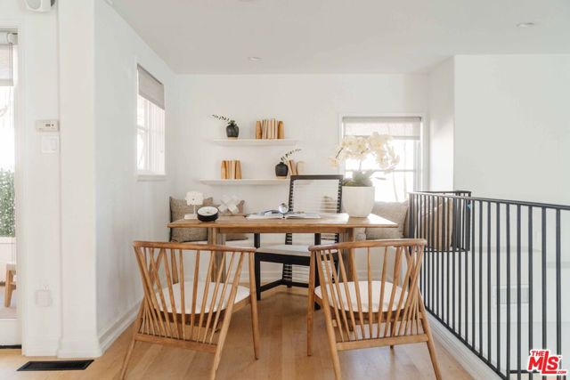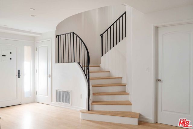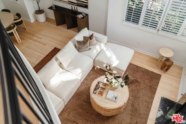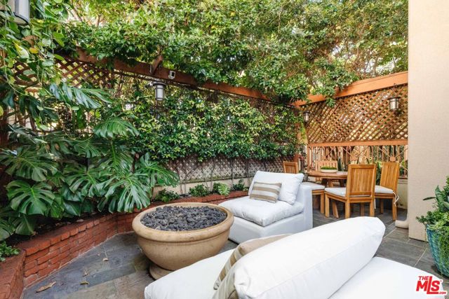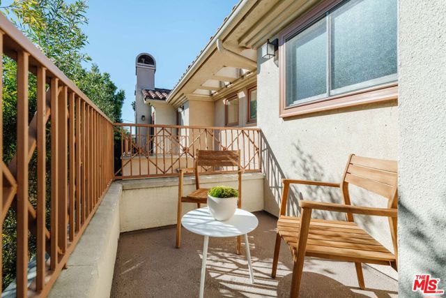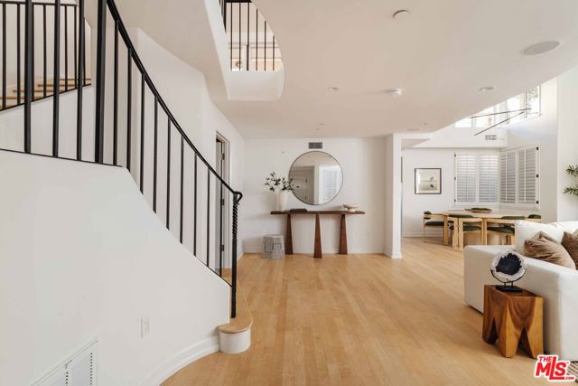 Just off Montana Avenue, this front-facing residence is the premier townhome within a gated four-unit Spanish enclave. Extensively renovated by the current owners, the 2,134-SF layout has been thoughtfully elevated with curated materials, bespoke craftsmanship, and a sophisticated modern aesthetic. Double-height ceilings, hardwood floors, clerestory windows, and gallery-style walls create an airy, sunlit great room and entry with a dramatic black stone fireplace grounding the space. The designer kitchen features custom sage cabinetry, slab stone backsplashes, Wolf and Sub-Zero appliances, and a farmhouse sink with picture window looking out to the exterior. Just beyond, an oversized private patio with a fire pit and mature landscaping offers multiple outdoor living and dining area options - perfect for entertaining or relaxation. Upstairs, a spacious lofted office with a built-in nook and covered patio overlooks the main level and provides flexible utility as a studio, gym, or additional lounge. The serene primary suite features vaulted ceilings, a fireplace, balcony, walk-in closet, and a spa-like bath with dual vanities and an oversized shower. A generous secondary bedroom suite includes its own balcony, walk-in closet, and renovated bath. Additional highlights include a renovated powder room, dedicated laundry room, state-of-the-art air and water filtration systems, and a private two-car garage with storage inside the gated subterranean parking. Originally built for the developer's personal use and situated just feet from Montana Avenue's boutiques and cafes, this rare offering blends privacy, design, and turnkey luxury in one of Santa Monica's most sought-after locations.