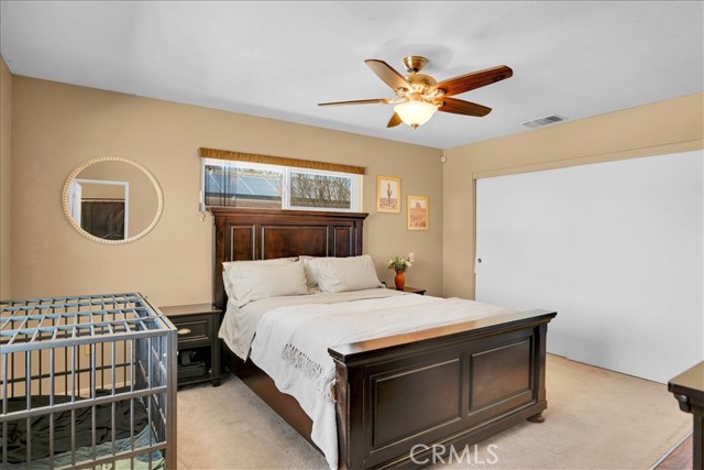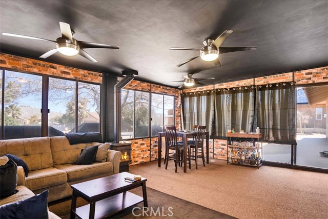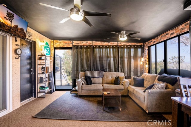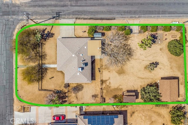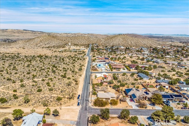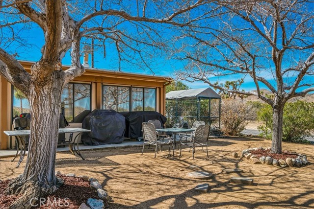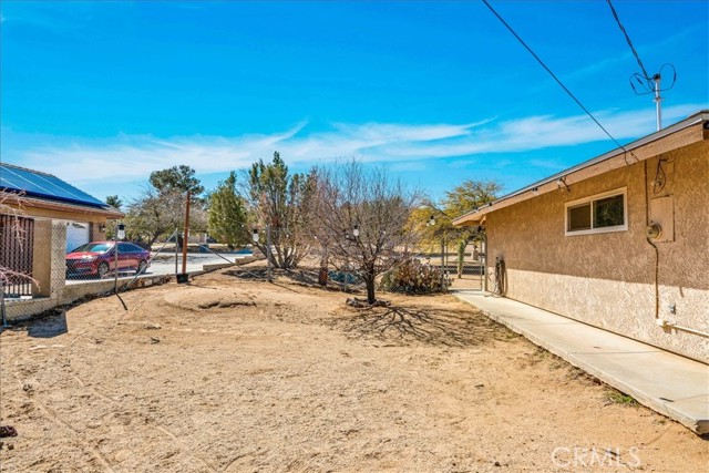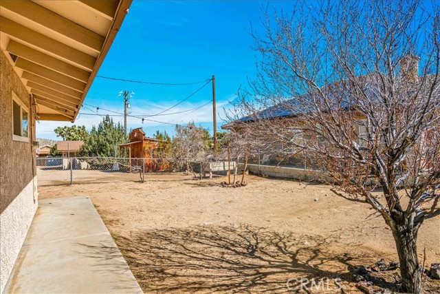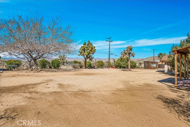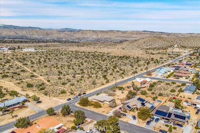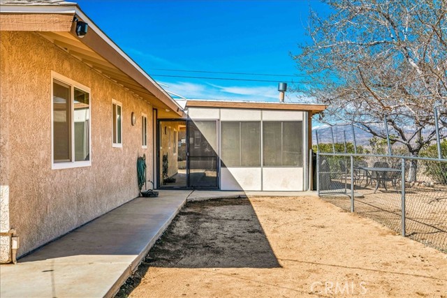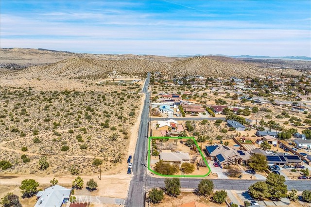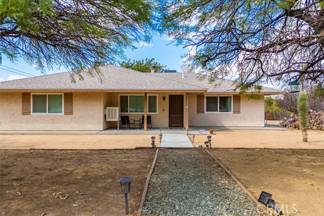 This well maintained 2-bedroom, 2-bathroom home is situated on a desirable corner lot in the sought-after Sky Harbor neighborhood, it spans approximately half an acre and is surrounded by mature trees and a beautiful desert landscape with scenic views. BRAND NEW heating and A/C units! The living room has built-in shelving and a cozy natural gas fireplace. The kitchen is equipped with stainless steel appliances, including a gas stove and built-in microwave, and the dining area is conveniently located off the kitchen. A separate office space with built-in cabinets offers direct access to the enclosed patio and garage. The spacious primary bedroom comes with an en-suite bathroom, while the large secondary bedroom is adjacent to a hall bathroom. As an added bonus there is an enclosed patio that adds an additional 280sq ft of living space and features a natural gas heater, carpet flooring, and lovely views of the yard. The attached 2-car garage includes evaporative heating and cooling, laundry area with a sink, built-in cabinets, a newer water heater, and carpeting. This space can be used as a traditional garage or additional space for an in-home gym, possible 3rd bedroom option or extra storage, providing versatility. The backyard, which has gated access from Warren Vista, features a separate 2-car garage, fire pit area, cowboy shed, garden areas, and ample space for RV or boat storage. Fully fenced for privacy, this home also boasts a newer roof, making it a fantastic opportunity for any buyer. Close Proximity to Joshua Tree National Park, Pioneer Town and Palm Springs.