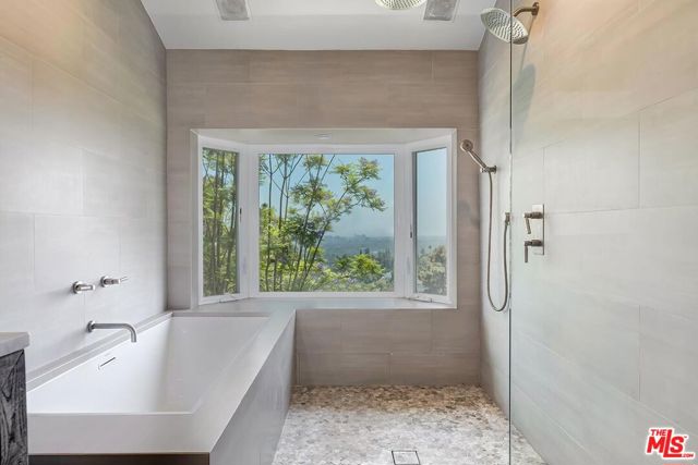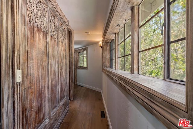 Gothic-Inspired home with Panoramic Views in Prime BHPO. Set high above the city in a peaceful & private enclave of Beverly Hills Post Office, this striking 3 bed + 3.5 bath + bonus room home blends dramatic Gothic-inspired architecture with modern luxury. Designed by a celebrity designer, the residence showcases custom wood detailing & breathtaking 180 views of the city skyline, ocean & canyons from every room. The expansive living room with soaring beamed ceilings is filled with natural light, featuring a stunning stone fireplace, oversized windows framing Downtown LA, & seamless flow into the dining area & out to an entertainer's dream deck. Spanning almost the entire length of the home, the deck offers unobstructed panoramic views & is ideal indoor/outdoor living. The chef's kitchen includes high-end stainless-steel appliances, tons of cabinetry, stylish tile flooring, & a bay window with hillside vistas. A convenient door opens directly to the deck perfect for morning coffee or al fresco dining. The primary suite is a true retreat, with a full wall of windows showcasing sweeping city & hill views, a massive walk-in dressing room with custom built-ins, & an additional wall of closets, ideal for the fashion-forward tenant. The spa-like en-suite bath is beautifully renovated, featuring double sinks, intricate tilework, a soaking tub inside the shower, & a bay window overlooking the treetops & skyline. The main level also includes a light-filled 2nd bedroom with built-ins, a fully renovated hall bathroom with skylight, & a chic powder room. Downstairs offers the 3rd bedroom en-suite with updated bathroom, a bonus room for a home office or creative space, a laundry room, & the direct access garage, complete with abundant storage & rubberized flooring, should you want to use it as a home gym. Surrounded by prestigious estate properties, this one-of-a-kind residence offers privacy, incomparable design, & effortless access to the best of Beverly Hills, the Valley, West Hollywood & the Westside.