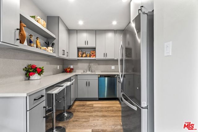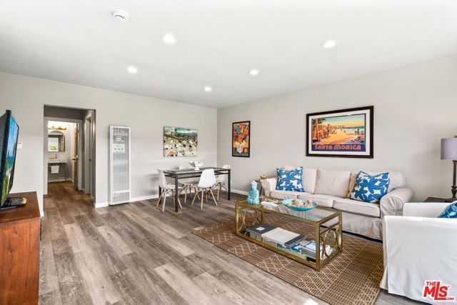 Contemporary Coastal Living in Santa Monica! Completely modernized 2 Bedrooms + 1 Bath with approximately 800 sqft with an airy layout that defies its dimensions overlooking lush greenery vistas. This fully transformed unit with wood vinyl flooring and recessed lighting throughout has a streamlined kitchen with a cohesive stainless steel appliance package with elegant countertops and integrated breakfast seating. Split bedroom configuration ideal for privacy and quiet and these bedrooms are both framed by established lush foliage. Fully renovated bathroom with contemporary aesthetics and clean lines. There is a dedicated covered one carport parking and storage and Low Homeowners dues that include water. Located in the sought-after Santa Monica School District. This vintage 1956 beautiful courtyard complex has a pool. The Princeton South Condominiums is a 19-unit building complex with controlled access. Close proximity to Douglas Park, Trader Joe's, Erewhon, Bristol Farms, restaurants, bars and services