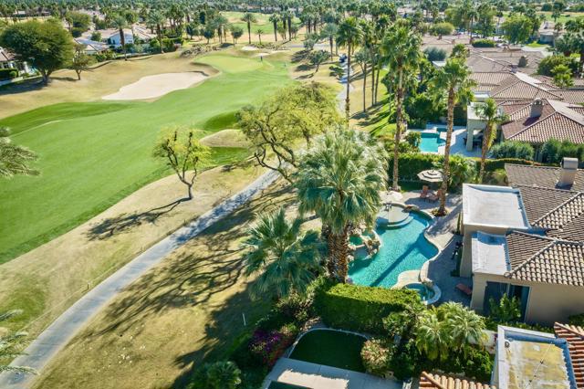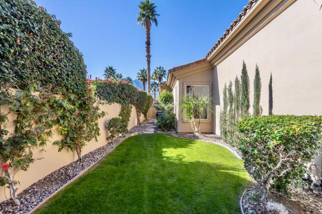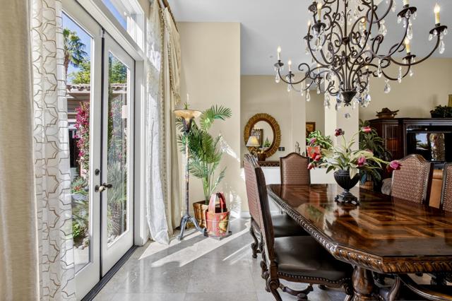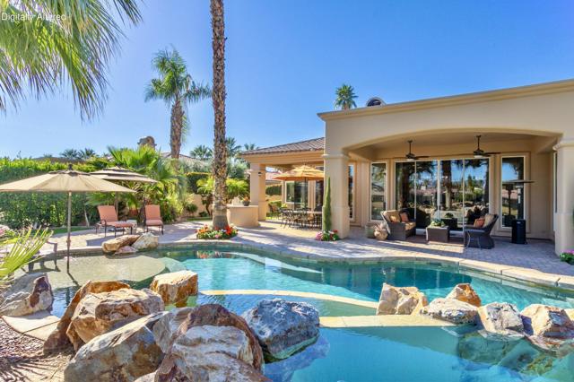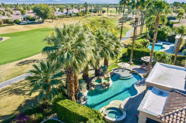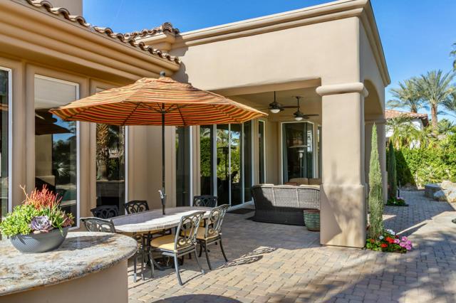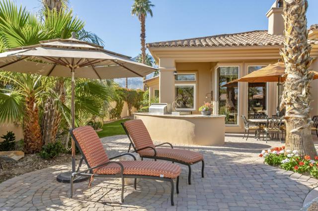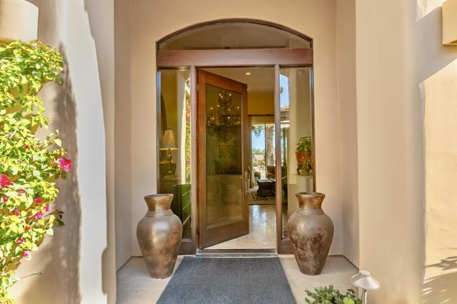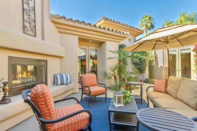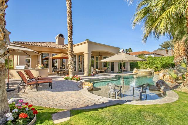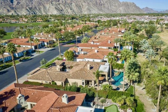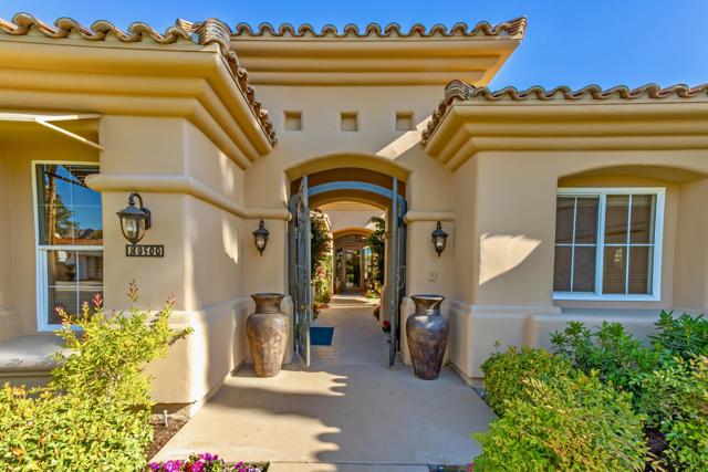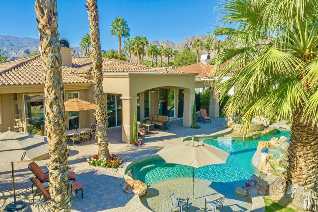 Nestled on the 10th hole of the Nicholas tournament course in PGA WEST this 4 bedroom 5 bath masterpiece blends Mediterranean charm with modern luxury. A coveted street to live on Weiskoff, this home is a masters 1 floor plan. Stunning entrance, as you step through an enchanted courtyard lush and inviting. The Formal entry welcomes you into a grand open great room, impeccably decorated, featuring travertine and mosaic tile floors, a see-through fireplace that separates the living and breakfast areas. A formal dining room illuminated by an elegant chandelier. The gourmet kitchen boasts beautiful cabinetry, granite countertops, a center Island, and stainless steel high-end appliances. There are 2 wine refrigerators, one being extra large in the Butler's pantry, and the other in the entertainer's wet bar. There is a place for everyone in this home! The spacious primary retreat has a large walk-in closet, beautiful granite showers, separate water closets, and a bonus room that can be used as an office or fitness room. There are gorgeous views. gorgeous views of the pool and golf course. There are panoramic Mountain views from all aspects on this property. The owners have done several upgrades from new A/C , new roof tiles, adding vintage lush, palms, citrus, fruit trees, new sound system and upgraded salt water pool unit for waterfall. A spa, tanning deck, fire pit, new built-in barbecue, new artificial turf. The covered patio allows plenty of space for dining and entertaining and privacy provided by multiple fruit trees. The Casita has a separate entrance from the main house. The home is close to Shopping, dining, World class Tennis BNP, festivals, and home to American Express PGA tournament. A true desert oasis comes turnkey furnished. Don't miss this opportunity. Welcome home!