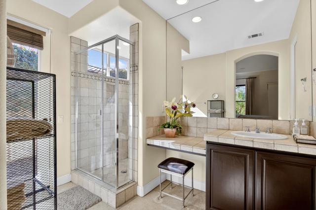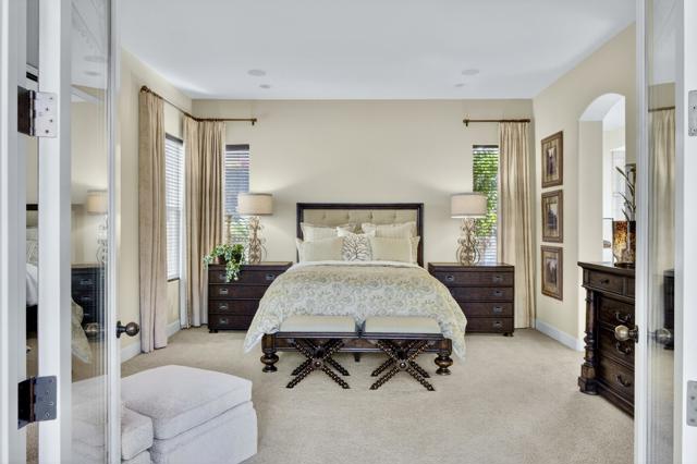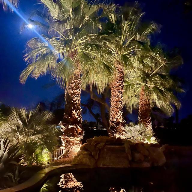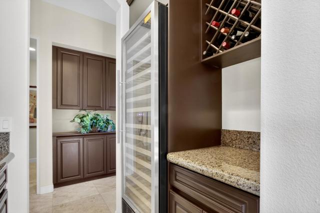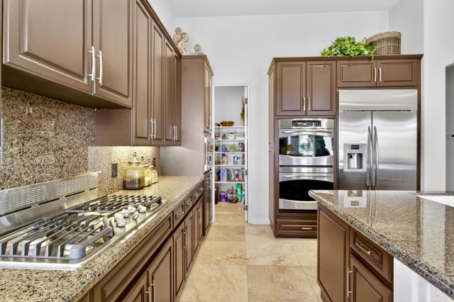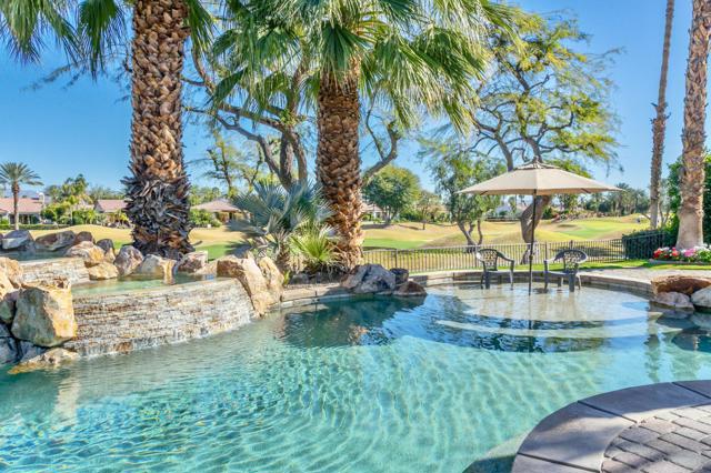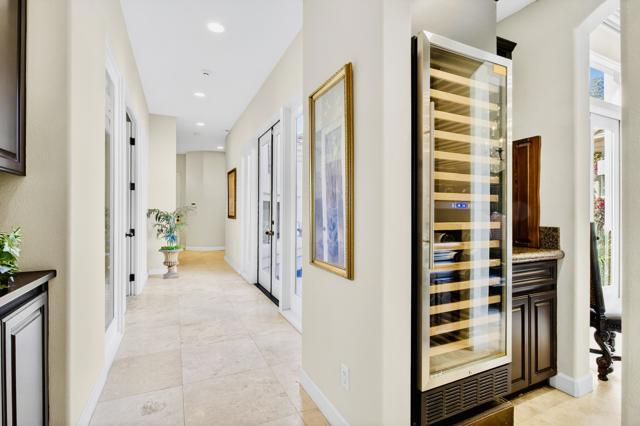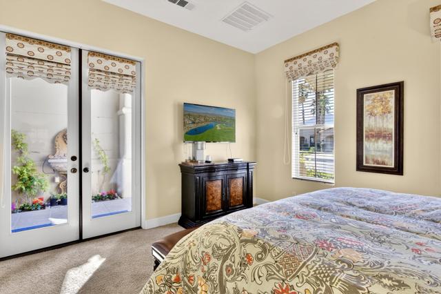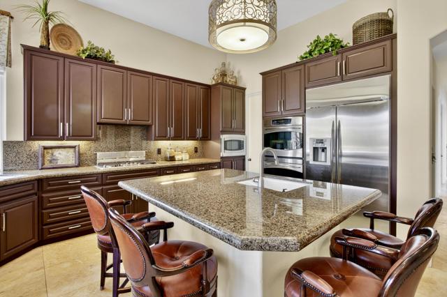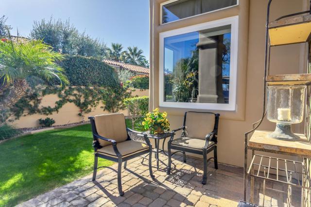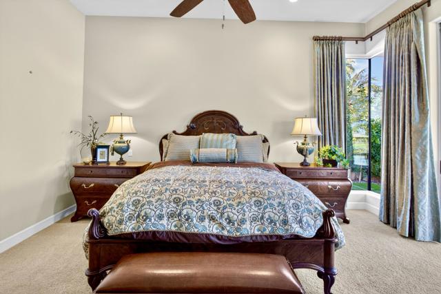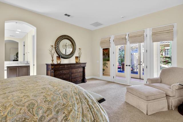 Nestled on the 10th hole of the Nicholas tournament course in PGA WEST this 4 bedroom 5 bath masterpiece blends Mediterranean charm with modern luxury. A coveted street to live on Weiskoff, this home is a masters 1 floor plan. Stunning entrance, as you step through an enchanted courtyard lush and inviting. The Formal entry welcomes you into a grand open great room, impeccably decorated, featuring travertine and mosaic tile floors, a see-through fireplace that separates the living and breakfast areas. A formal dining room illuminated by an elegant chandelier. The gourmet kitchen boasts beautiful cabinetry, granite countertops, a center Island, and stainless steel high-end appliances. There are 2 wine refrigerators, one being extra large in the Butler's pantry, and the other in the entertainer's wet bar. There is a place for everyone in this home! The spacious primary retreat has a large walk-in closet, beautiful granite showers, separate water closets, and a bonus room that can be used as an office or fitness room. There are gorgeous views. gorgeous views of the pool and golf course. There are panoramic Mountain views from all aspects on this property. The owners have done several upgrades from new A/C , new roof tiles, adding vintage lush, palms, citrus, fruit trees, new sound system and upgraded salt water pool unit for waterfall. A spa, tanning deck, fire pit, new built-in barbecue, new artificial turf. The covered patio allows plenty of space for dining and entertaining and privacy provided by multiple fruit trees. The Casita has a separate entrance from the main house. The home is close to Shopping, dining, World class Tennis BNP, festivals, and home to American Express PGA tournament. A true desert oasis comes turnkey furnished. Don't miss this opportunity. Welcome home!