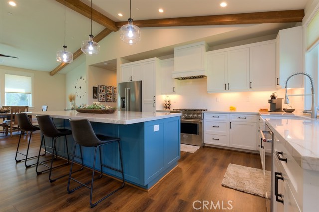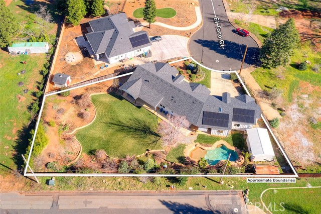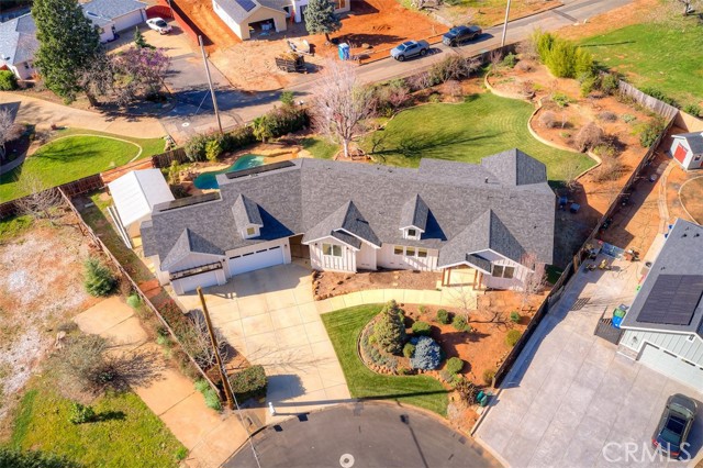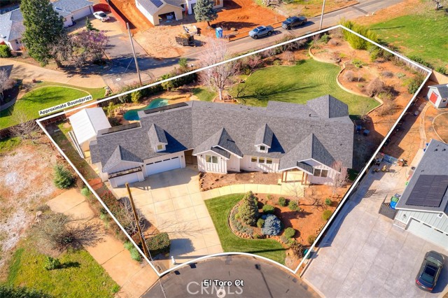 Welcome to 1793 El Toro Court in Paradise—a beautifully crafted, nearly new custom home tucked away at the end of a quiet cul-de-sac. From the moment you step inside, the quality and thoughtful design are unmistakable. Expansive ceilings with striking beam accents and an abundance of natural light create a bright, airy atmosphere that feels both elegant and inviting. The heart of the home is a stunning, open-concept kitchen designed for both everyday living and entertaining. Featuring a professional-style six-burner gas range, stainless steel appliances, a farmhouse sink, beverage refrigerator, quartzite countertops, a generous walk-in pantry, and an oversized island perfect for gathering, this space seamlessly flows into the dining and living areas. A sleek, contemporary fireplace adds warmth and ambiance, making it ideal for hosting guests or enjoying a quiet evening in. The spacious primary suite offers a private retreat with direct access to the backyard oasis. The spa-inspired bathroom boasts a soaking tub, expansive walk-in shower, and an impressive walk-in closet that is large enough to be office space or your own personal dressing room. Each additional bedroom is generously sized and includes its own private bathroom, offering comfort and convenience for family or guests. Step outside to your own resort-style backyard featuring a sparkling pool with a beach-entry design, perfect for relaxing in the sun or cooling off on warm days. There’s also a garden area, a detached outbuilding, and ample space for outdoor entertaining or recreation. The tandem three-car garage provides room for up to four vehicles or additional storage for recreational toys. Owned solar helps keep energy costs down, adding efficiency to this already exceptional home. Peaceful, private, and designed with both luxury and livability in mind, this property truly offers the best of Paradise living.