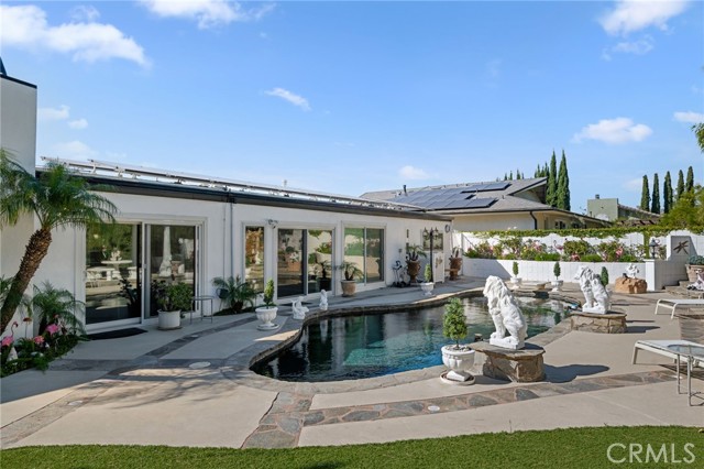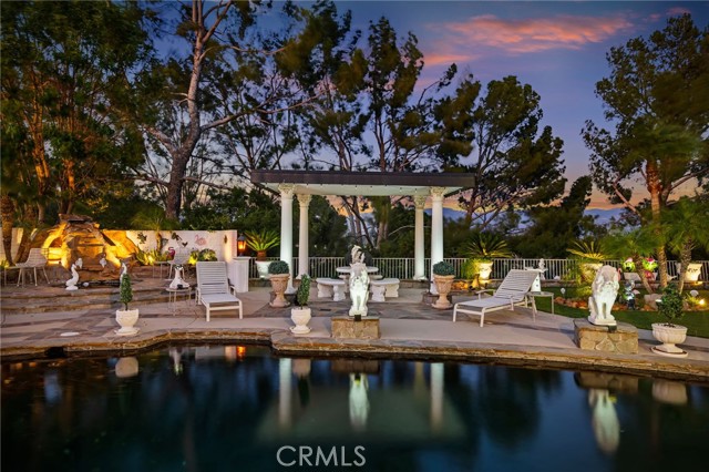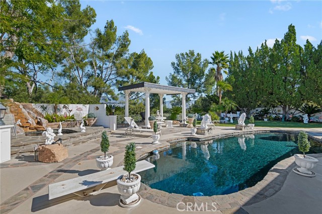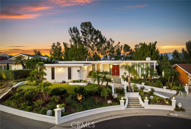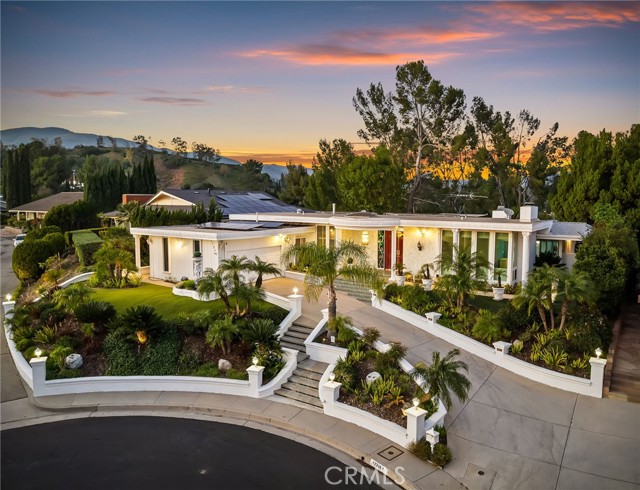 Perched atop Granada Hills on a super quiet cul-de-sac, this extraordinary single-story residence captures breathtaking views from both the front and rear, offering a rare blend of privacy, gorgeous architecture, and an incredible setting. Elevated above street level, the home enjoys a commanding presence while maintaining exceptional seclusion. Roman-inspired modern architecture gives the property a distinctive elegance rarely found in the area. Inside, the thoughtfully designed floor plan balances formal and relaxed living spaces, including a spacious living room with fireplace, a separate formal dining room for elegant gatherings, and a welcoming family room with fireplace wired for surround sound. The chef in you will be delighted with the kitchen which is both functional and inviting, enhanced by custom ceiling, a new dishwasher and trash compactor, along with luxury vinyl flooring that is also found in the guest bathroom. The primary suite serves as a peaceful retreat, complete with a private bath featuring a bidet, excellent closet space and tranquil views of the remarkable backyard. Outdoor living reaches resort caliber with a stunning pool and spa, highlighted by a waterfall cascading into the spa. Spectacular exterior lighting transforms the grounds at night, creating an ambiance that is truly unforgettable. Yard improvements include highly quality turf in the front and rear yard. The home offers entertaining options most could never dream of. Additional upgrades include plantation shutters, indoor laundry room for convenience, soft water system, newer water heater with recirculation pump, DWP-approved pool pump, Ring security cameras around the perimeter, and a separate irrigation meter to help reduce monthly cost. A rare opportunity to own a view property of architectural distinction in one of Granada Hills’ most desirable locations. The home is within the premier school district of Granada Hills Charter High School, Frost Jr. High and El Oro Charter for Enriched Studies.