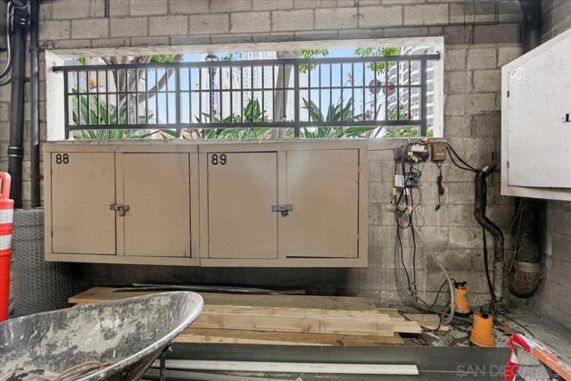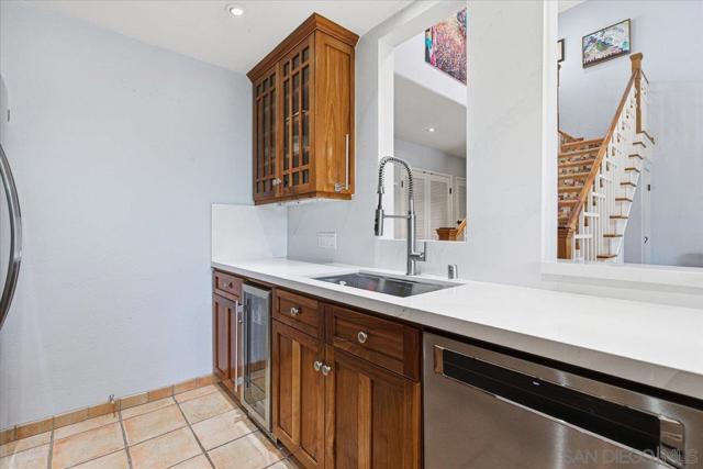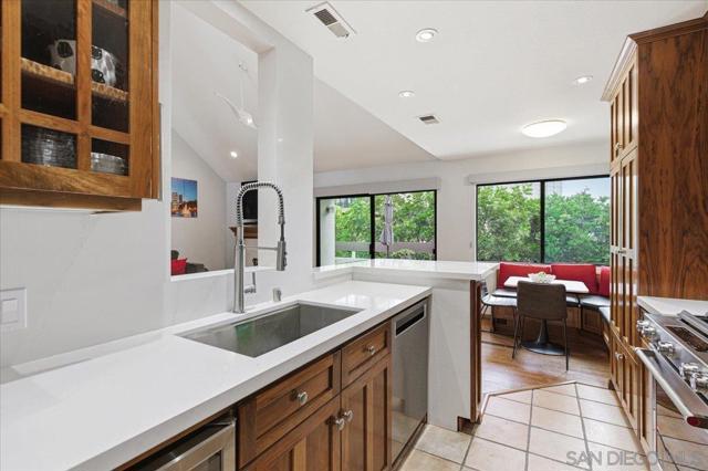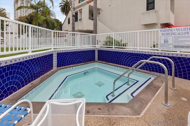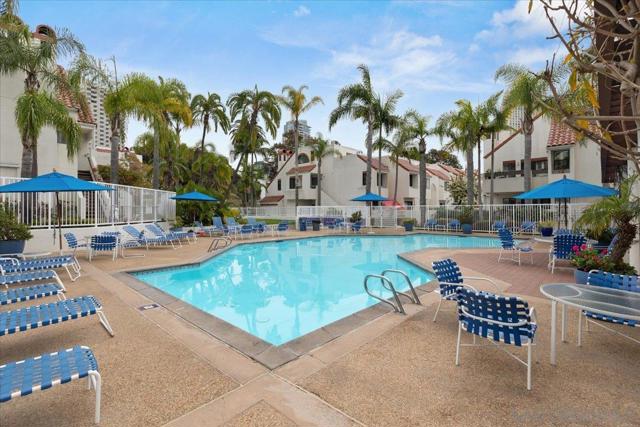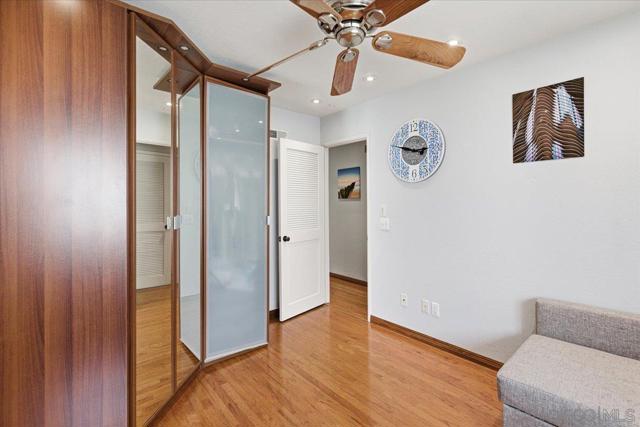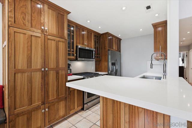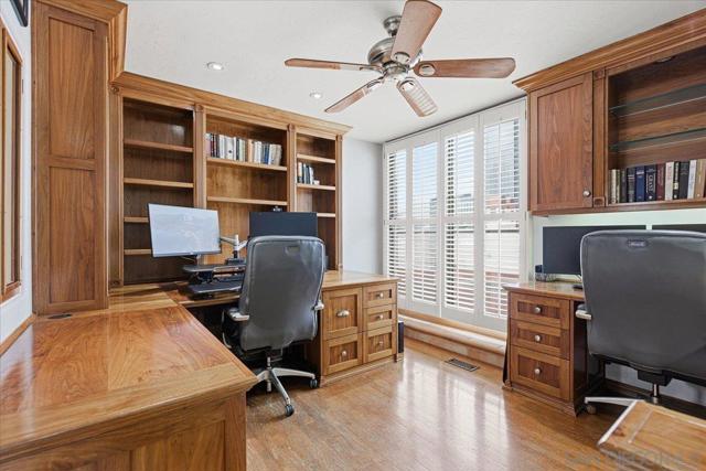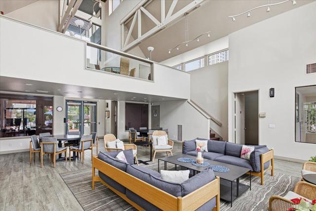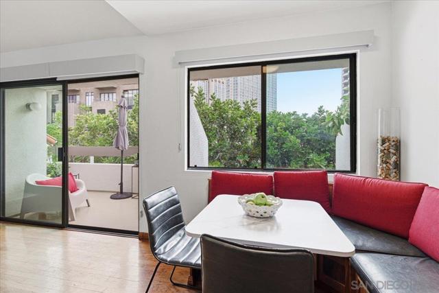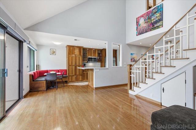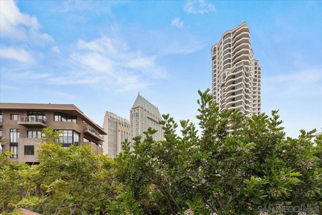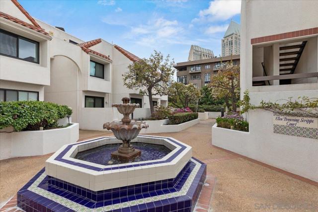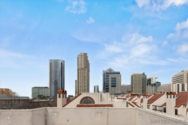 Experience elevated townhome living in the heart of Downtown’s prestigious Marina District within the coveted Park Row community. This exceptional second-story residence welcomes you with rich hardwood floors, soaring ceilings, and an airy open-concept design that blends sophistication with warmth. The expansive living room is illuminated by oversized windows and skylights, while a striking walnut-trimmed fireplace with art tile detailing creates an elegant focal point. A versatile dining area flows seamlessly into the timeless kitchen, thoughtfully appointed with custom black walnut cabinetry, quartz countertops, gas cooking, and refined finishes throughout. Oversized sliding glass doors extend the living space outdoors to a private balcony, where city views stretch toward Seaport Village and the Bay, an ideal setting for effortless indoor-outdoor entertaining. A custom-designed staircase leads to a bright, architectural loft featuring a built-in executive office for two (or bedroom), complete with solid wood desks, extensive bookcases, and integrated storage. A second set of sliding doors opens to an exclusive rooftop deck—perfect for sunset views and starlit evenings above the city. The private primary suite offers a tranquil retreat with a generous jetted soaking tub and a recently remodeled spa-inspired shower. Additional highlights include central air conditioning, in-unit laundry, recessed lighting, and abundant storage. Park Row residents enjoy lush park-like grounds adorned with sparkling fountains, a resort-style pool and spa, secured underground parking, 24-hour gated security, and ample guest parking, all just moments from waterfront dining, Seaport Village, The Rady Shell, Petco Park, the Gaslamp Quarter, the Convention Center, Balboa Park, and San Diego International Airport. A rare opportunity to enjoy refined townhome living in one of Downtown’s most distinguished locations.