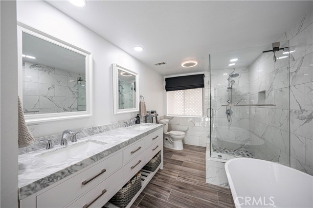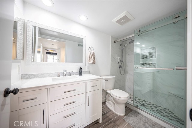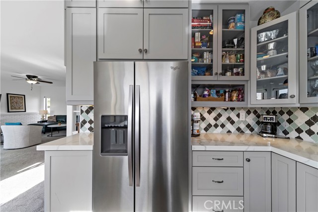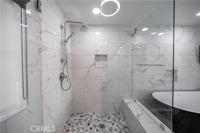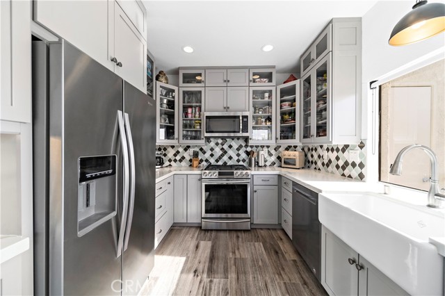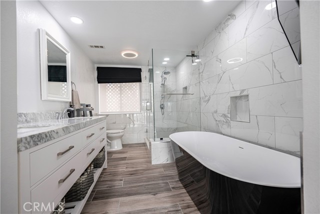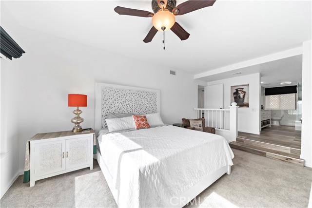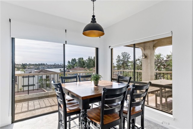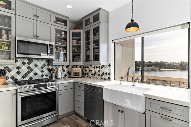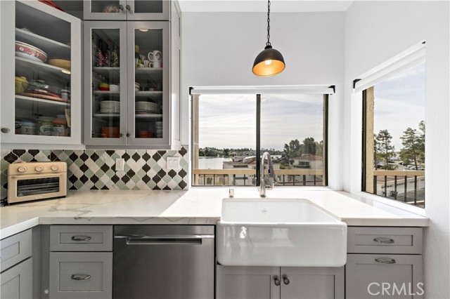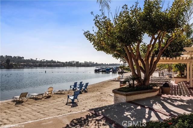 SIMPLY PUT, THIS IS THE NICEST MALLORCA CONTESSA PLAN TO EVER COME ON THE MARKET.... Proximity to the lower pool/spa, being next to an access to the Lakefront, the ease in visiting Plaza Del Lago without being so close that noise is a factor and the value of having no neighboring building directly to the south of you are all wonderful features. Add-on being one street off the lakefront, looking down on the greenbelt pathway affording you an unobstructed view of a portion of the Mallorca Promenade, the Bulkhead and boats docked on the lake, coupled with the lack of any third story homes on either side of the walkway and it is no wonder that this is one of the very best views in Mallorca. Not only is the Lake staring you in the face, your view is enhanced by visions of East Beach and the Oak Preserve. Don't overlook the angle the home rests on. Facing South East, that rear balcony gets sunshine all day long, making this one of the best naturally lighted homes in the tract. There is so much sunshine, 3 retractable awnings have been added to create an option between sun and shade; warm and cool. That angle helps capture the gentile afternoon breeze that travels south to north. At the same time, that positioning protects from the elements brought by the Santa Ana Winds that blow north to south. But what makes this home most unique is what has been done to the kitchen and to the primary bath. Widening the kitchen doorway from the original 32 inches to an impressive 54 inches, and raising the entire ceiling and access by 2 feet creates quite the impression. The wine cooler and the quartz counter atop it supplements the illusion of expansion by making the entry appear to be a stunning 70 inches wide. Under cabinet lighting, 3 lazy Susan's, quartz counters, elegant cabinetry with glass doors, soft close features on the doors and drawers with dovetail joint construction, both pendant and recessed can lighting, pewter knobs and handles, stainless steel appliances including the refrigerator, dishwasher, microwave and the oven/stove with its 4 burners and a 5th burner griddle feature all come together to make this kitchen one that anyone would be proud of. And the view. People will argue over who gets to do the dishes in that barn style sink. The best feature of the home is probably the primary bath. Modified to allow for a large walk-in shower AND luxurious soaking tub with wall mounted TV, the double sinks and the tiled walls will take anyone a moment to comprehend.