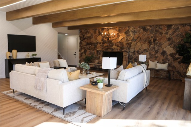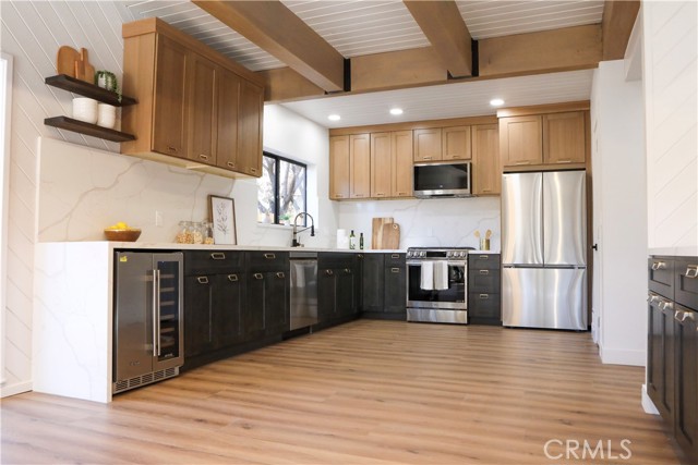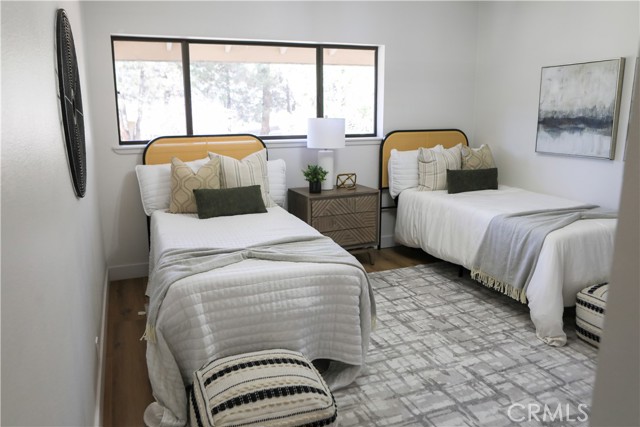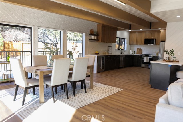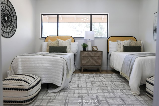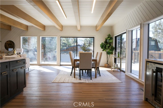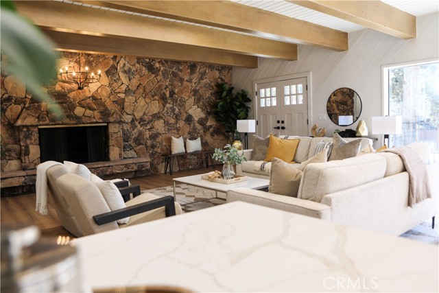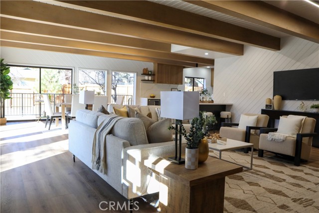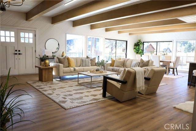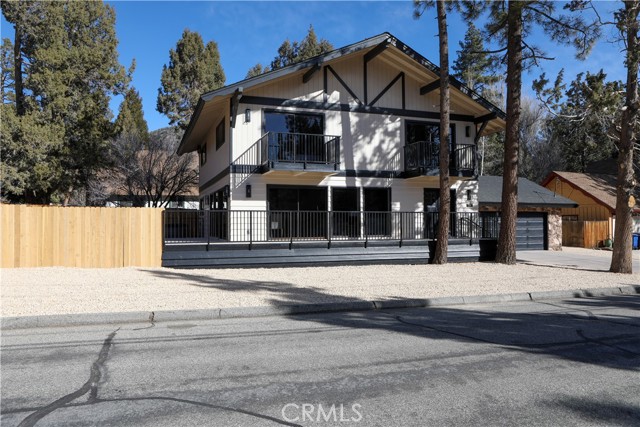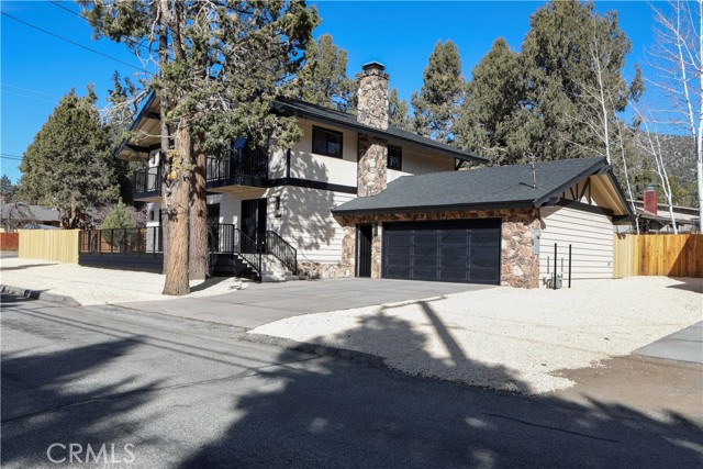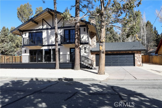 Fully renovated luxury mountain retreat just minutes to the slopes, Big Bear Lake, and The Village! This professionally designed 2,660 sq ft home offers 4 bedrooms, 3.5 baths, and a 2-car garage with brand-new systems throughout including HVAC, roof, water heater, electrical, insulation, and windows — offering lasting quality and comfort. High-end finishes include premium appliances, designer fixtures, and custom hardware. The spacious chef’s kitchen features a walk-in pantry, bar area, and wine fridge, perfect for entertaining. The primary suite boasts a private balcony with mountain and ski slope views, spa-style ensuite with double vanity, and walk-in closet. Three additional bedrooms include one with a private balcony and one with its own half bath. Bright great room with wall-to-wall windows, tongue-and-groove ceilings, original wood beams, and stone fireplace. Glass doors open to a wraparound deck, new hot tub, fenced yard, RV/boat parking, and ample space with potential for additional guest accommodations or flexible use, subject to local regulations.