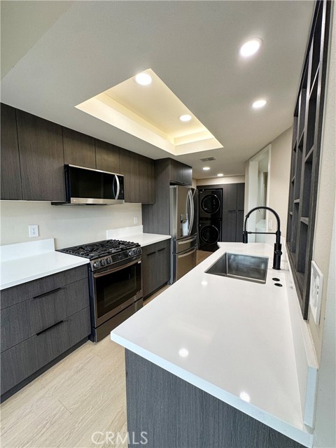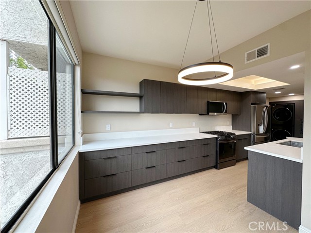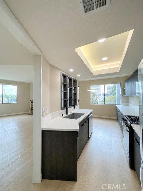 Welcome to this beautifully renovated 2-bedroom, 2-bathroom residence located in the highly desirable Westwood neighborhood. Thoughtfully remodeled approximately two years ago, this home features a bright open-concept layout with warm wood-toned vinyl flooring and a modern neutral color palette throughout. The spacious living and dining areas flow seamlessly together, highlighted by a stylish brick fireplace and a private balcony. Large windows invite abundant natural light and provide excellent ventilation. The two-layer window construction effectively reduces outside noise, creating a noticeably quieter and more comfortable interior environment. The contemporary kitchen showcases dark custom cabinetry paired with sleek white quartz countertops and a full suite of premium LG stainless steel appliances. A modern island sink, designer lighting, and generous storage space provide both functionality and sophistication. This unit offers two fully updated bathrooms featuring modern tile finishes, glass shower enclosures, elegant black fixtures, and a dual vanity in the primary bath for a spa-like experience. The bedrooms are thoughtfully positioned for privacy. The primary suite includes ample closet space, and additional built-in storage—such as a custom shoe cabinet near the entry—enhances everyday organization and convenience. Enjoy the convenience of an in-unit washer and dryer, along with central HVAC for year-round comfort. The building offers a secured gated parking garage with two tandem parking spaces. Ideally located just minutes from UCLA, Century City, Westfield Mall, popular restaurants, cafes, and parks, this home offers the perfect balance of peaceful residential living and prime urban accessibility.