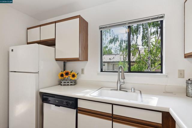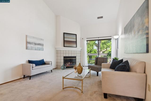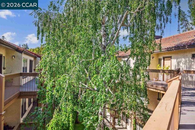 Location, Location, Location! This unit boasts one of the best locations in the entire community. Backing up to the creek & trail, the unit is surrounded by birdsong, trees & sky offering serenity & privacy that is unmatched. This charming upper-level condo is nestled in the popular Villas Community in Walnut Creek offering a bright & open floor plan & comes w/ new laminate flooring, freshly painted interior, updated bathroom, wood burning, fireplace, in unit washer & dryer & a private shady patio. As you enter the home you will be delighted w/ the vaulted ceilings & how the entire space is filled w/ abundant natural light. The kitchen offers new lighting, a versatile breakfast bar w/ generous counter space & cabinets & includes built-in microwave, refrigerator, oven, stove & dishwasher making cooking & entertaining a delight. Open kitchen overlooks the bright & cheery dining room w/ modern chandelier & into the spacious living room w/ vaulted ceilings & tiled fireplace giving the room a warm & inviting feeling. Sliding glass doors lead out to the private patio radiating a tree house style setting of nature & birdsong. Bedroom is airy & bright w/ windows on 2 sides of this rare corner unit offering multiple views & plenty of space. The full bathroom includes new vanity & lights.