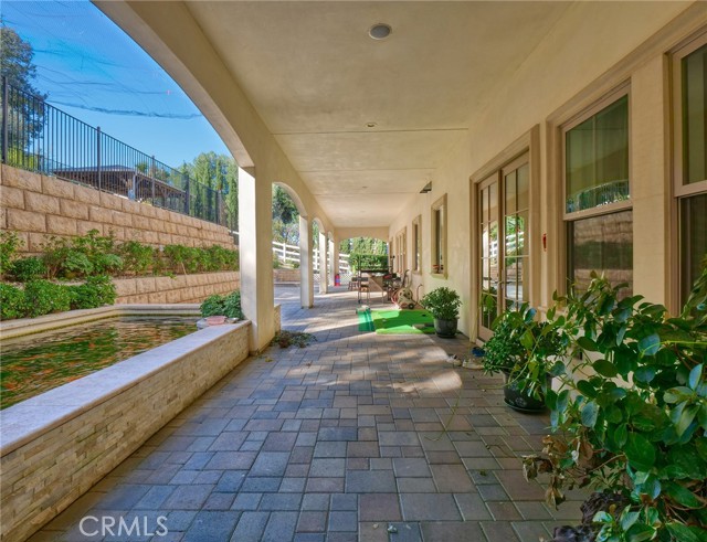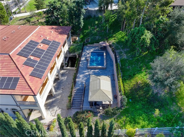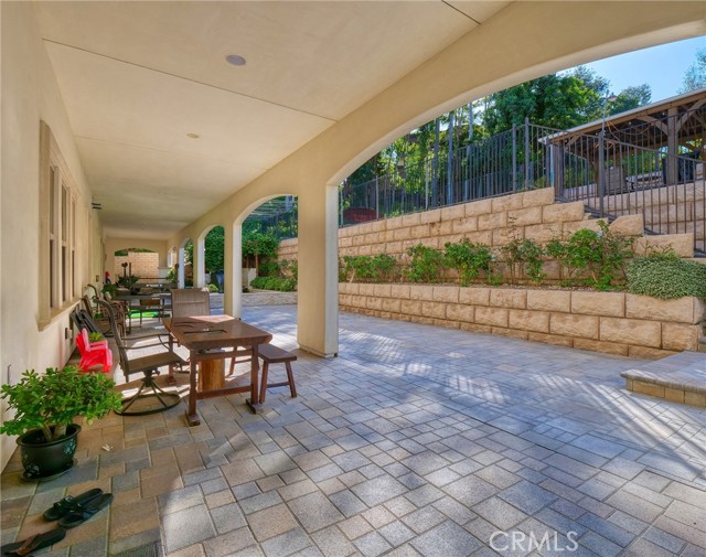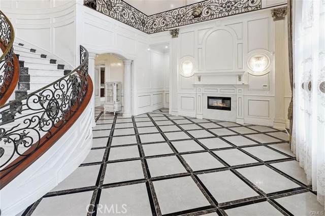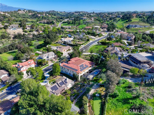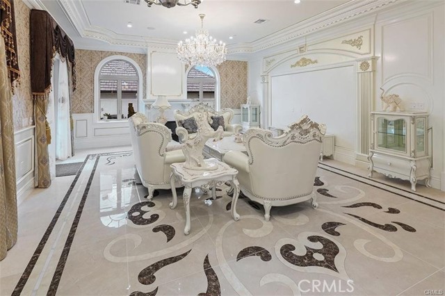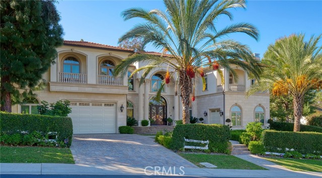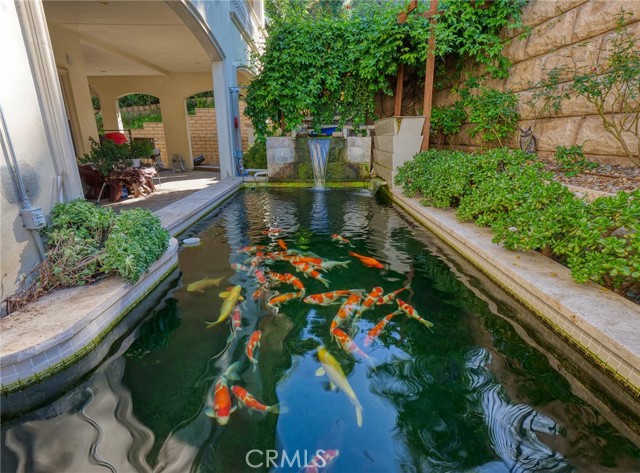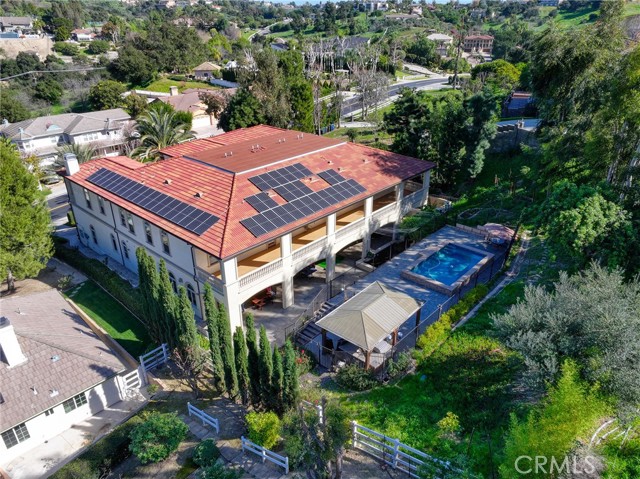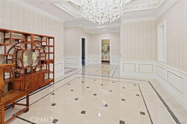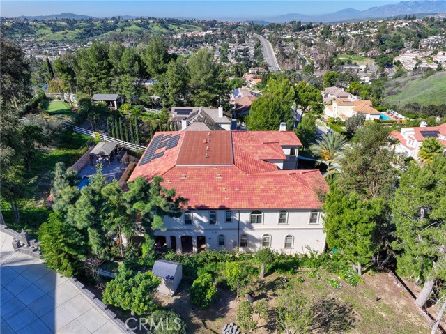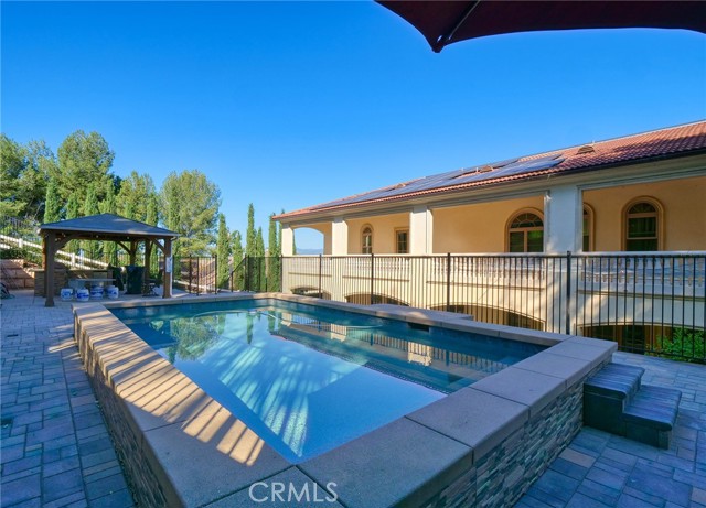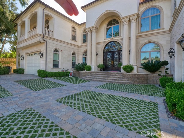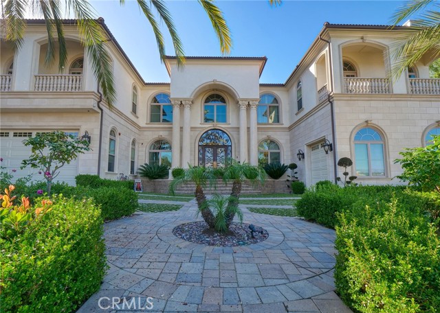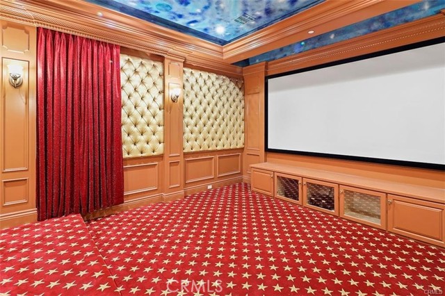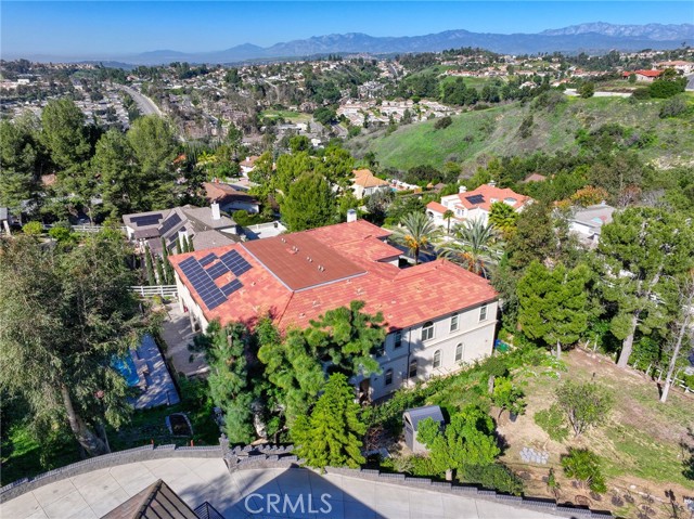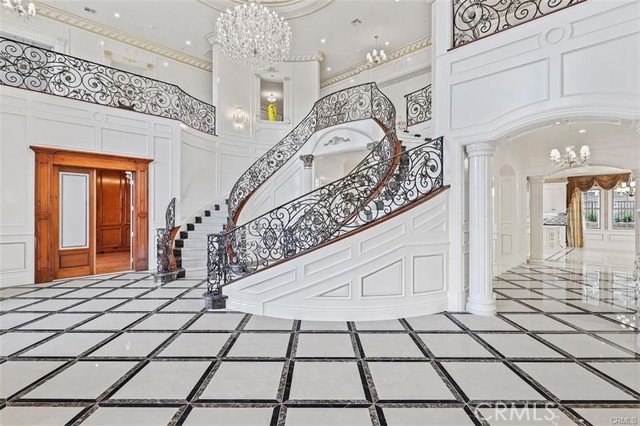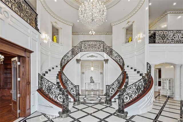 Experience luxury living in this magnificent two-story estate featuring six private bedroom suites, an expansive bonus room, two dedicated offices (one upstairs and one downstairs), a custom movie theater, two additional powder rooms, and a spa-inspired shower/sauna retreat. Soaring ceilings reach up to 22 feet, with 11-foot ceilings on both levels, enhanced by intricately detailed crown moldings accented with hand-painted gold trim. Custom designer wallpaper adorns the bedroom and office walls, adding timeless elegance throughout. Ornate, custom double doors open to a grand formal entry showcasing sweeping dual curved staircases, a stunning chandelier, and an adjacent reception area anchored by a beautiful fireplace—perfect for welcoming guests in style. The downstairs bonus room features floor-to-ceiling mirrors and easily converts into a dance studio or private fitness room, conveniently connected to the shower/sauna space. A fully wired media room with built-in stage offers the ideal setting for a home theater or entertainment lounge. Designed for both everyday comfort and entertaining, the spacious family room includes a built-in secondary kitchen and patio doors that open to the outdoors. The gourmet main kitchen is fully upgraded with quartz countertops, walk-in pantry, wet bar, adjacent wok kitchen, and an oversized dining area. The home offers two wet bars total, making hosting effortless. Additional highlights include a large laundry room with built-in shelving and abundant storage, bidet toilets in bathrooms, and a built-in elevator conveniently located beside the staircase. One bedroom suite is located on the main level, with five suites upstairs, each featuring walk-in closets and en-suite bathrooms. Two upstairs suites serve as luxurious primary bedrooms, both with private patios. Step outside to enjoy paid-off solar energy panels, a tranquil koi pond, entertaining cabana, soaking pool and spa, expansive decks ideal for gatherings and celebrations, and ample space for a future pool, all framed by breathtaking mountain views. This exceptional property blends grand architectural design with modern amenities and resort-style living. Don’t miss the opportunity to own this truly remarkable home!