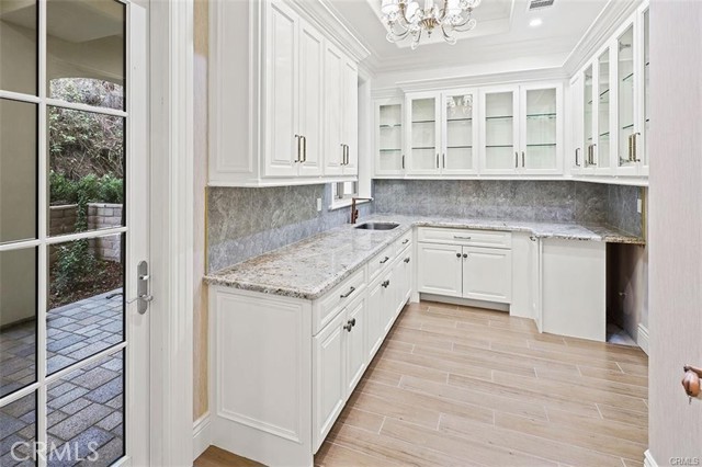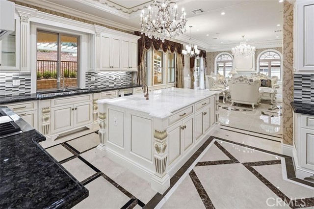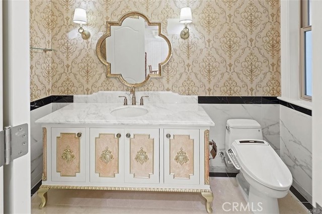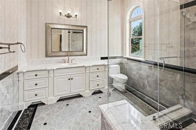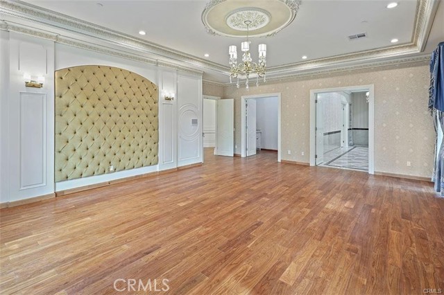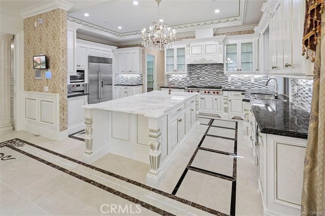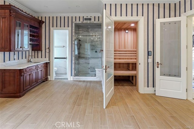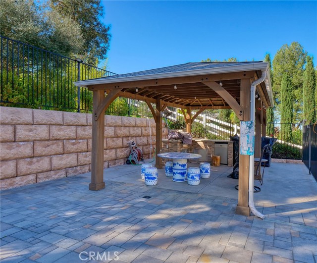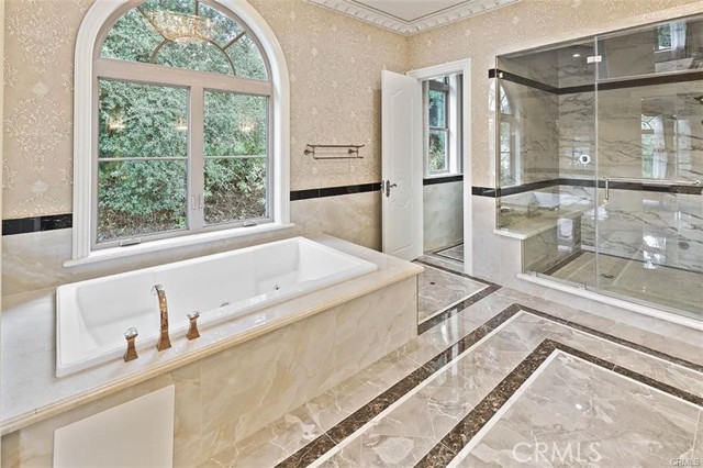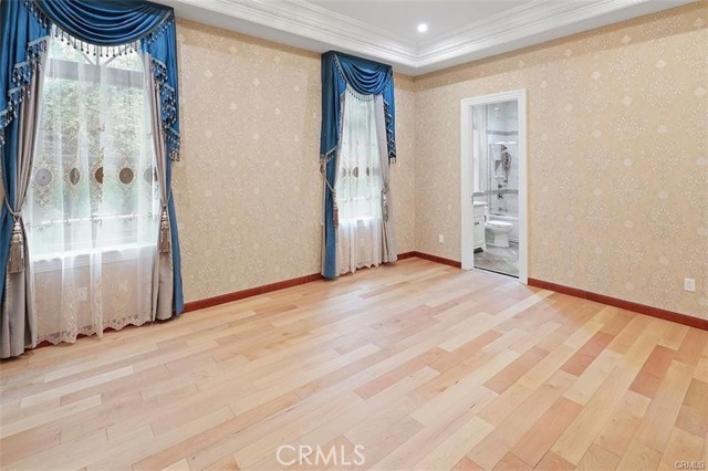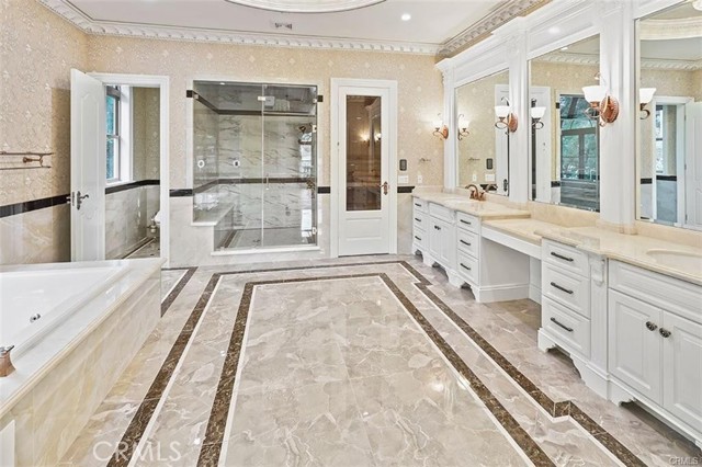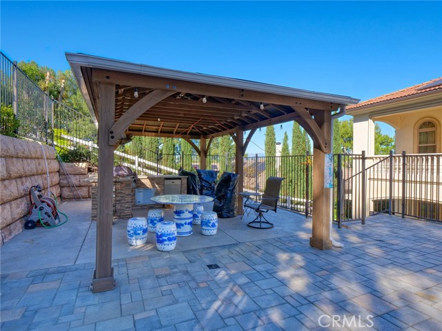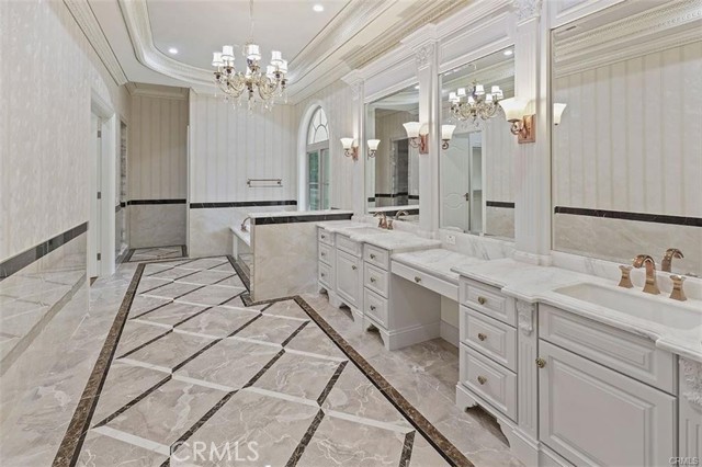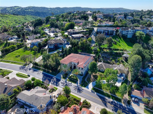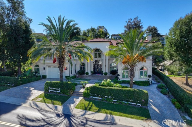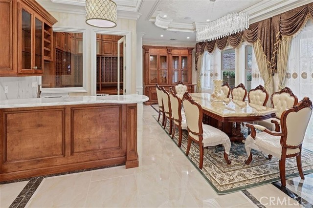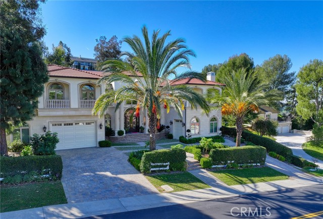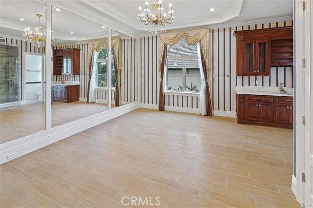 Experience luxury living in this magnificent two-story estate featuring six private bedroom suites, an expansive bonus room, two dedicated offices (one upstairs and one downstairs), a custom movie theater, two additional powder rooms, and a spa-inspired shower/sauna retreat. Soaring ceilings reach up to 22 feet, with 11-foot ceilings on both levels, enhanced by intricately detailed crown moldings accented with hand-painted gold trim. Custom designer wallpaper adorns the bedroom and office walls, adding timeless elegance throughout. Ornate, custom double doors open to a grand formal entry showcasing sweeping dual curved staircases, a stunning chandelier, and an adjacent reception area anchored by a beautiful fireplace—perfect for welcoming guests in style. The downstairs bonus room features floor-to-ceiling mirrors and easily converts into a dance studio or private fitness room, conveniently connected to the shower/sauna space. A fully wired media room with built-in stage offers the ideal setting for a home theater or entertainment lounge. Designed for both everyday comfort and entertaining, the spacious family room includes a built-in secondary kitchen and patio doors that open to the outdoors. The gourmet main kitchen is fully upgraded with quartz countertops, walk-in pantry, wet bar, adjacent wok kitchen, and an oversized dining area. The home offers two wet bars total, making hosting effortless. Additional highlights include a large laundry room with built-in shelving and abundant storage, bidet toilets in bathrooms, and a built-in elevator conveniently located beside the staircase. One bedroom suite is located on the main level, with five suites upstairs, each featuring walk-in closets and en-suite bathrooms. Two upstairs suites serve as luxurious primary bedrooms, both with private patios. Step outside to enjoy paid-off solar energy panels, a tranquil koi pond, entertaining cabana, soaking pool and spa, expansive decks ideal for gatherings and celebrations, and ample space for a future pool, all framed by breathtaking mountain views. This exceptional property blends grand architectural design with modern amenities and resort-style living. Don’t miss the opportunity to own this truly remarkable home!