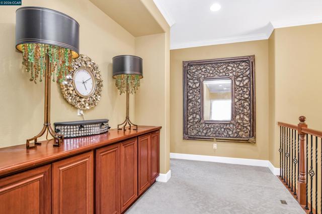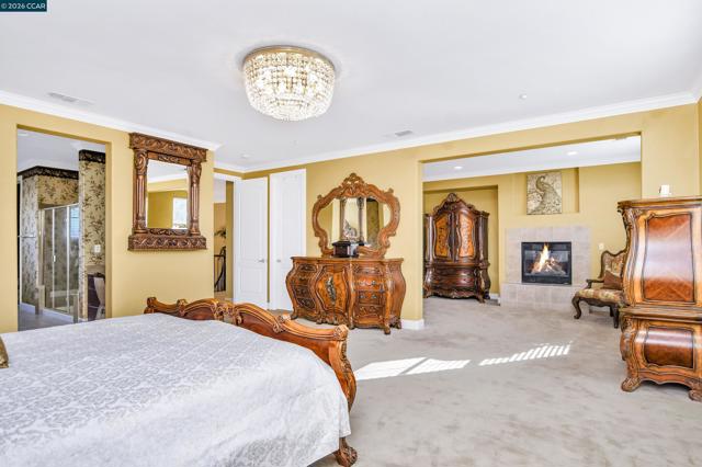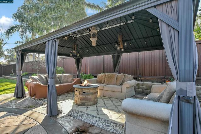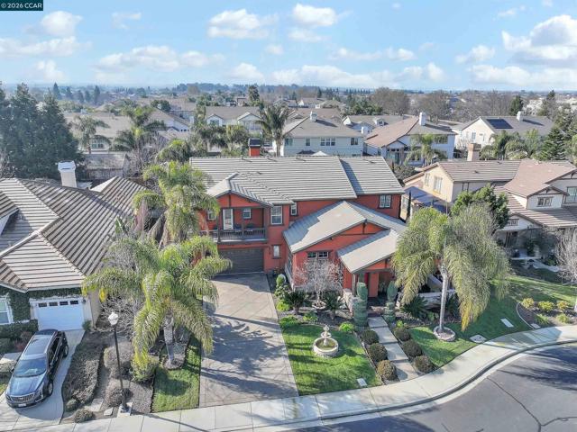 Exceptional residence in Granville Estates, one of Brentwood's most sought-after communities. Grand entry showcases soaring ceilings, dramatic curved staircase with wrought iron railings, and tile flooring throughout the main level. Gourmet kitchen features rich cherry cabinetry, granite countertops, stainless steel appliances, center island with breakfast bar, and flows seamlessly to spacious great room with fireplace and crystal chandelier. Multiple formal living and dining spaces ideal for entertaining. Expansive primary suite includes luxurious retreat with fireplace perfect for office or exercise space, two walk-in closets, dual vanities, soaking tub, and separate shower. Secondary bedroom offers private balcony access. Upstairs Jack-and-Jill bath connects two generous bedrooms. The resort-style backyard is the true showstopper featuring multiple covered gazebos with built-in lighting, stamped concrete patio, lush lawn, mature palm trees, built-in BBQ station, fire pit, and meticulously landscaped grounds—perfect for year-round California outdoor entertaining. Conveniently located near Slatten Ranch shopping and dining along the Lone Tree corridor with easy Highway 4 access for commuters. No HOA fees. This turnkey estate offers luxury, space, and an unparalleled lifestyle!