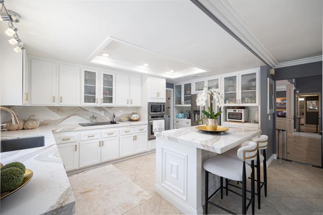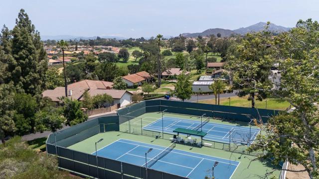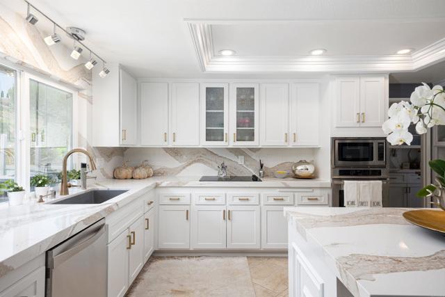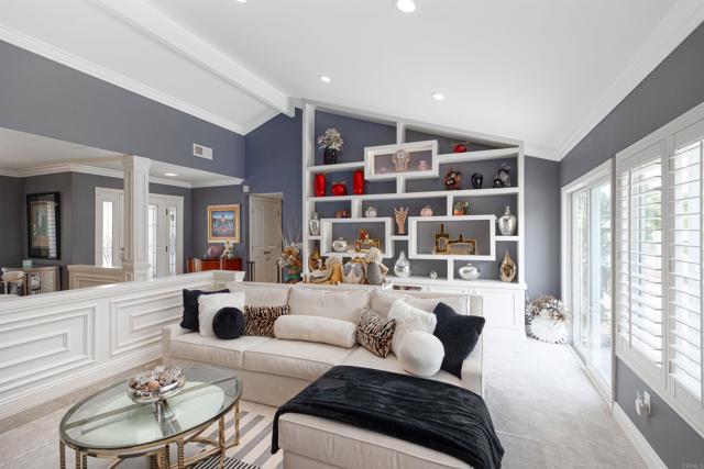 Discover this beautifully renovated single-story home tucked away on a quiet cul-de-sac in the highly sought after Oaks North 55+ community of Rancho Bernardo. Thoughtfully redesigned with high-end finishes, this home offers the perfect balance of style, comfort & effortless livability. Large windows flood the interior with natural light, while vaulted ceilings create an open, airy feel. Upon entry you're welcomed by a stunning floor-to-ceiling custom wall unit with integrated LED lighting-ideal for showcasing art & treasured pieces. A dramatic two-sided fireplace anchors the living, family & dining areas, adding warmth & architectural interest throughout the open-concept layout. The remodeled kitchen is a showpiece, featuring quartz countertops, SS appliances, custom cabinetry with decorative glass & designer hardware & an expanded butler's pantry & laundry area for exceptional storage & functionality-perfect for everyday living & entertaining alike. The primary suite offers a sophisticated retreat with designer paint selections, statement wallpaper accents, a custom closet system & an updated walk-in shower. Secondary bedrooms are currently configured to provide flexible space for guests, a home office or hobbies. Outside the tranquil space is perfect for entertaining with shaded sitting areas, privacy, mature fruit trees, gardening zone & elevated view perches. All new vinyl & glass fencing wraps the backyard to provide a secure haven for pets & comfort. Landscape has been totally redesigned with harmonious native drought tolerant plantings to create an architecturally sound & esthetic environment. Freshly epoxied flooring, EV charging station & added safe racks with additional cabinets enhance the oversized attached garage. Enjoy all that the community of Rancho Bernardo offers with nearby golf courses, workout center, pools, Bernardo Winery & farmers markets, tennis & pickleball courts. A home & community to treasure.