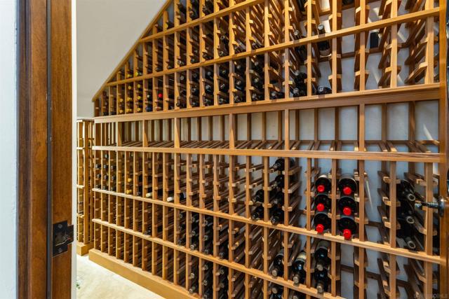 Located on a preeminent street within the Covenant of Rancho Santa Fe, this private gated estate sits on 2.5 acres of meticulously landscaped grounds by renowned designer Theresa Clark. Blending European elegance with Santa Barbara–chic style, the residence offers privacy, refined craftsmanship, and seamless indoor-outdoor living in the highly sought-after Roger Rowe School District. The home functions primarily as a single-level residence, with all main living spaces and four en-suite bedrooms—including the luxurious primary suite—on the first floor. The primary suite features a fireplace, custom walk-in closet, and direct access to a mirrored yoga studio/gym and outdoor areas. A single upstairs en-suite bedroom currently serves as an executive office with built-ins and panoramic views. Flooring is thoughtfully curated: Jerusalem stone tile in entryways and powder room, French pavers in the kitchen, marble in the primary bath, honed limestone in secondary baths, and pegged walnut throughout the remaining living spaces. Outdoors, travertine and river rock reinforce the indoor-outdoor connection. Doors are solid alder by Old World Doors. Custom cabinetry by French Tradition—cherry in the kitchen, mahogany in the living room, alder elsewhere—is finished with custom hardware. The chef’s kitchen features Taj Mahal quartzite and a professional appliance suite including Wolf, BlueStar, Sub-Zero, and Miele. Albertini tilt-and-turn windows provide abundant light and ventilation, with decorative iron grillework on front-facing windows. Pocket doors from the great room open to a covered loggia with fireplace, outdoor kitchen, and a 40-foot infinity-edge pool. Additional highlights include a 700+ bottle temperature-controlled wine cellar, gym with beverage refrigeration, Sonos sound system, 14.25kW SunPower solar, EV charging, and access to the Covenant’s private trail network—delivering an unmatched Rancho Santa Fe lifestyle.