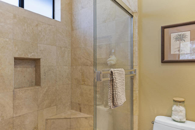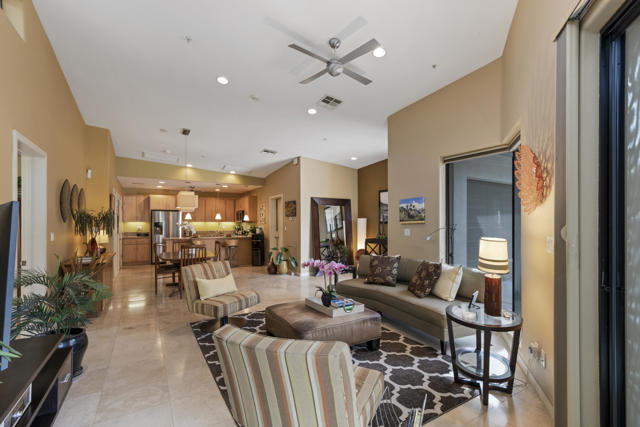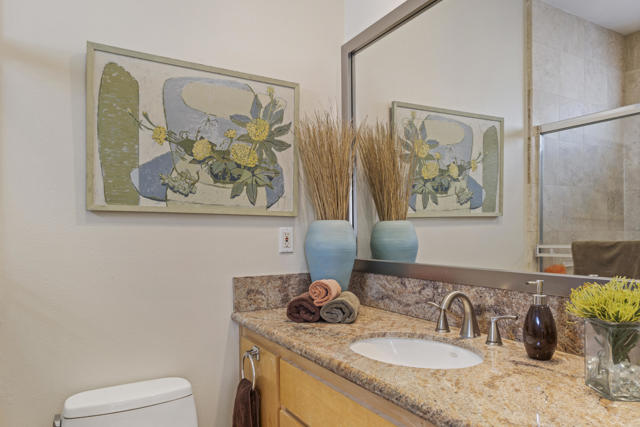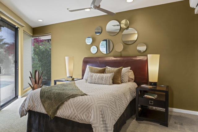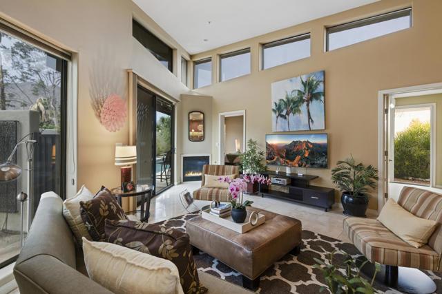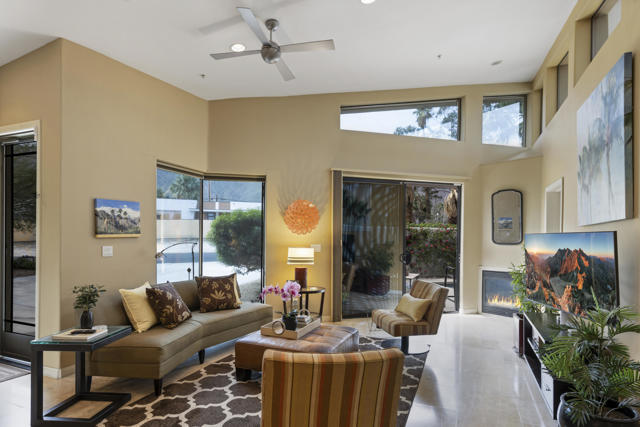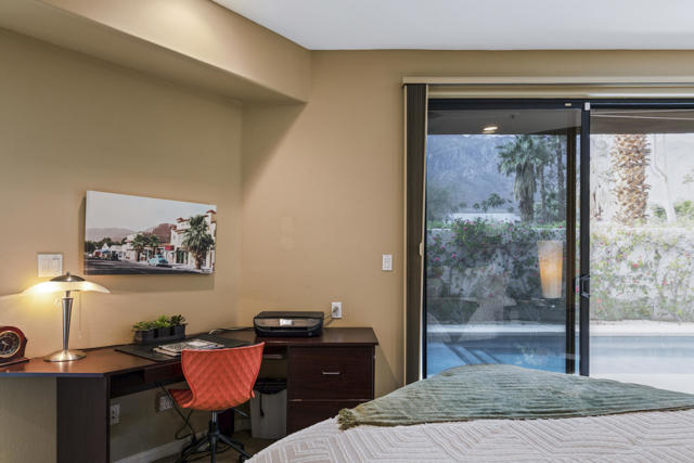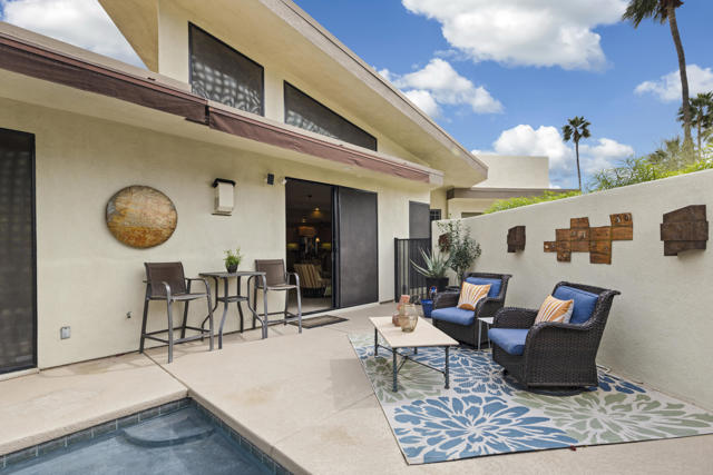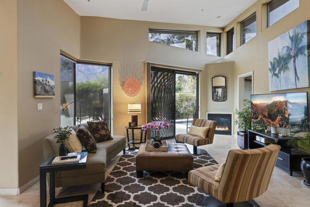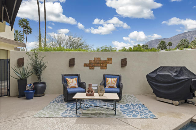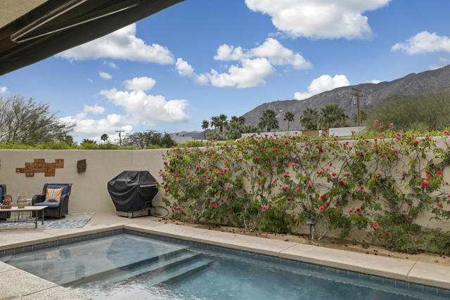 Bright and airy 2-bedroom, 2.5-bath home offering privacy and tranquility in the highly sought-after Chino Canyon neighborhood of Palm Springs. Designed to embrace the best of indoor-outdoor living, this residence features a spacious great room with fireplace, soaring cathedral ceilings, clerestory windows that highlight its mid-century modern character, and sliding glass doors that open to a generous west-facing patio. The outdoor space is ideal for entertaining or relaxing, complete with a pool, beautiful landscaping and panoramic views of the San Jacinto Mountains. Retractable awnings enhance comfort on warm desert days, creating a true private retreat. The kitchen is thoughtfully appointed with granite countertops, stainless steel appliances, breakfast bar seating, and a large pantry for ample storage. The primary suite includes a walk-in closet and direct access to the backyard oasis. Both bedrooms feature en-suite bathrooms with luxury finishes and beautifully tiled showers, while a convenient half bath serves guests. Additional highlights include a laundry room connected to the two-car garage, extensive storage throughout the home and garage, recently repainted exterior, two added mini-split systems for enhanced efficiency, a tankless water heater, and updated window and door screens. The property shares one common wall and operates under a two-member HOA with low dues of $50 per month (or as mutually agreed). A rare opportunity to enjoy comfort, views, and classic Palm Springs style in an exceptional location.