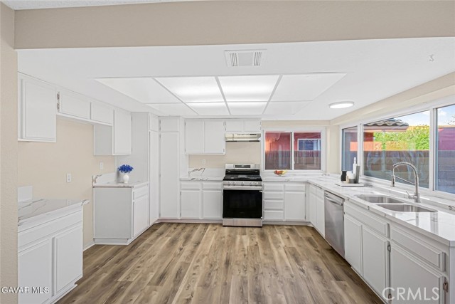 Fresh, modern paint inside and out immediately sets the tone for this fully remodeled West Lancaster home, delivering clean lines and a truly move-in-ready feel from the moment you arrive, while brand new LED lighting and updated plumbing fixtures add a crisp, contemporary finish throughout; the kitchen is completely brand new and designed to impress, featuring new countertops, updated cabinet hardware, stainless steel appliances, a new sink and faucet, and a layout that flows seamlessly into the attached dining area, making everyday living and entertaining effortless; brand new plank flooring runs throughout the entire house, tying together both living areas with a cohesive, durable, and stylish look that complements the home's modern upgrades; additional highlights include two separate living areas, central heat and air, a tile roof, newer vinyl windows and sliders throughout, and spacious bedrooms that provide comfortable room to spread out; the primary suite is a private retreat offering a walk-in closet, dual sink vanity, walk-in shower with tile surround, new faucets and toilet, and a private slider that opens directly to the back patio; the guest bathroom has also been fully updated with new LED lighting, a dual sink vanity, new faucets, and a new toilet; outside, the front yard shines with new grass, clean rock landscaping, and mature old-growth trees providing excellent natural shade, while the backyard features a concrete patio area ideal for relaxing or entertaining; all of this is tucked away on a quiet cul-de-sac street in an excellent West Lancaster location close to schools, shopping, and restaurants, making this fully remodeled home a rare offering that truly needs to be seen in person to appreciate everything it has to offer.