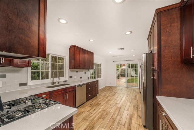 Nestled in a coveted South of the Boulevard enclave of Woodland Hills, this beautifully maintained 3-bedroom, 3-bath residence offers an exceptional lease opportunity in one of the area's most sought-after neighborhoods. Designed with an open-concept layout, the home features rich wood flooring throughout the main living areas, creating a warm yet refined atmosphere ideal for both everyday living and entertaining. The kitchen offers tile flooring, space for a breakfast area, and a sliding glass door that opens directly to the backyard—seamlessly blending indoor and outdoor living. All three bathrooms have been tastefully updated with modern finishes, while the generously sized bedrooms provide excellent closet space for added comfort and functionality. The private backyard is perfect for year-round BBQs, al fresco dining, or relaxed evenings under the Los Angeles sky. Ideally located just minutes from Gelson’s, Ralphs, The Village, Westfield Topanga, Costco, premier dining, boutique shopping, and convenient 101 Freeway access, this home offers the perfect balance of privacy, prestige, and accessibility—true South of the Boulevard living. Driveway parking available (no garage).