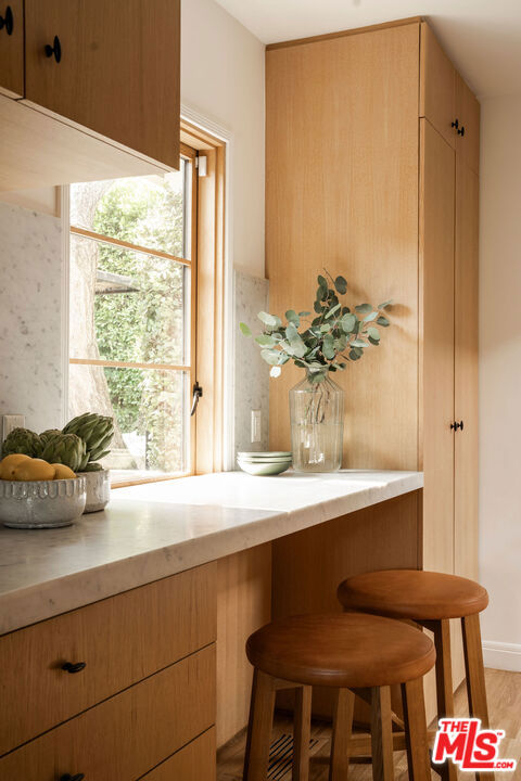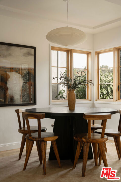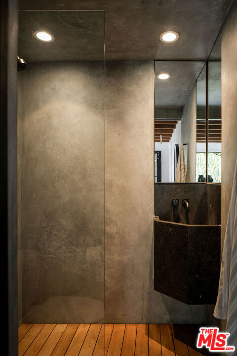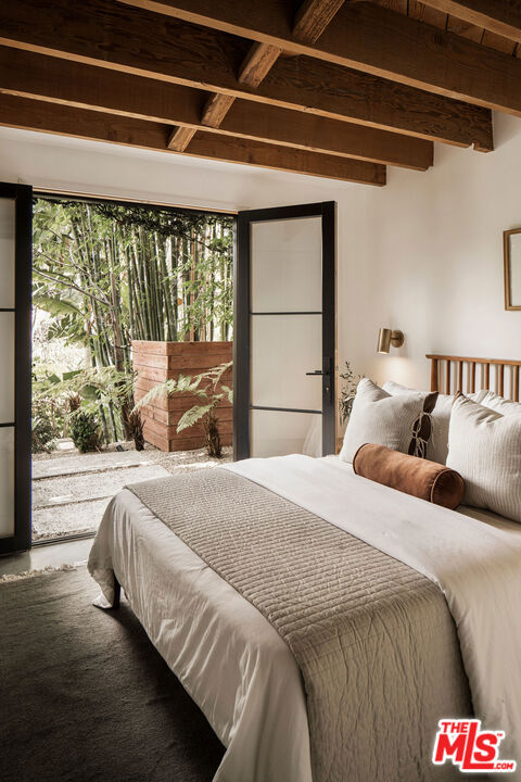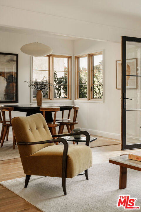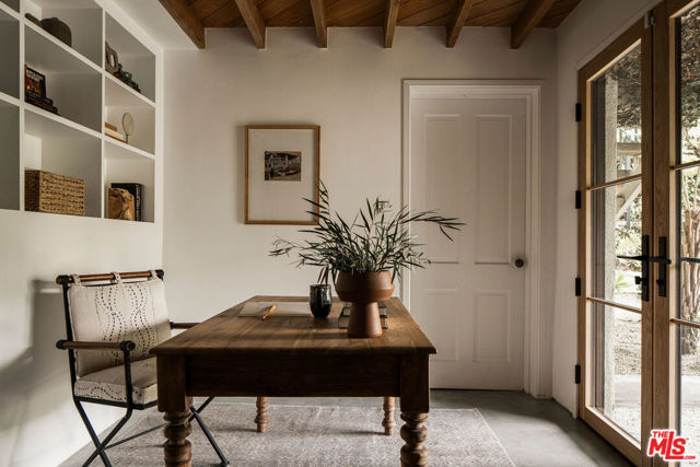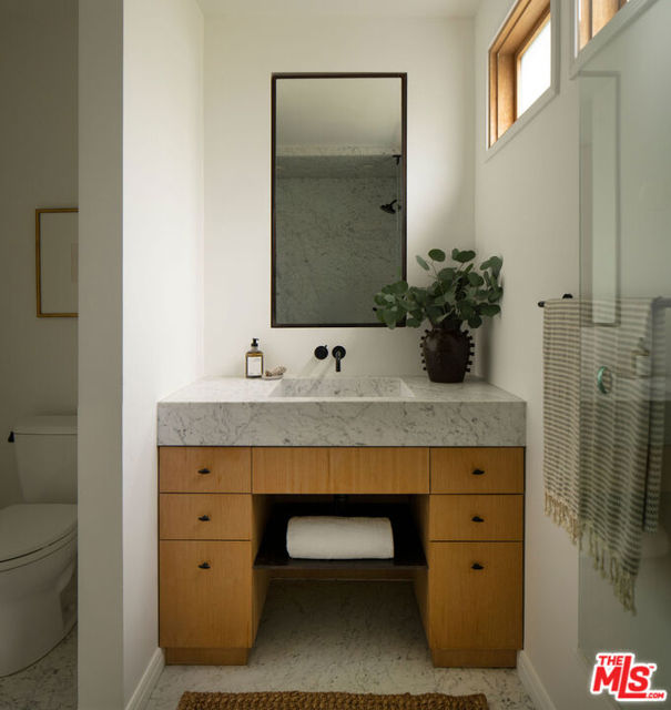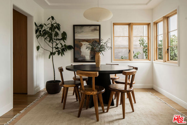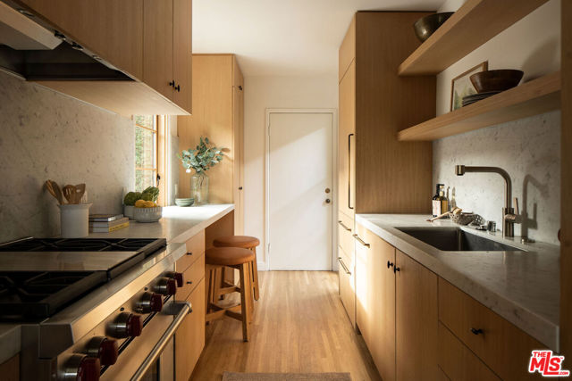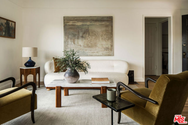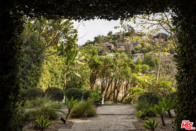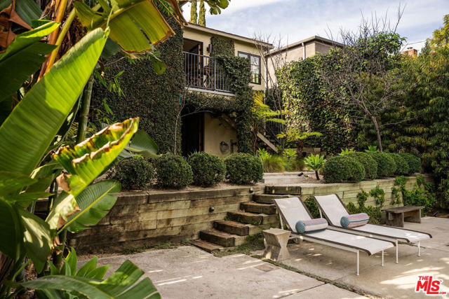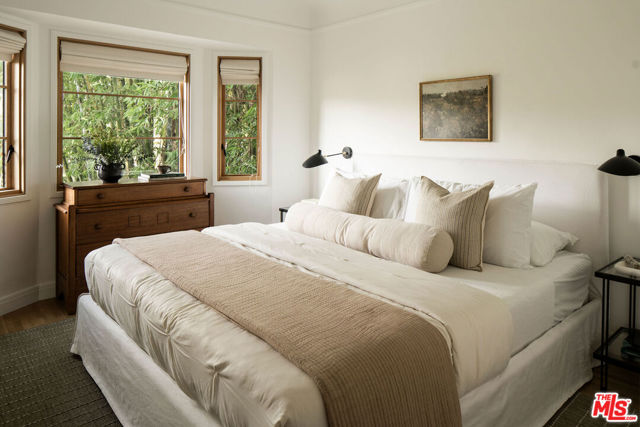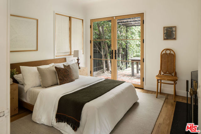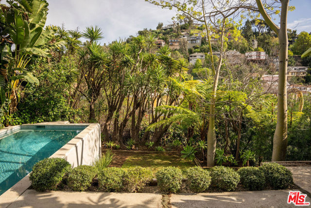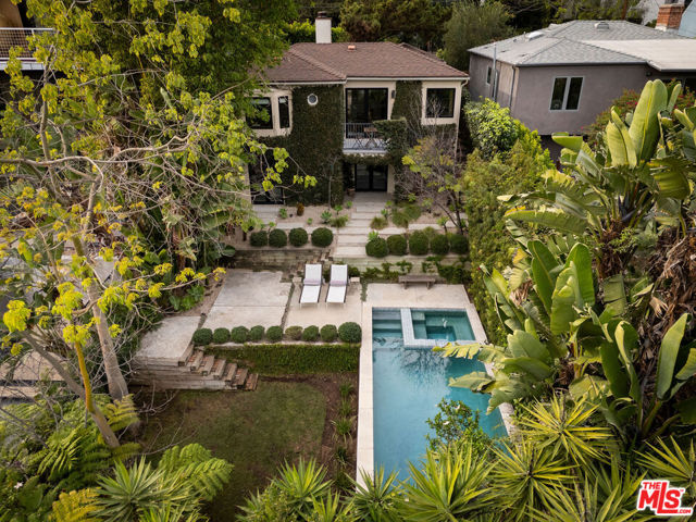 Perched in the Moreno Highlands, with breathtaking hillside views, the stunning home was renovated in collaboration with AD100 design firm Clements Design and landscape design firm Terremoto. Set moments from the Silver Lake Reservoir, the gated and fenced street-to-street property includes a 2 bedroom, 1 bathroom main home, a detached lower-level 1 bedroom, 1 bathroom suite with an office, and a terraced yard with pool and spa - an idyllic lakeside retreat. Through the private, hedged front gate, a romantic courtyard with a stone pathway and curated landscaping greets each entrant. A vine-laden pergola frames the outdoor dining area, and built-in seating invites lounging and home entertaining, the first of many indoor/outdoor moments that the property offers. Inside, find the main living area, with cascading light and striking hillside views, showcased through stunning wood-clad windows. Windowed French doors open to a balcony overlooking the terraced yard and pool below. Recently refinished hardwood floors run throughout the main home. The dining room sits between the living room and kitchen, anchored by a new Noguchi chandelier and corner wood-framed windows allowing in abundant natural light. The galley kitchen blends refinement and function, featuring custom oak cabinetry, marble countertops and backsplash, a Franke sink, and a top-tier appliance suite that includes a Wolf gas range and oven, a Sub-Zero refrigerator, and a Miele dishwasher. The countertop extends to the end of the kitchen, featuring a quaint barstool seating area with windows overlooking the front courtyard a perfect moment to enjoy morning coffee or work from home. The kitchen opens directly to the one-car garage, which includes a new garage door and built-in storage. Two bedrooms occupy the main level and share a chic hallway bathroom with a marble-topped vanity, discreet built-in storage, and a spa-inspired bathing area. The primary bedroom features linen Roman shades, a walk-in closet with built-ins, and a charming porthole window. The front bedroom opens to the courtyard through French doors and includes a cozy fireplace with integrated storage cabinetry and a built-in media nook. Downstairs, find a detached studio space with exposed-beam ceilings and two rooms for use as a guest suite, home office, gym, or recreation room. The downstairs bathroom features a slatted wood shower floor, a marble corner sink, and Roman clayfinished walls. A dedicated laundry room with storage completes this level. Outside, the idyllic, tiered backyard unfolds across three distinct levels, with a grassy lawn at the lowest tier, a central pool deck, and an upper terrace perfect for lounging or dining, surrounded by intentional plantings of succulents, rounded boxwoods, and podocarpus hedging for privacy and peace. The striking pool with built-in spa allows for a swim against the backdrop of the Silver Lake hills. The property is situated in the heart of Silver Lake, blocks from esteemed restaurants and shops such as Botanica, L&E Oyster Bar, Lamill Coffee, and Sapphire Pilates, as well as the Silver Lake Reservoir walking path. This offering represents the rare opportunity for privacy and refined living in the heart of LA's most sought-after neighborhood.