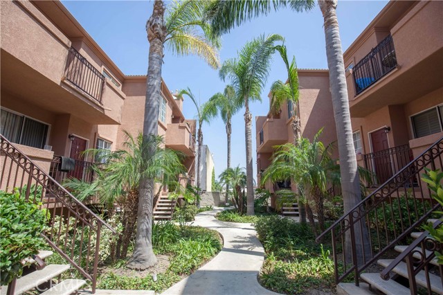 Beautiful 3 bedroom, 2 bath condo nestled in one of the best locations in the community! This tranquil end unit has an east facing view overlooking the beautiful resort like pool and spa area with palm trees and lush tropical landscaping. Kitchen is modern and sleek featuring beautiful quartz counters, ample cabinet space and appliances are included with newer stainless steel refrigerator. Large living area features custom paint, engineered wood floors, and attached private patio overlooking the pool is a great place to relax and entertain. Primary suite features engineered wood floors, 2 full sized closets, and a full bath. Convenient interior washer & dryer hook ups. Detached two car tandem garage is a great size with plenty of storage space.