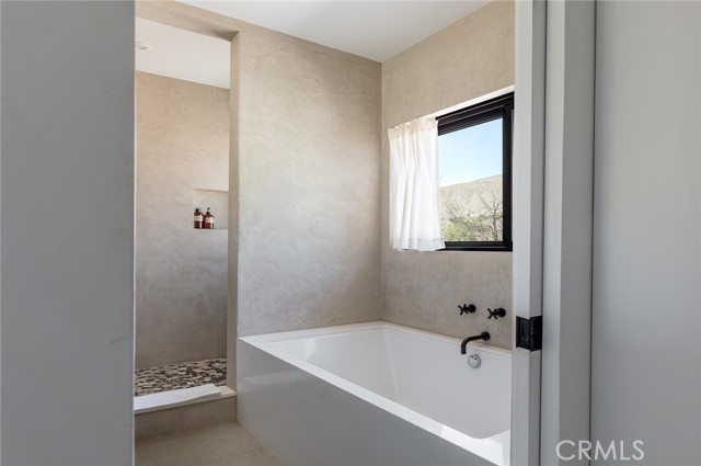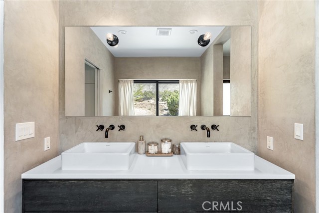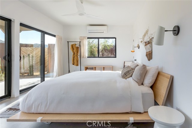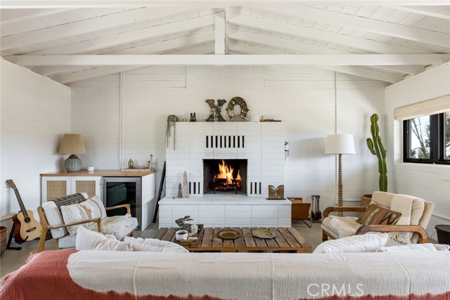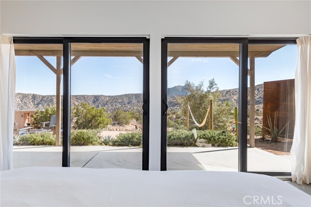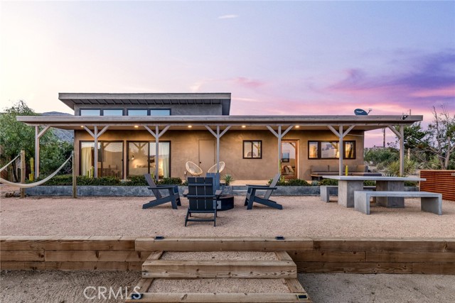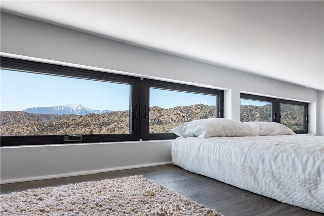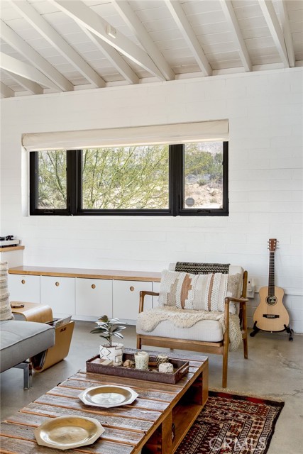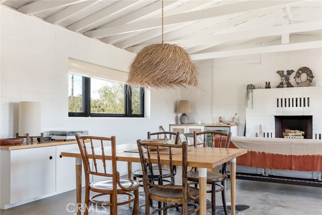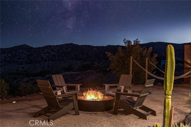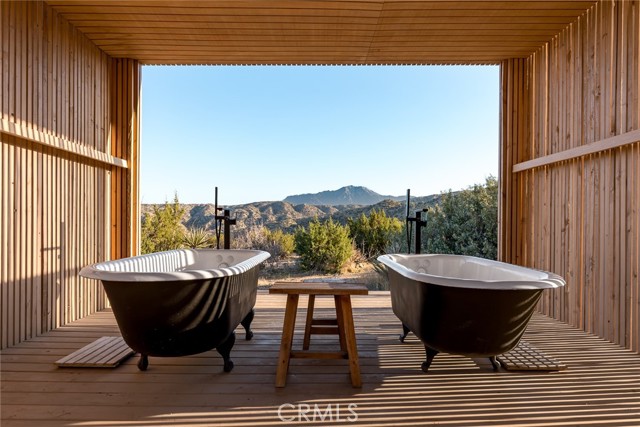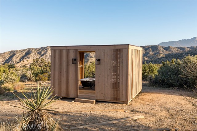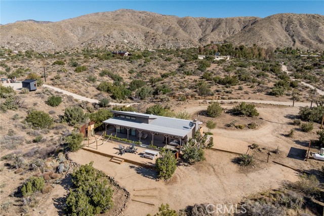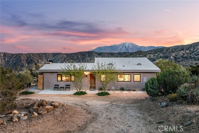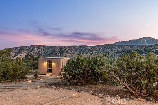 Dramatic mountain views envelop you from all directions in this artist-designed mid-century retreat spanning 5 serene acres under the majestic backdrop of Mt San Jacinto. The original 1959 brick cabin serves as an open concept living & dining area with soaring exposed beam ceilings, a cozy wood burning fireplace, built-ins, and a modern kitchen complete with quartz countertops, new copper plumbing, and a clever hidden under-counter fridge. A thoughtfully curated 2022 renovation introduces a chic new primary bedroom, oversized bathroom, bonus sleeping loft, and mini splits for climate control. The generously sized bedroom features a walk-in closet and built-in office nook, punctuated by a wall of glass sliders inviting you to take in the striking outdoor panorama. Down the hall you’ll find a hidden stackable washer & dryer and a spa-like bathroom with venetian plaster, dual sinks, a soaking tub, a shower room, and a separate water closet. A ladder opens to a secret upstairs 300 sq ft sleeping loft with more impressive views, making a delightful guest bunk or a quirky clubhouse for the kids. A 384 sq ft covered outdoor patio spans the rear of the home, leading to an open-air lounge and dining area with a gas grill, propane fire pit, and built-in hammocks to unwind under the stars. Follow the professionally landscaped path down to the most instagrammable moment of them all - a bespoke wooden bathhouse where 2 vintage clawfoot tubs beckon you to enjoy a hot soak framed by yet another incredible view. An original 1968 Silver Streak trailer sits on the side of the property, serving as a fabulous potential guest space, clubhouse, or home office. Ideally situated less than 2 hours to LA, 15 minutes to Palm Springs, 20 minutes to Joshua Tree National Park, and surrounded by 154,000 acres of publicly accessible canyons, preserves, white waters, trails, and mountain peaks of the Sand to Snow National Monument, this property is the perfect home-base for everything from romantic getaways to family adventures. Sold turnkey so you can grab your suitcase and move right in, or take over the “guest favorite” airbnb account to start generating short term rental income right away. An adjacent buildable 5 acre parcel is available to purchase separately to create your own 10-acre multi-parcel dream compound.