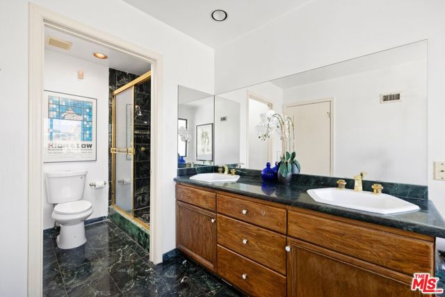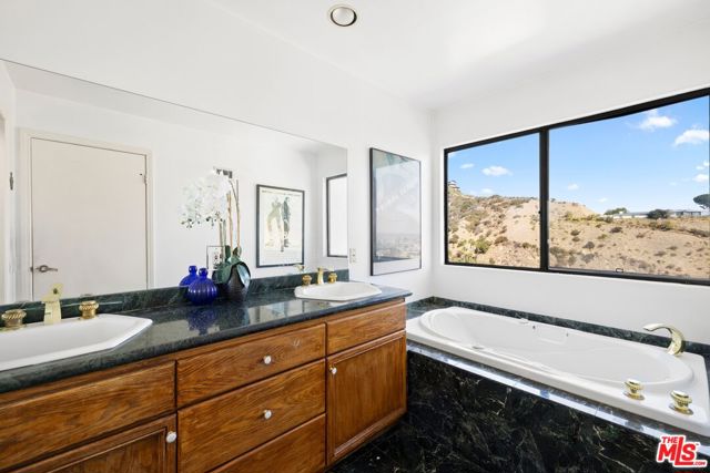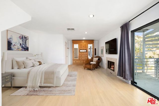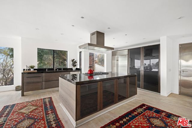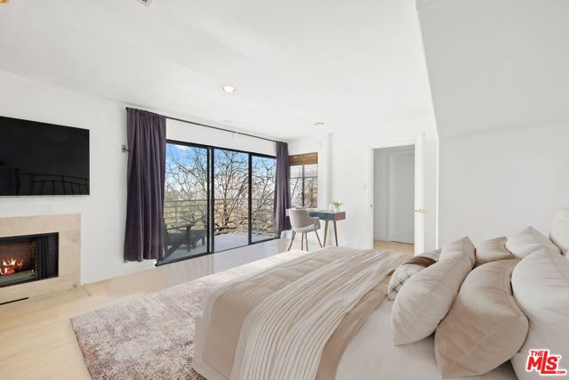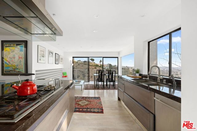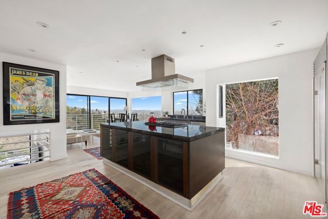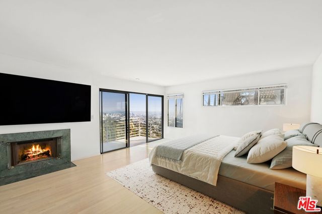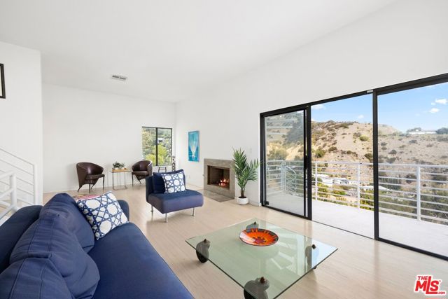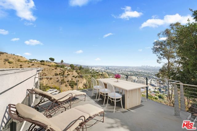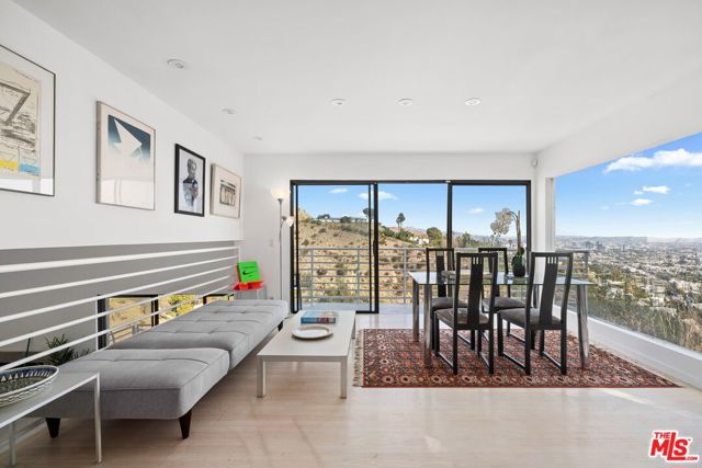 Located on coveted Hillside Avenue in the Hollywood Hills, this 3-bedroom, 3.5-bath multi-level architectural home offers sweeping jetliner views and a refined blend of contemporary design and modern comfort. Spanning 2,547 square feet, the residence captures panoramic vistas from the canyon to the Los Angeles skyline through expansive southeast-facing glass walls that flood the interiors with natural light. The open-concept layout features a gourmet kitchen with custom cabinetry, marble countertops, a center island, and premium appliances including a Wolf range, Sub-Zero refrigerator, and Viking stove. The dining area opens to a spacious balcony ideal for enjoying unobstructed city views. The living room includes a fireplace, wet bar, and additional balcony. The upper level hosts a luxurious primary suite with a spa-like bath, jetted tub, walk-in closet, fireplace, and private balcony, along with a versatile bedroom or office with en-suite bath. A rooftop deck crowns the home, perfect for entertaining or relaxing. The lower level offers a second primary suite with en-suite bath, fireplace, private balcony, and nearby laundry room. Additional features include a tankless water heater, dual-pane windows, central air conditioning, a custom Italian spiral staircase, an attached one-car garage, and ample street parking. Minutes from hiking trails, West Hollywood dining, and the iconic Chateau Marmont, this fully furnished residence delivers exceptional architecture, location, and views.