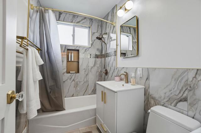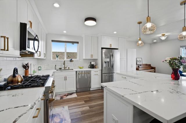 Stunning fully remodeled home with a legal second unit and iconic city views. The upper-level features 3 bedrooms, while the permitted lower-level 1-bedroom, 1-bath unit offers a private entrance, kitchenette, entertainment space, and rear yard access ideal for rental income, guests, or multigenerational living. Enjoy sweeping views of the Salesforce Tower, City Hall, and McLaren Park. The main level showcases a 2023 open-concept kitchen with quartz countertops, dining area, and premium stainless steel ZLINE appliances, including a 6-burner Hybrid Fuel range, hood, oven, refrigerator, and dishwasher. Luxury vinyl flooring and recessed lighting enhance both levels. Bathrooms were fully remodeled in 2023 with Vovo toilets, designer tile, updated vanities, and tiled shower and tub surrounds. Energy-efficient upgrades include fully owned solar (approx. $100/month electric including HVAC), double-pane windows (2023), new electric furnace, A/C and ductwork (2024), electric water heater (2024), 200-amp panel (2024), and double electric garage doors (2022). Fresh interior and exterior paint (2025), new fencing and gates (2024), Ring camera system, and included washer and dryer complete this move-in-ready property in a prime location with breathtaking views.